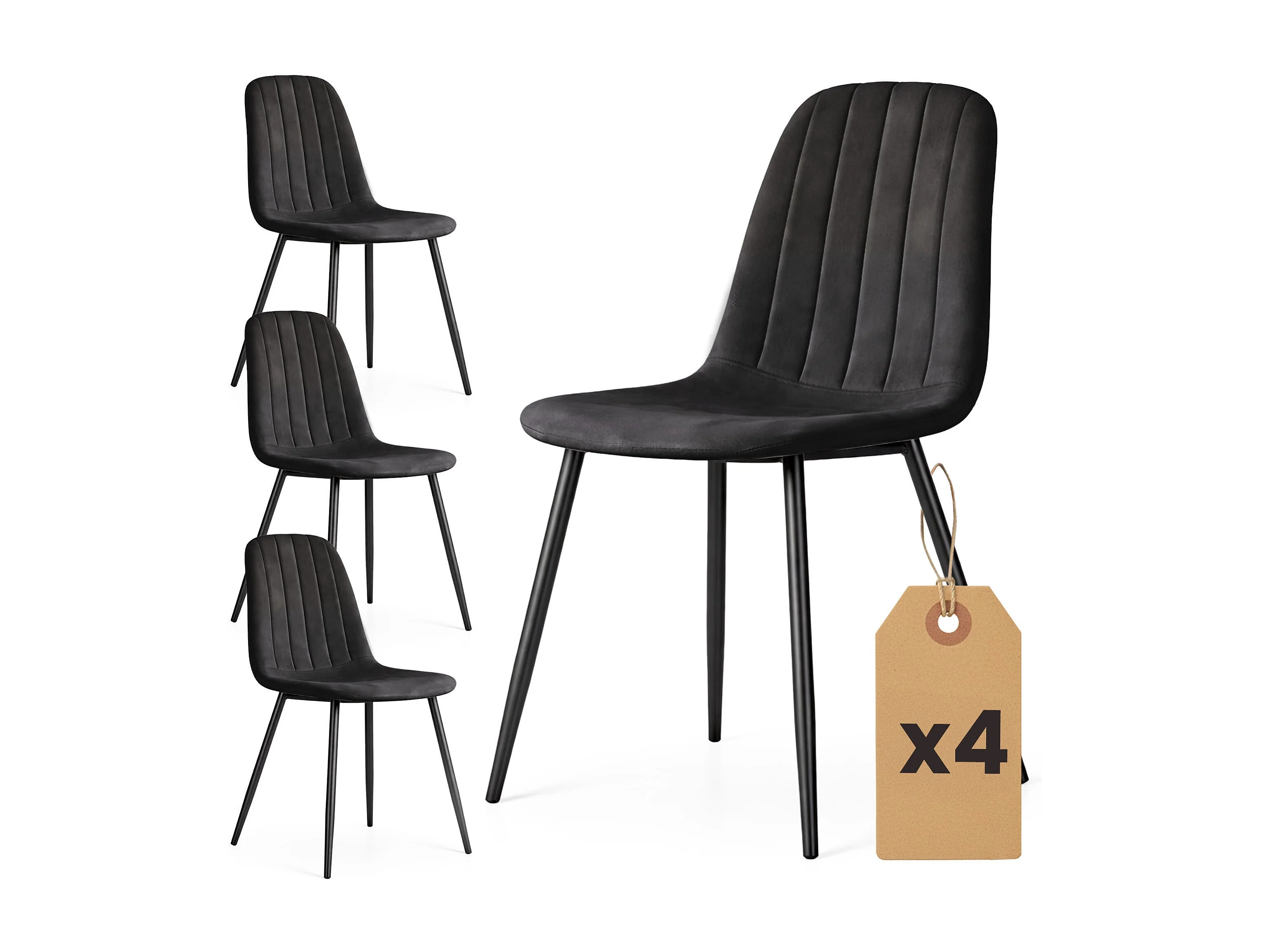 4er Set Samt-Polsterstühle, gesteppt LUMO Schwarz mit schwarzen Beinen