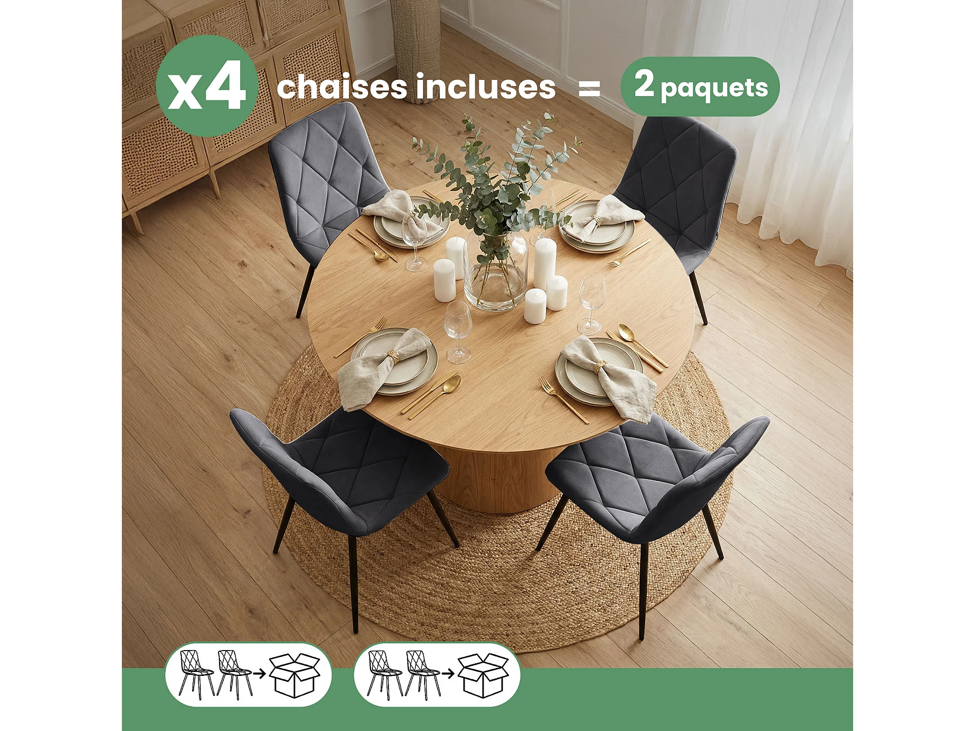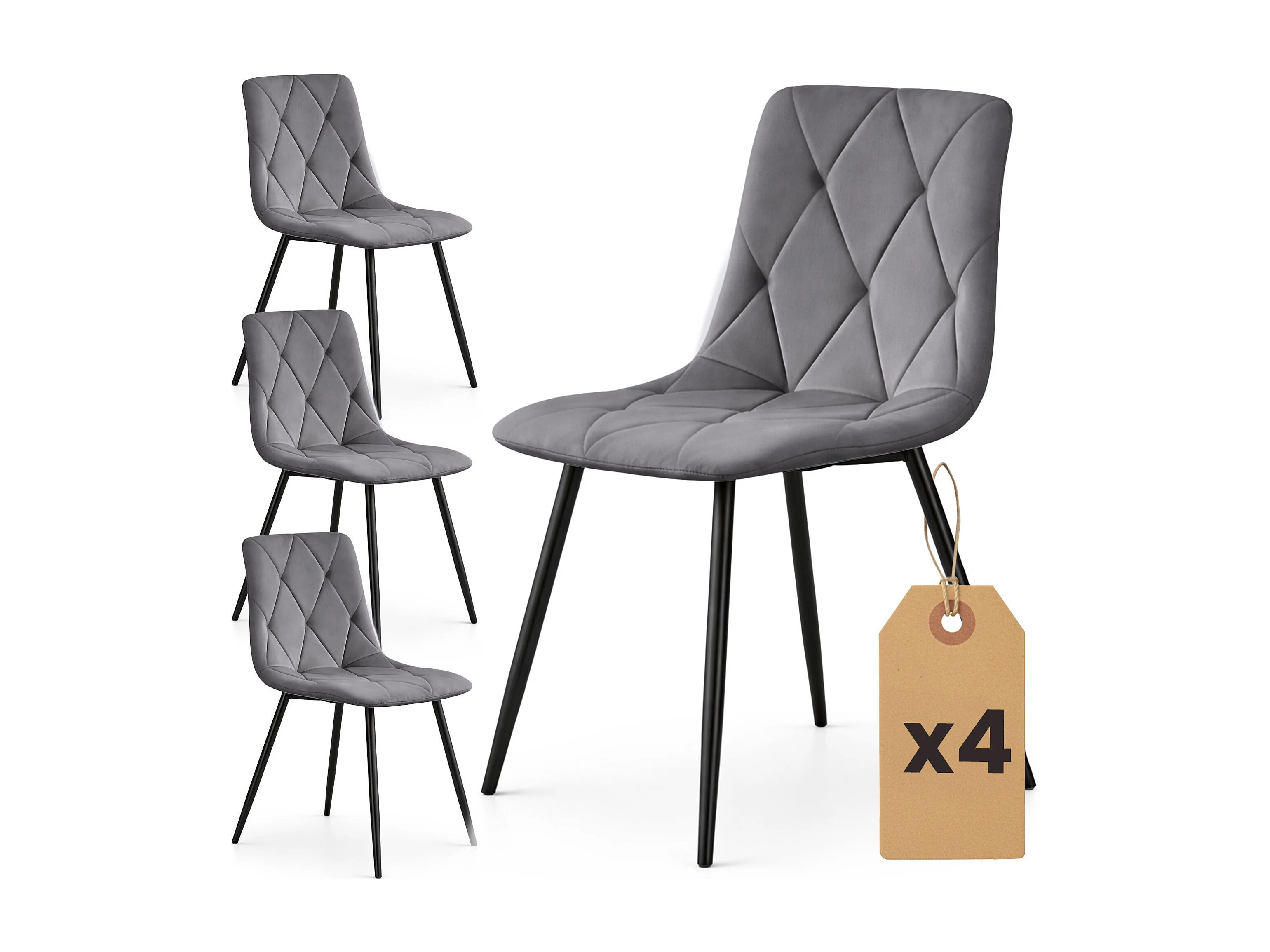 4er Set Samt-Polsterstühle, gesteppt MILO Dunkelgrau mit schwarzen Beinen