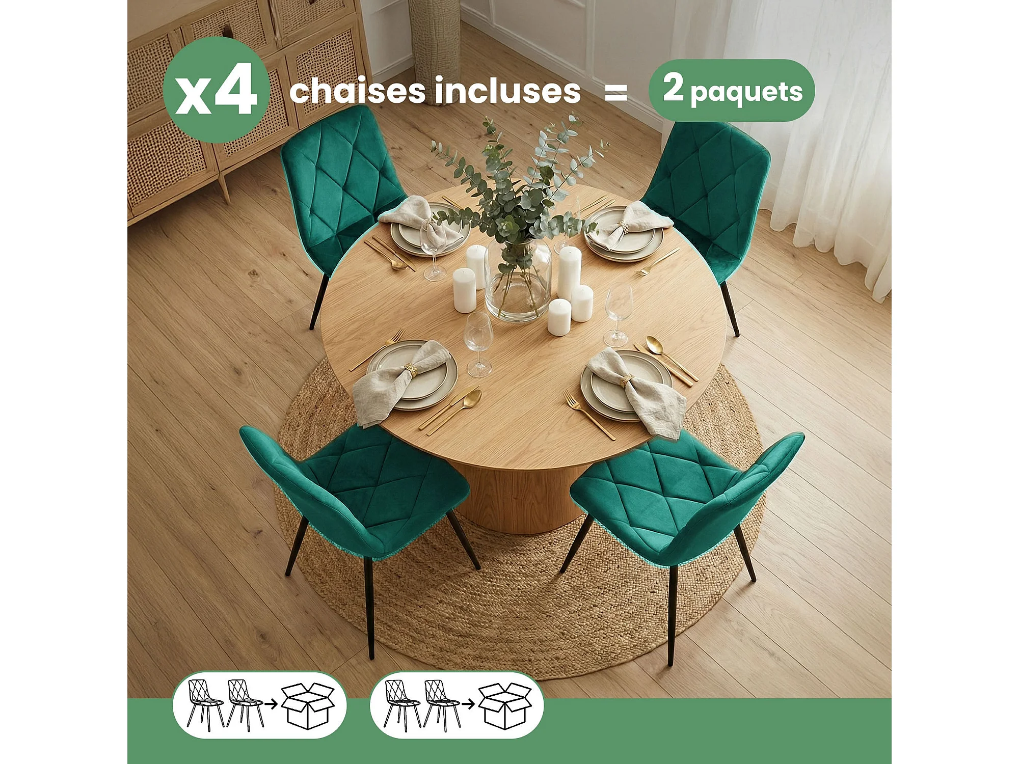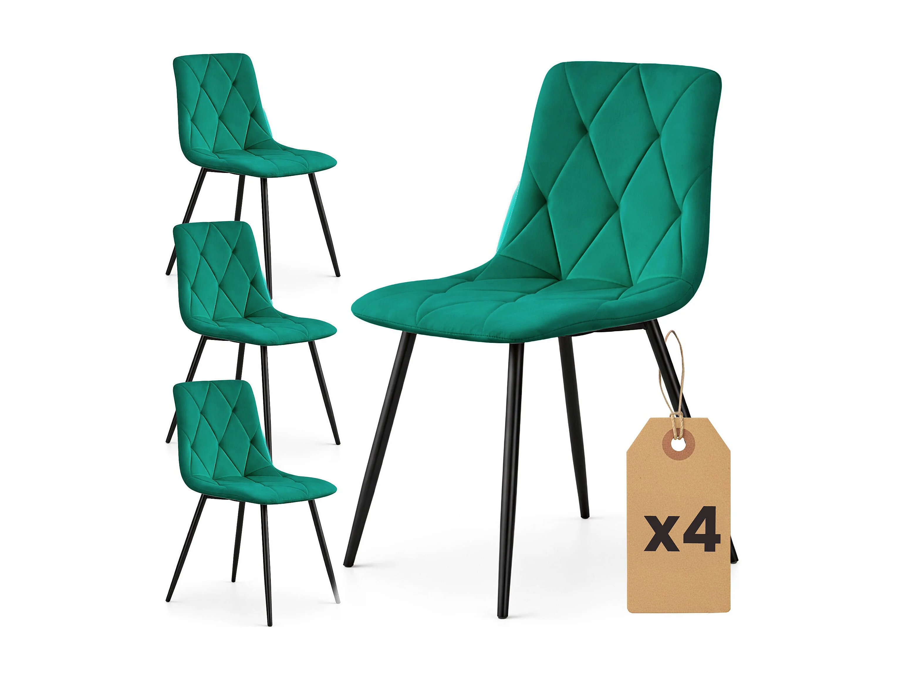 4er Set Samt-Polsterstühle, gesteppt MILO Flaschengrün mit schwarzen Beinen