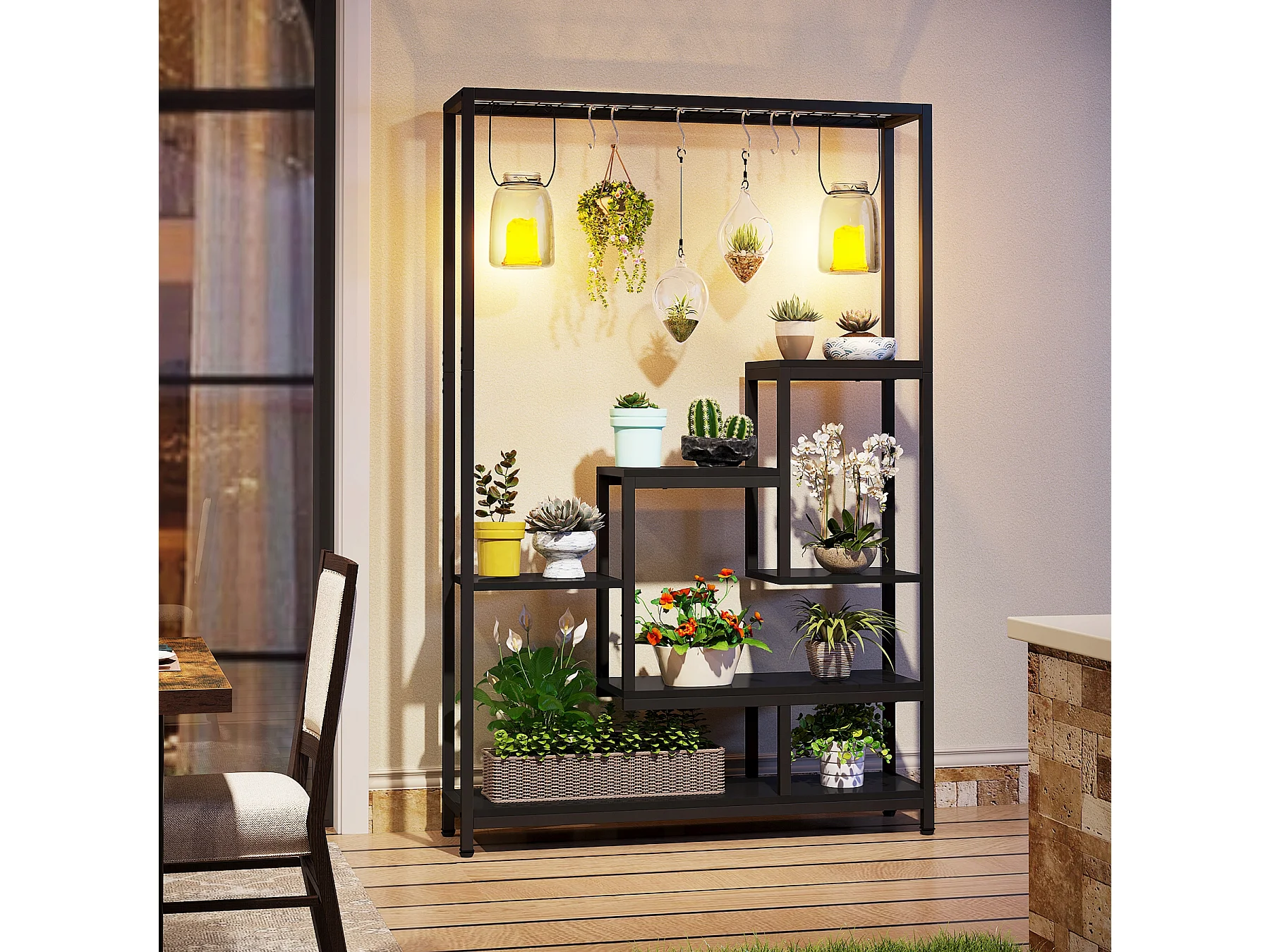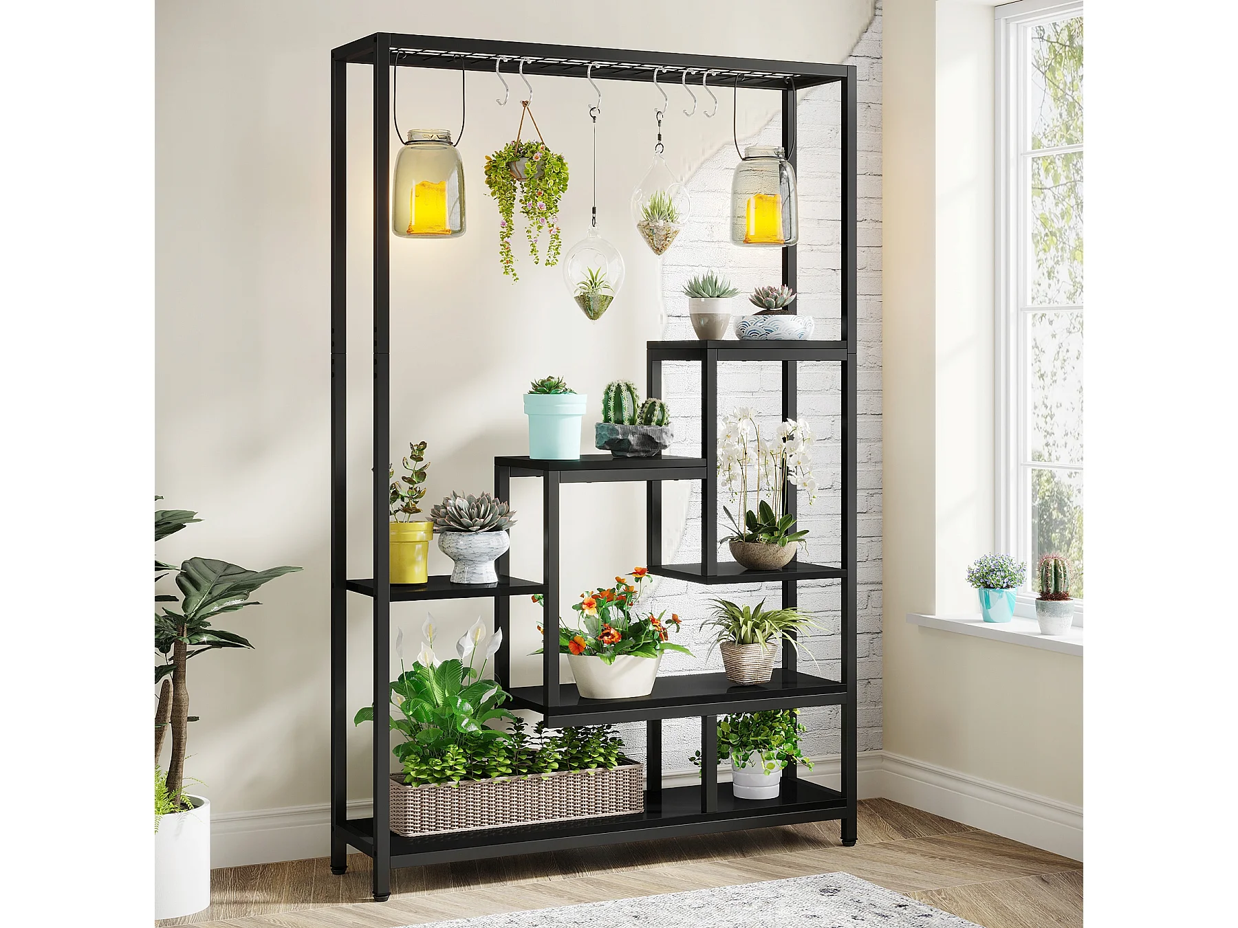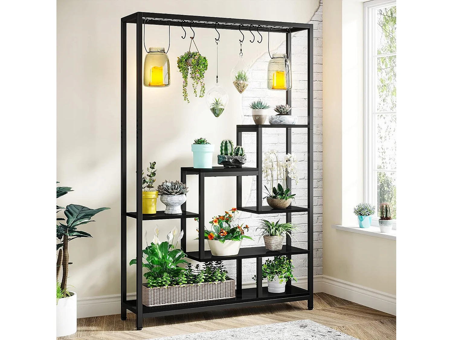5-Ebenen-Innenpflanzensupport - Große Metallregalwand von 180 cm mit 10 S-förmigen Haken - Schwarz