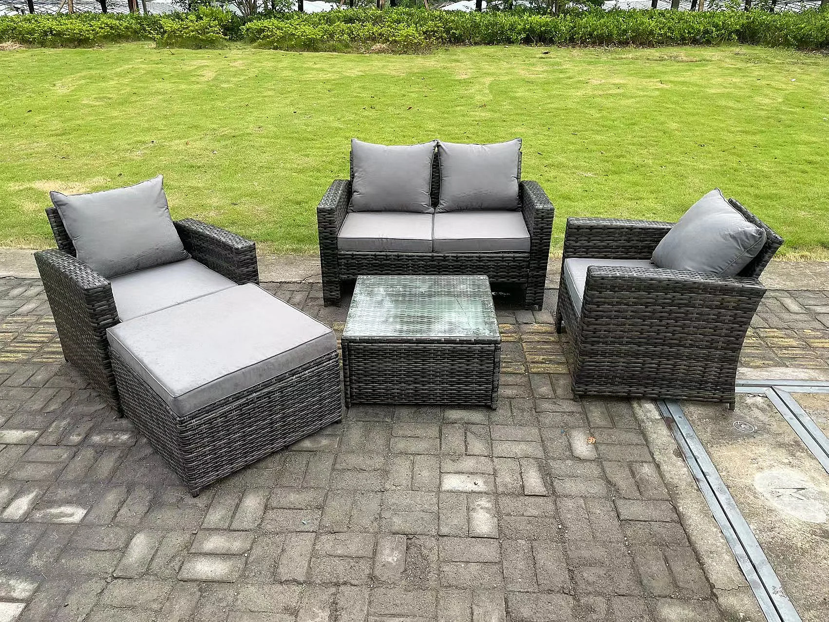 5-Sitzer Dunkelgrau Gemischt Hoher Rücken Rattan Sofa Set mit Quadratisch Couchtisch Gartenmöbel Sitzgruppe