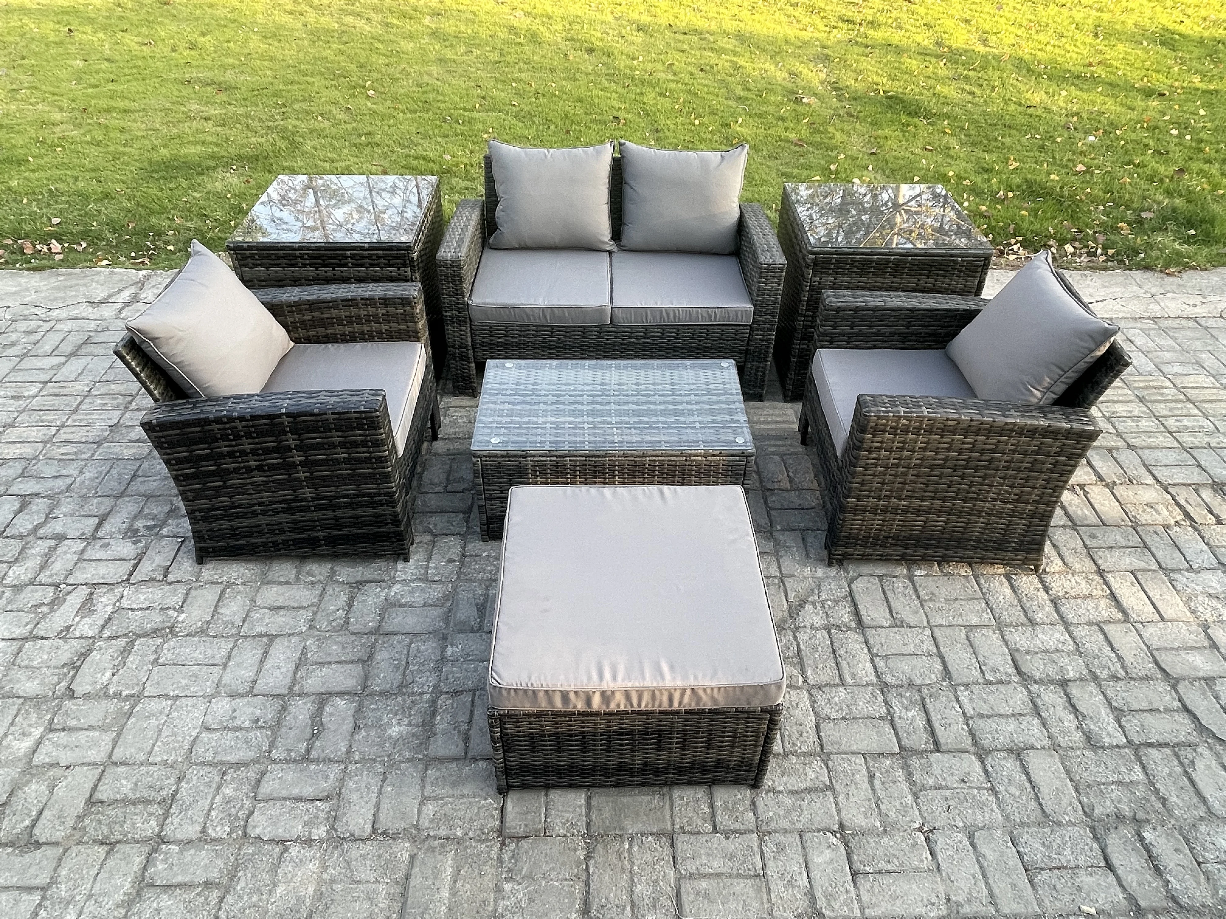 5-Sitzer Garten Lounge Set Polyrattan Gartenmöbel Set mit Rechteckig Couchtisch Doppelsitz-Sofa 2 Beistelltische Großer Fußhocker Dunkelgrau Gemischt