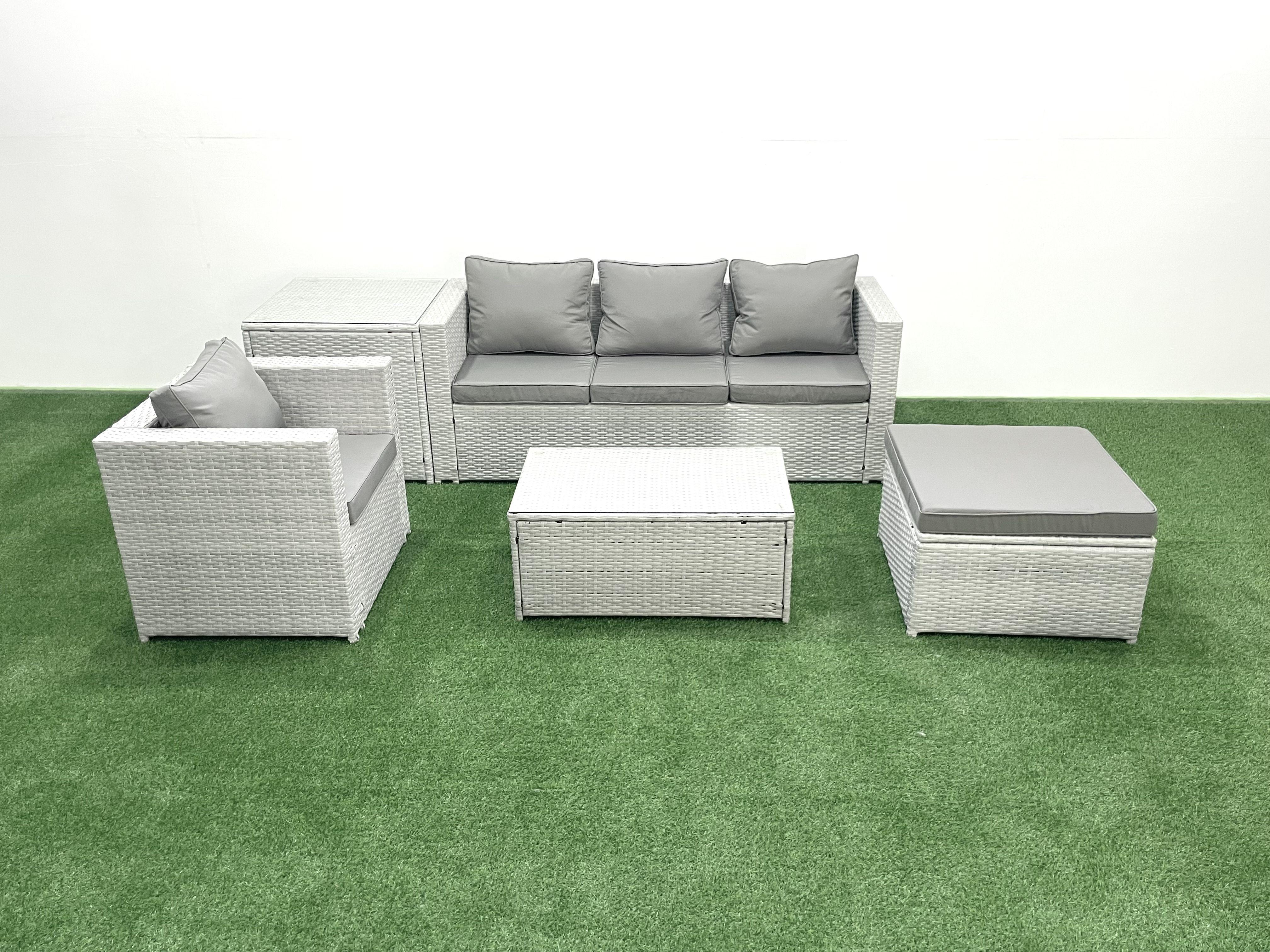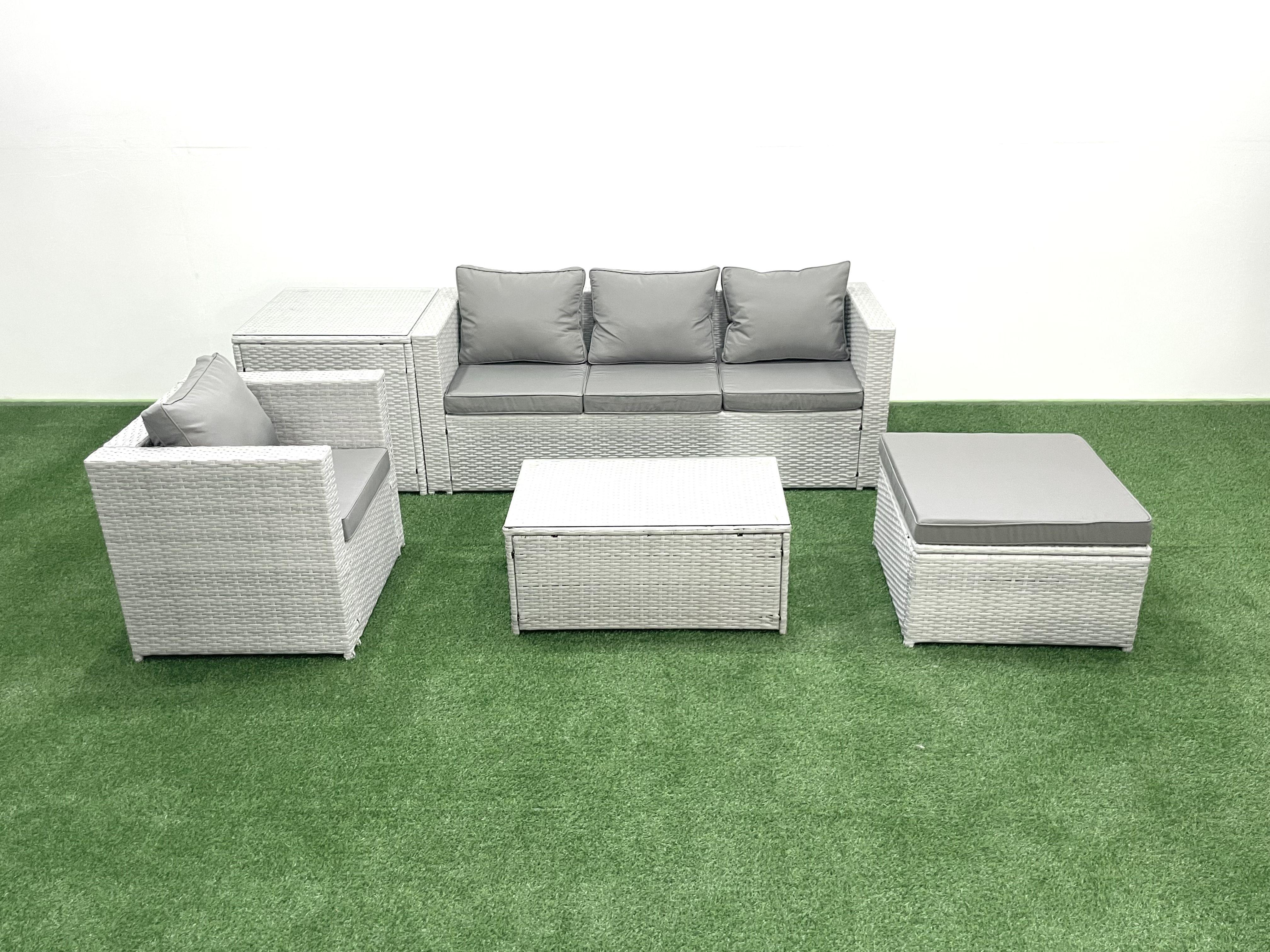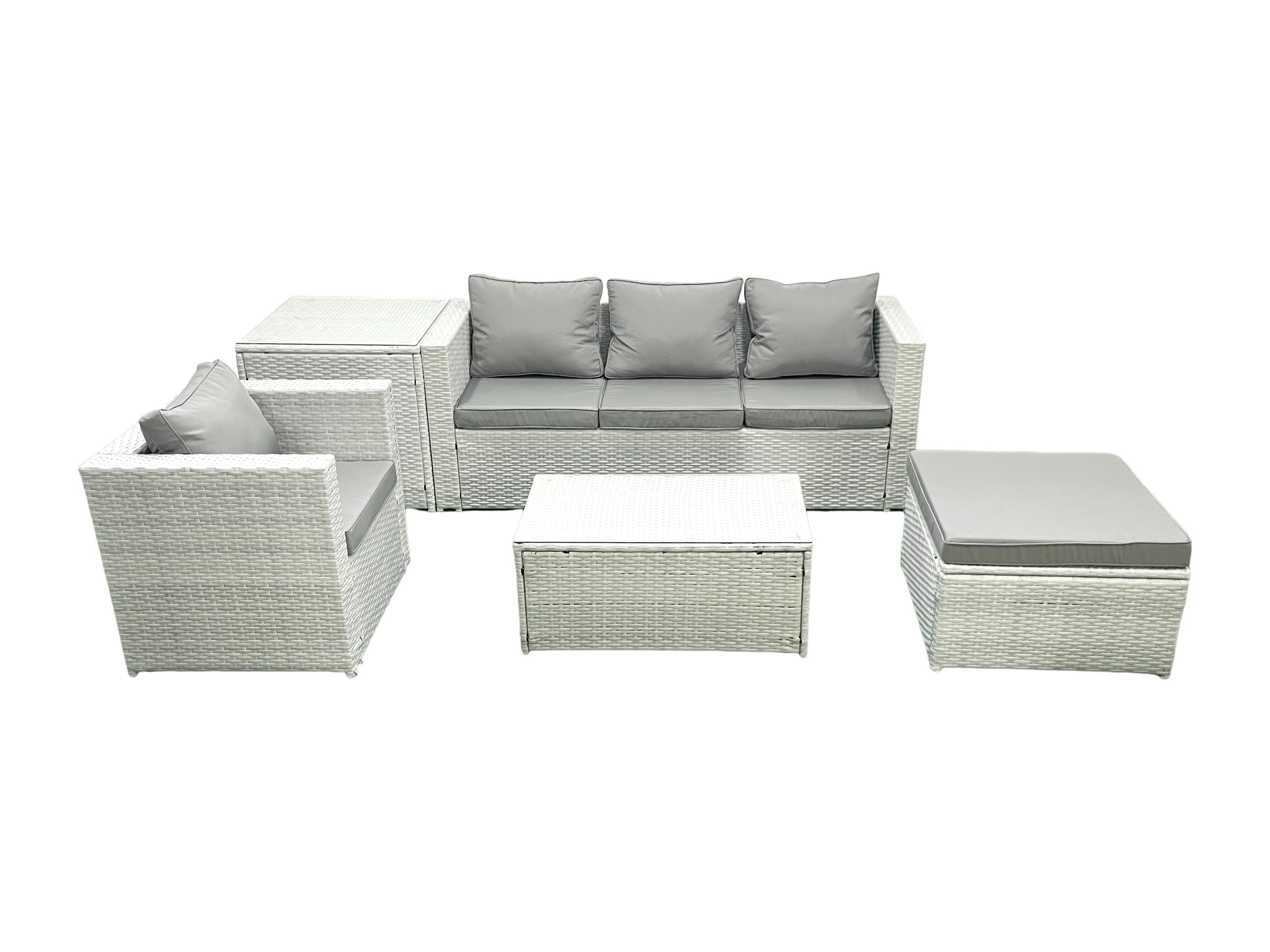 5 Stücke Rattan Gartenmöbel Set Garten Sofa Stuhl Couchtisch Set mit Beistelltisch 2 Großer Hockern Hellgrau gemischt