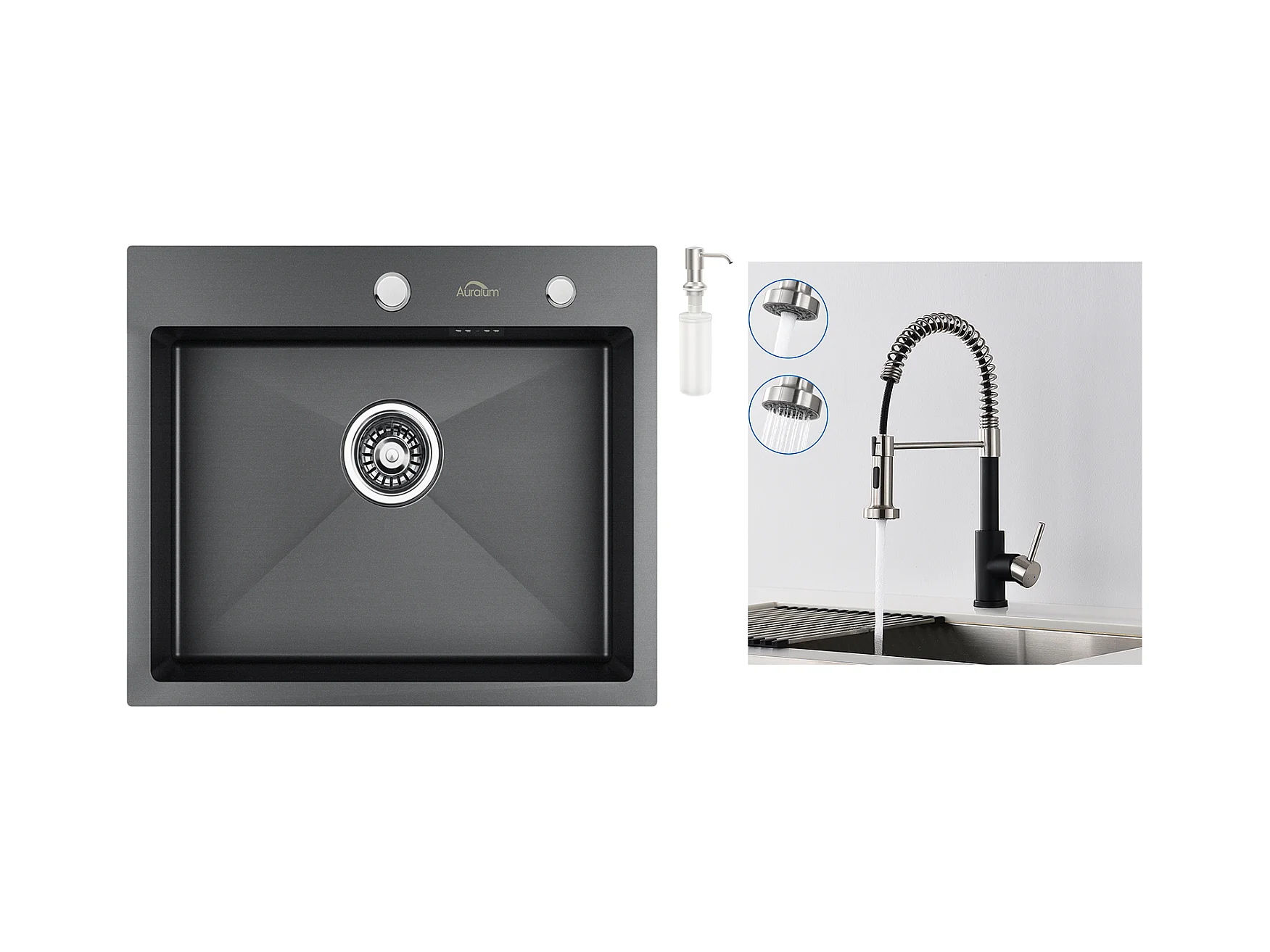 55 x 45 cm, schwarzes Einzelbecken, Küchenspüle + Feder-Küchenarmatur mit ausziehbarem Sprüher, 2 Modi, 360° schwenkbar, schwarz