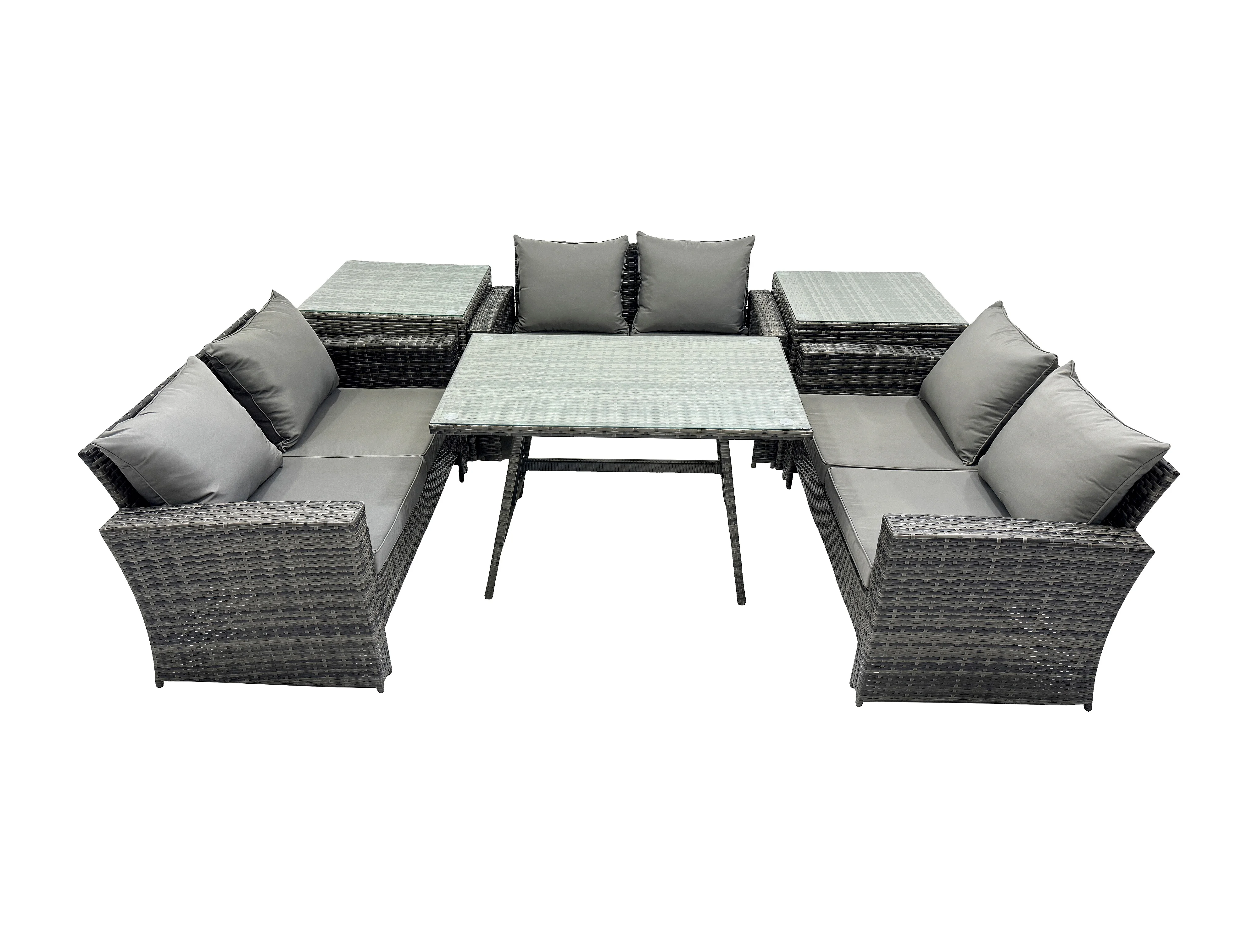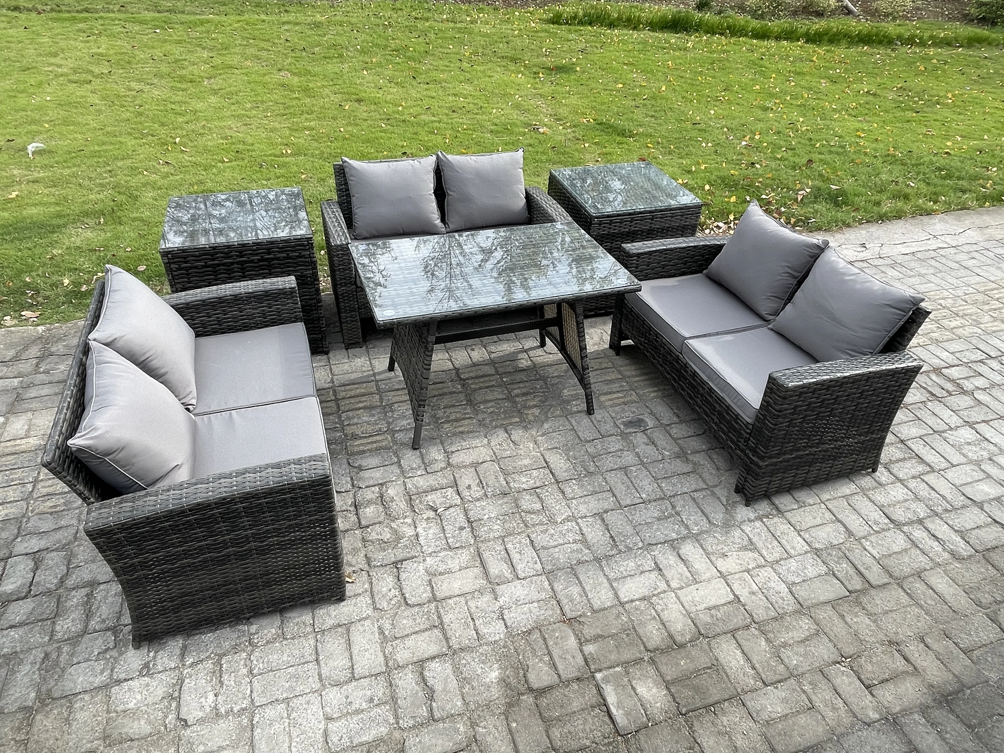 6 PCS Garten Sofa im Freien Set Polyrattan Gartenmöbel Set mit Rechteckiger Esstisch Loveseat Sofa 2 Beistelltischen Dunkelgrau Gemischt