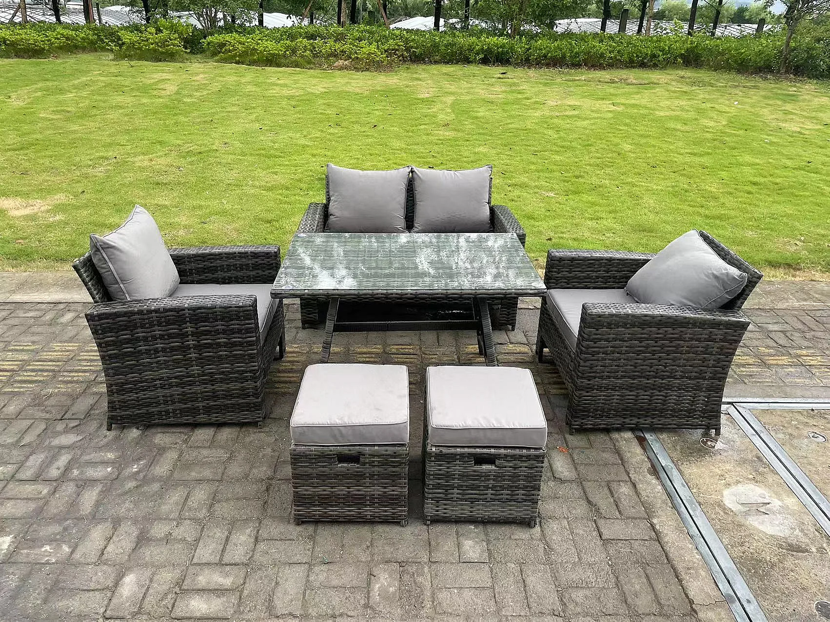 6-Sitzer Dunkelgrau Gemischt Hoher Rücken Rattan Sofa Esstisch Set Gartenmöbel Set mit 2 Hockern