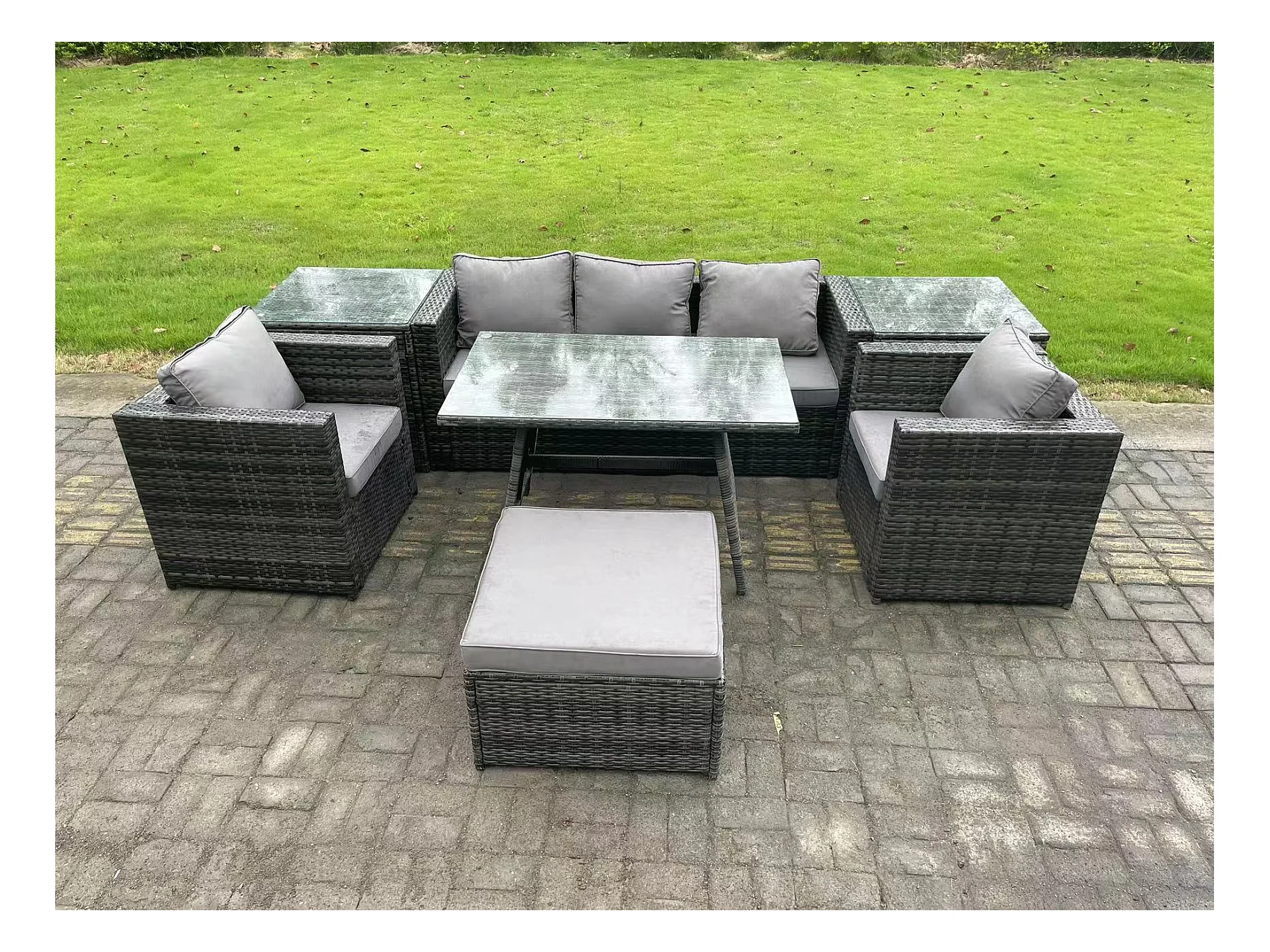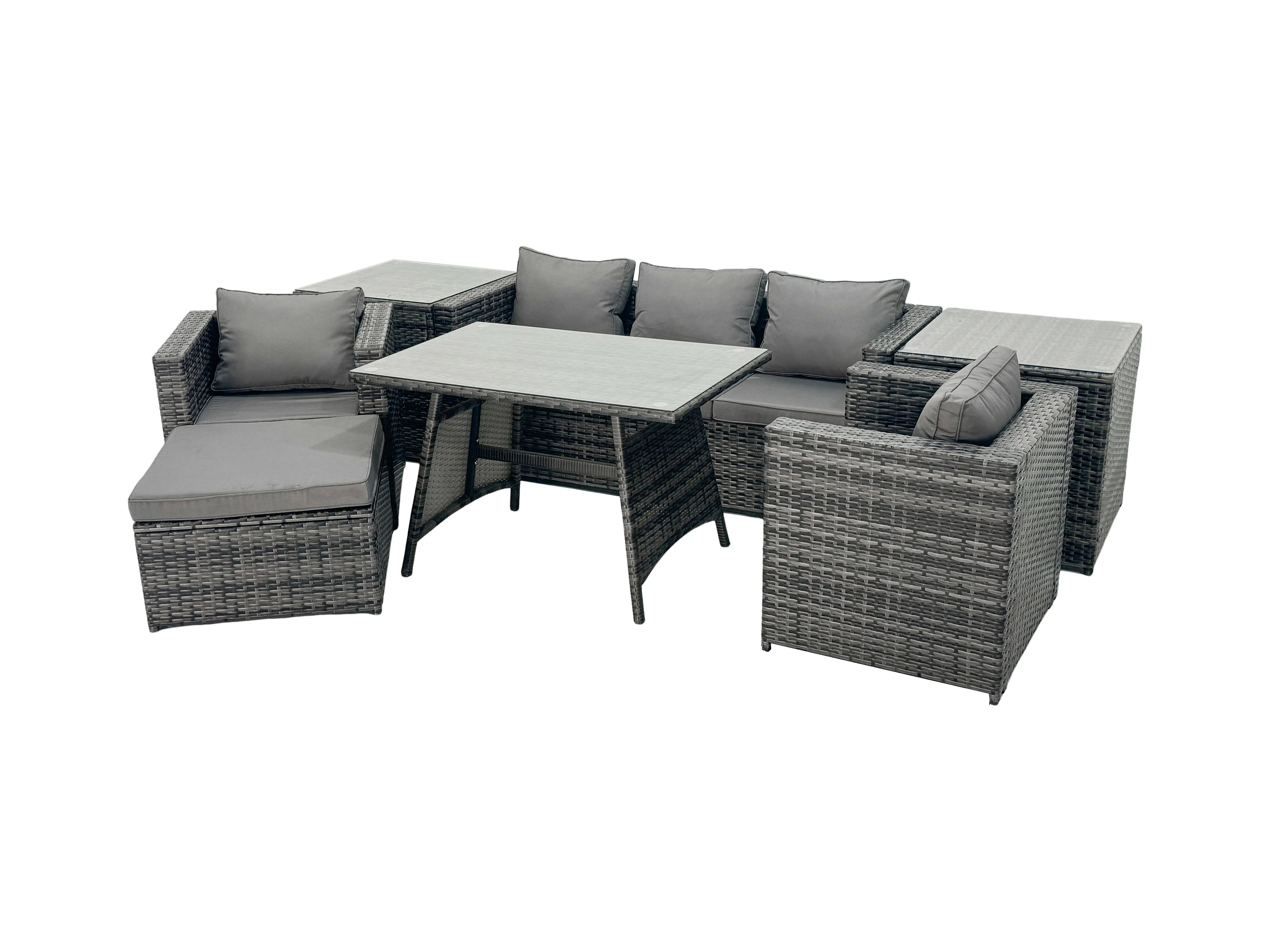 6-Sitzer Gartenmöbel Lounge Sofa Set mit Rechteckiger Esstisch 2 Beistelltischen 2 Großer Hockern 2 Sesseln Dunkelgrau Gemischt
