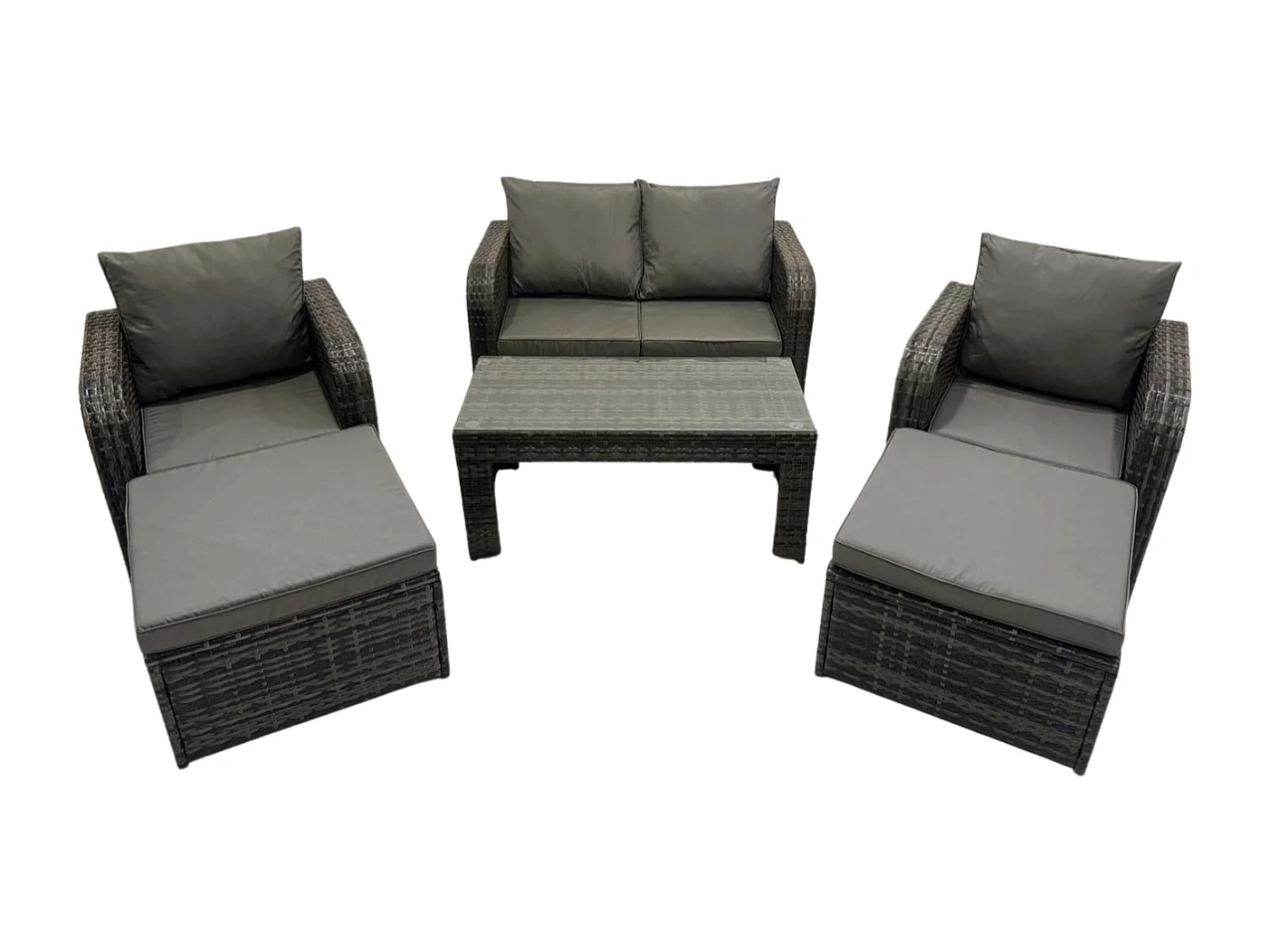 6-Sitzer Hoher Rücken Rattan Gartenmöbel Sets mit Rechteckiger Couchtisch Liegestühle Love Sofa 2 hohen Hockern