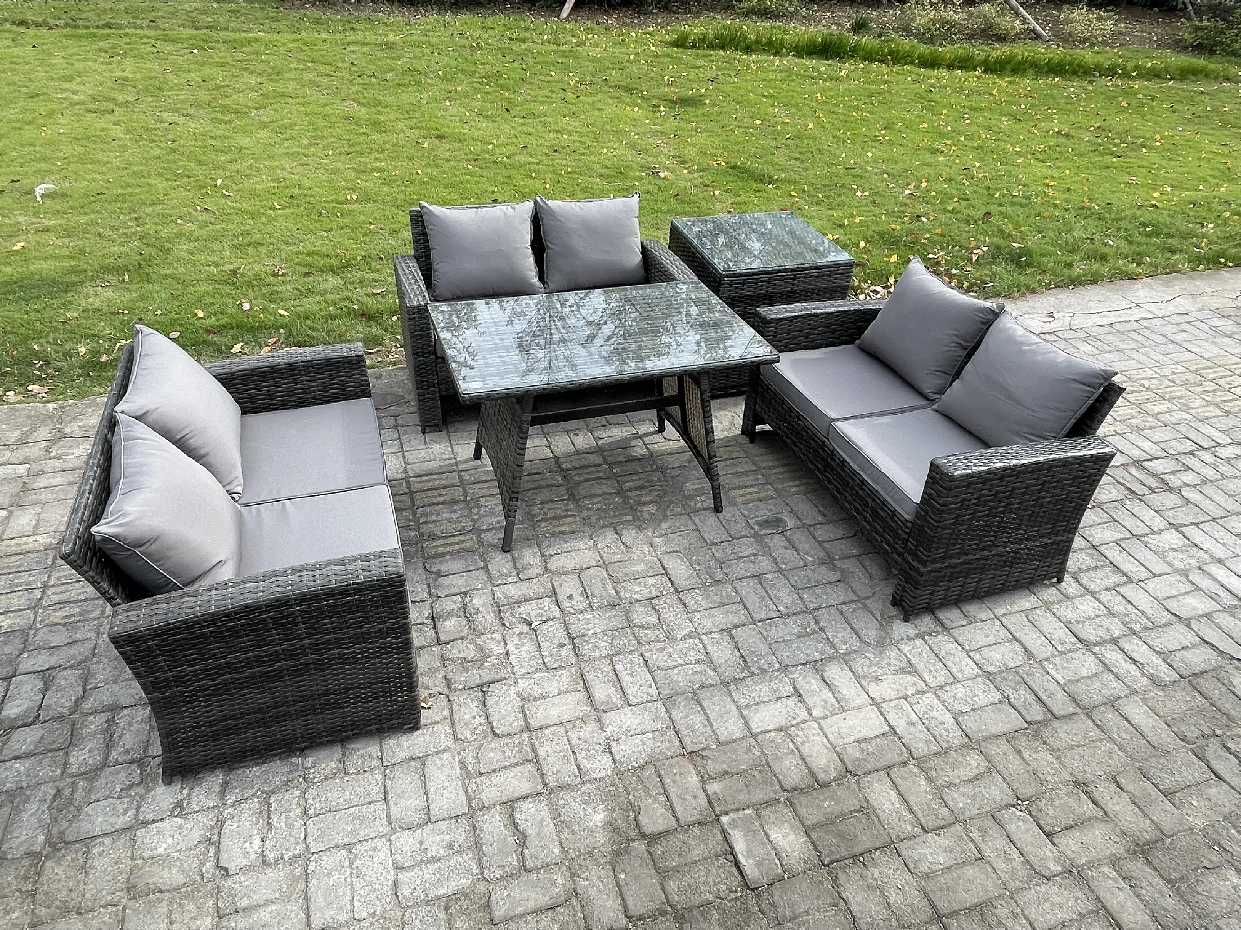 6-Sitzer Hoher Rücken Rattan Gartenmöbel Sets mit Rechteckiger Esstisch Loveseat Sofa Beistelltisch