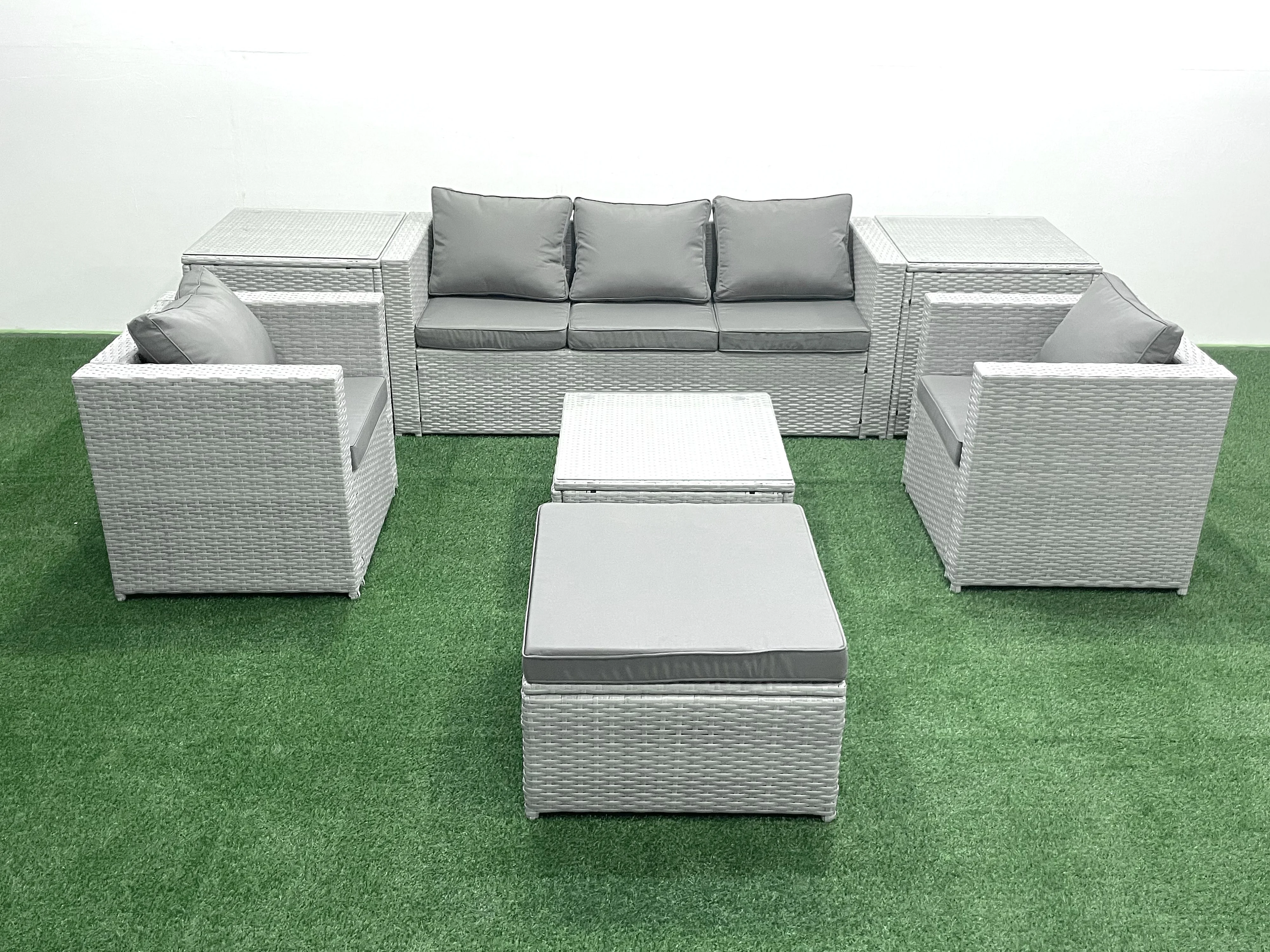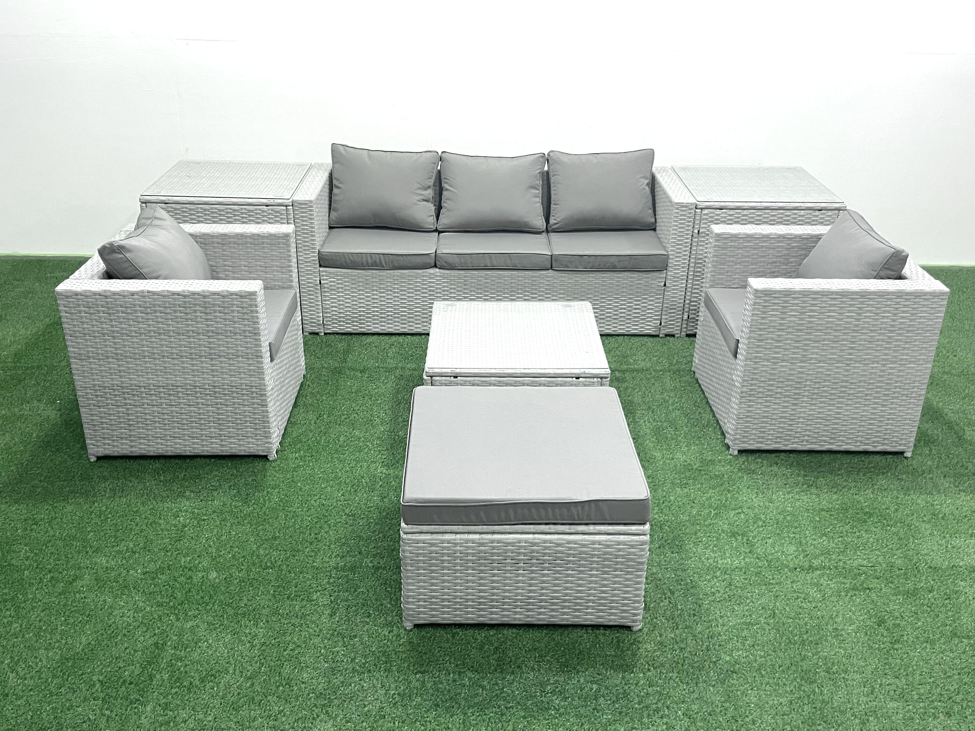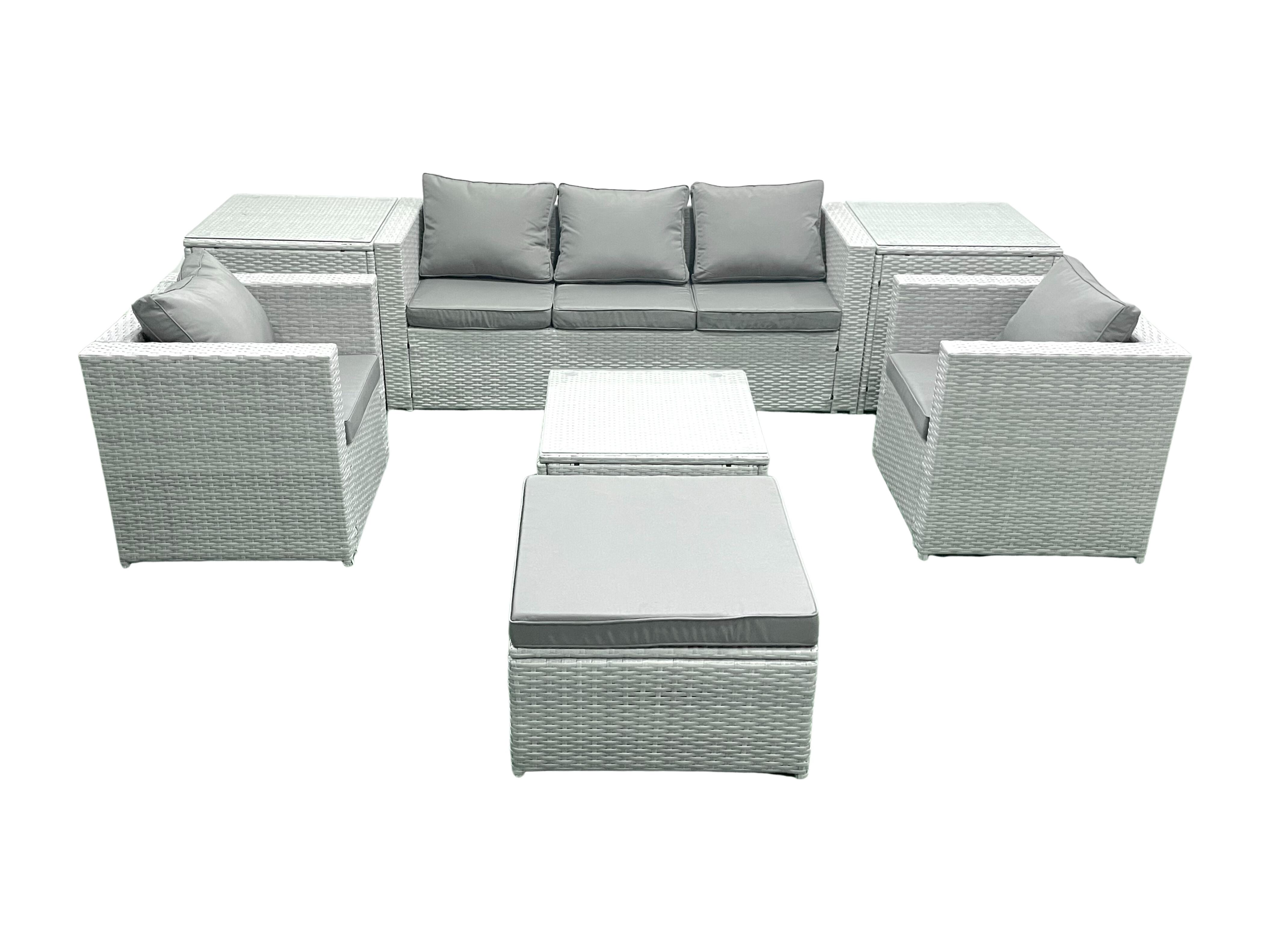 6-Sitzer Polyrattan Gartenmöbel Set mit 3-Sitzer Sofa 2 Sesseln Quadratischer Couchtisch 2 Großer Hockern 2 Beistelltischen Hellgrau gemischt