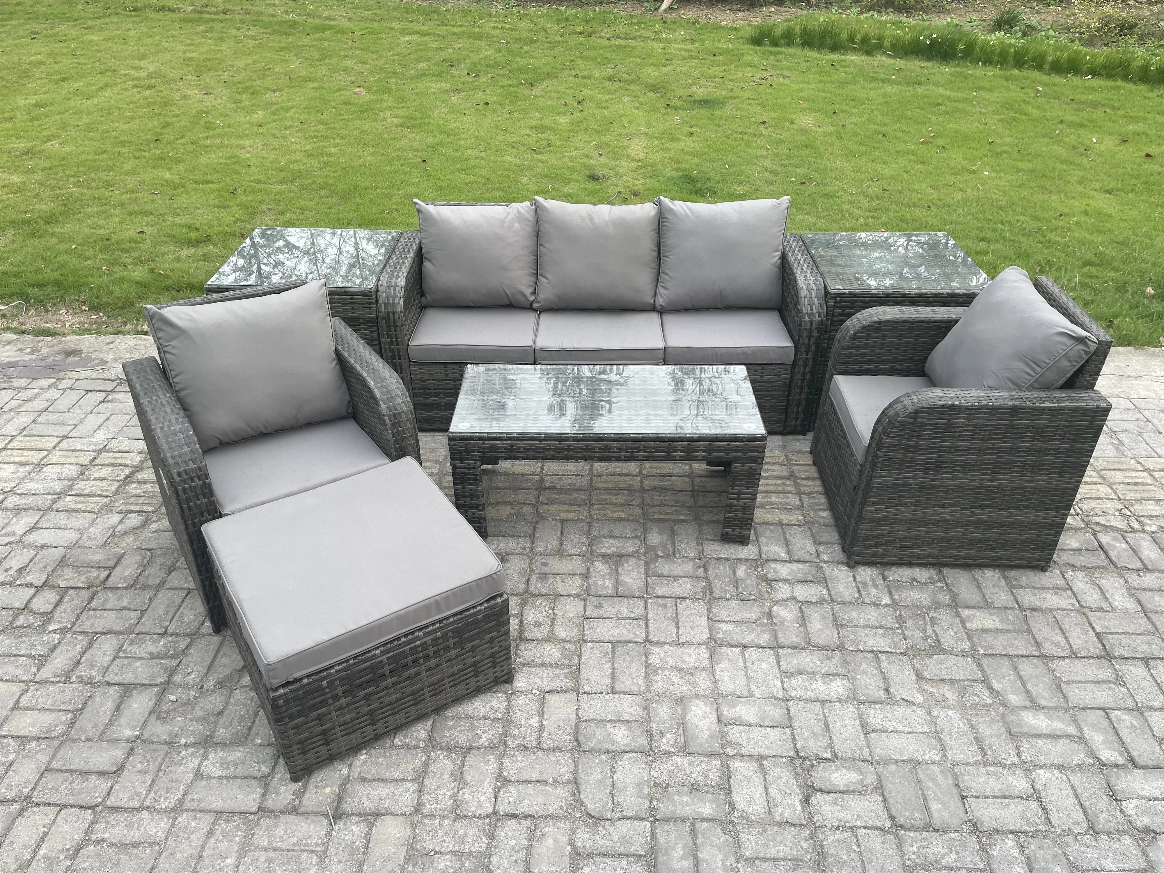 6-Sitzer Polyrattan Gartenmöbel Set mit Rechteckiger Couchtisch 2 Beistelltischen 2 Großer Hockern Patio Outdoor Rattansofa-Set