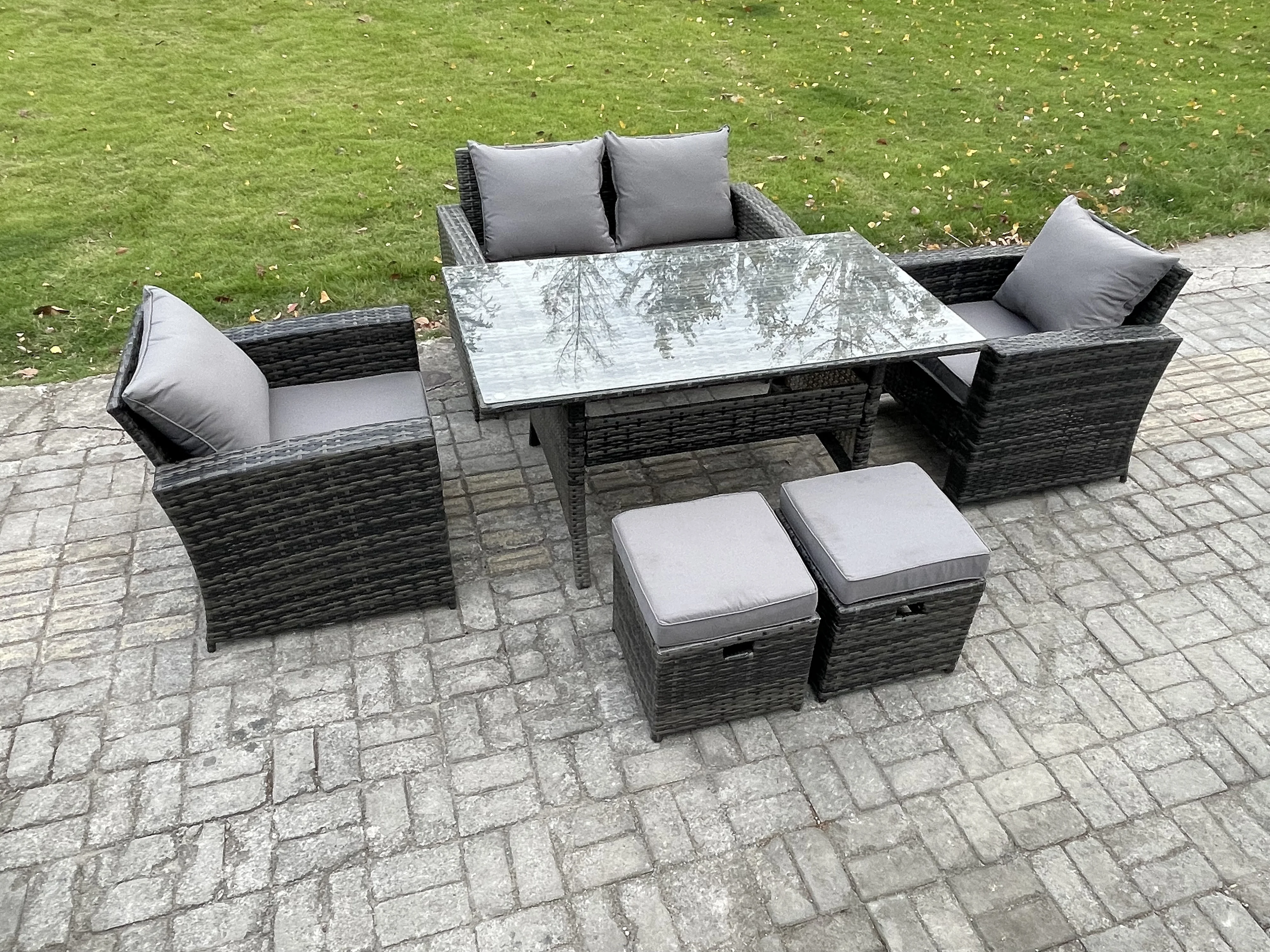 6 Sitzer Polyrattan Gartenmöbel Set Terrassenmöbel Set mit Rattan Rechteckiger Esstisch Lounge Sofa mit 2 kleine Fußhockern