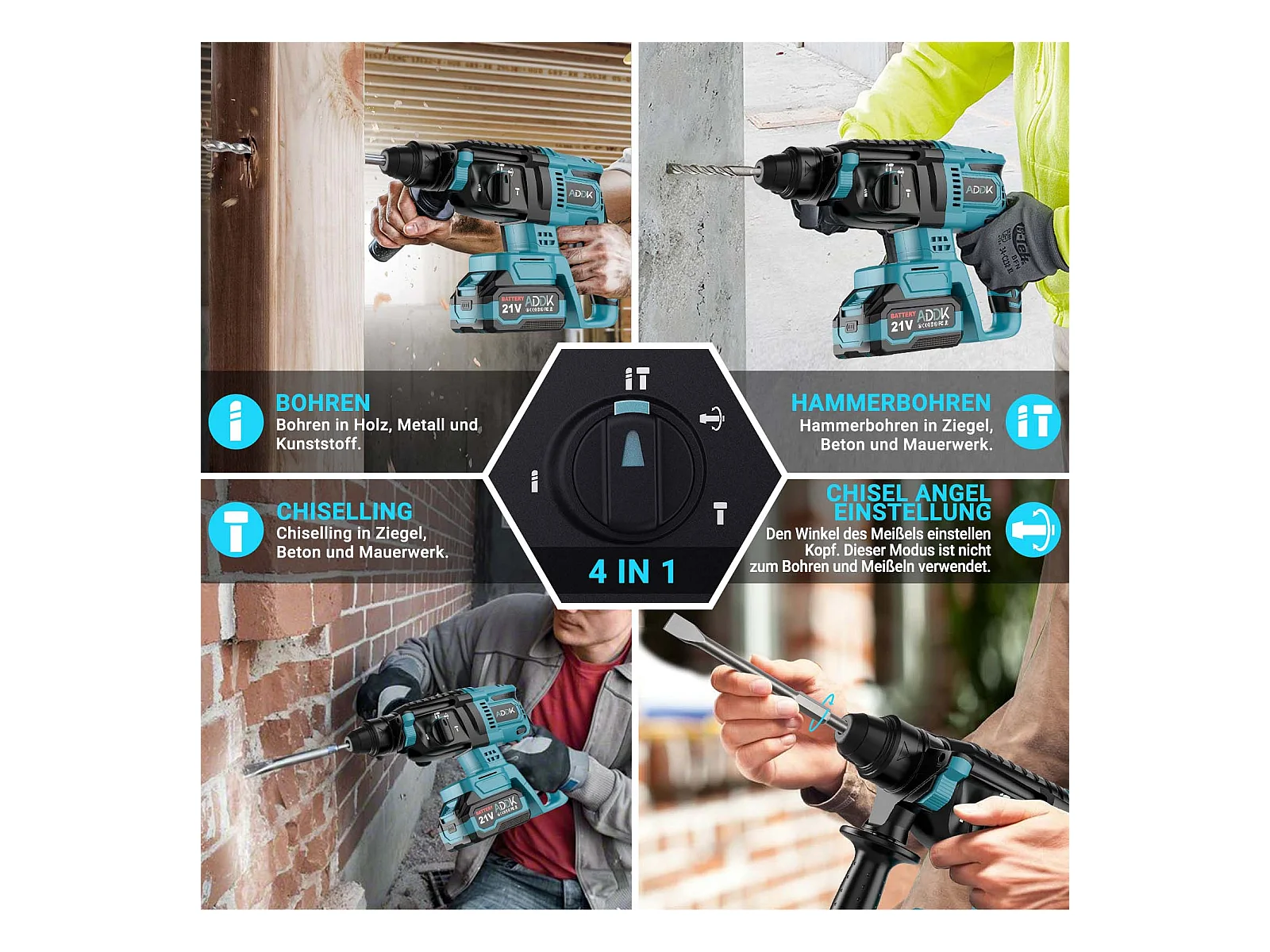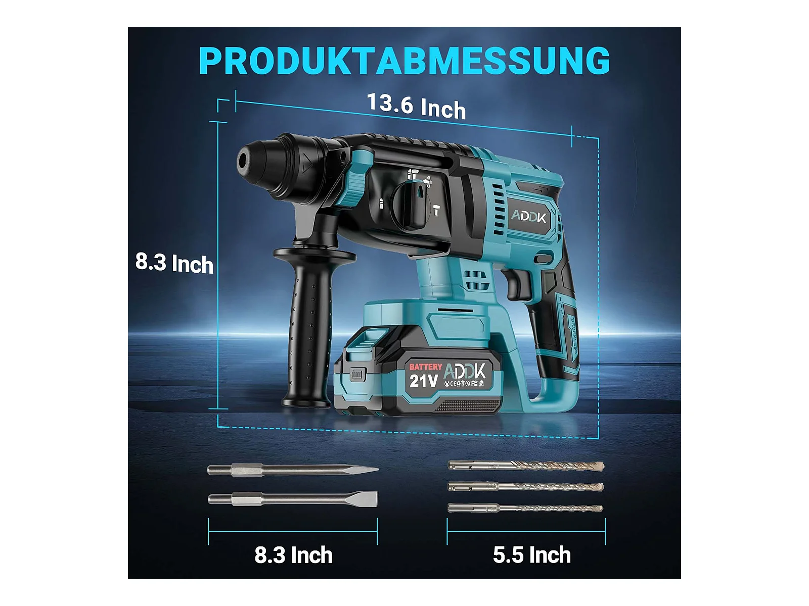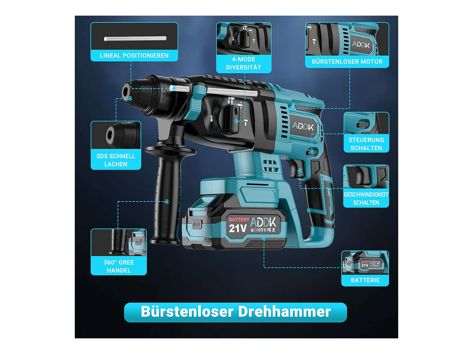 600 W 21 V 4,0 Ah Bohrhammer - Maximale Drehzahl 1500 U/min, Optimaler Bohrbereich 8-16 mm, 3 Betriebsarten - Blau