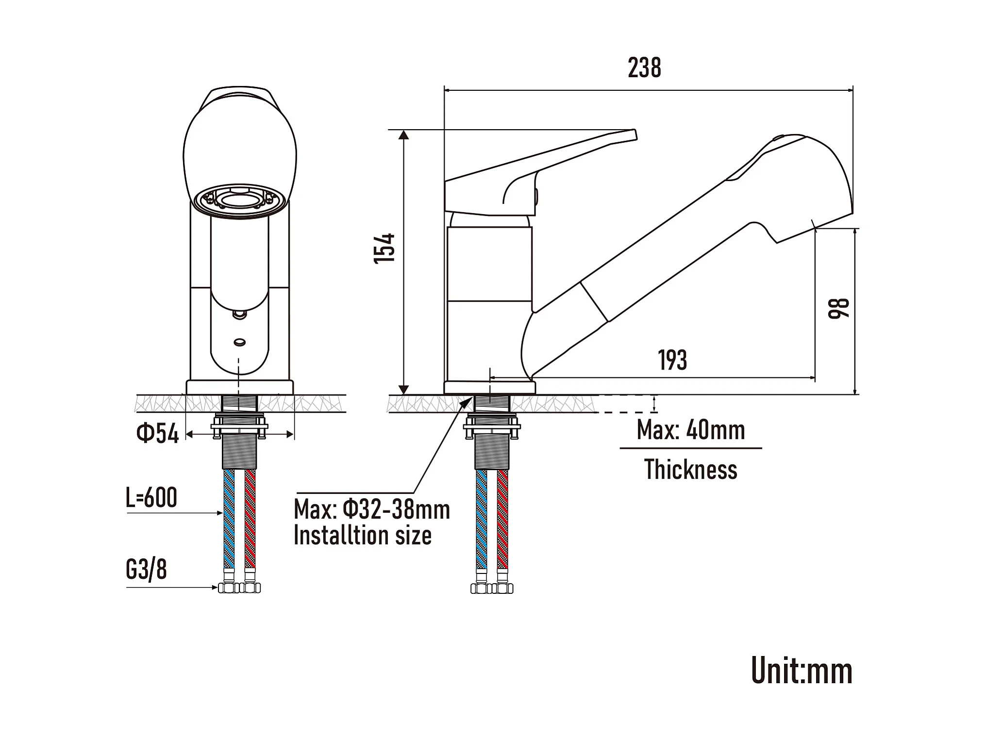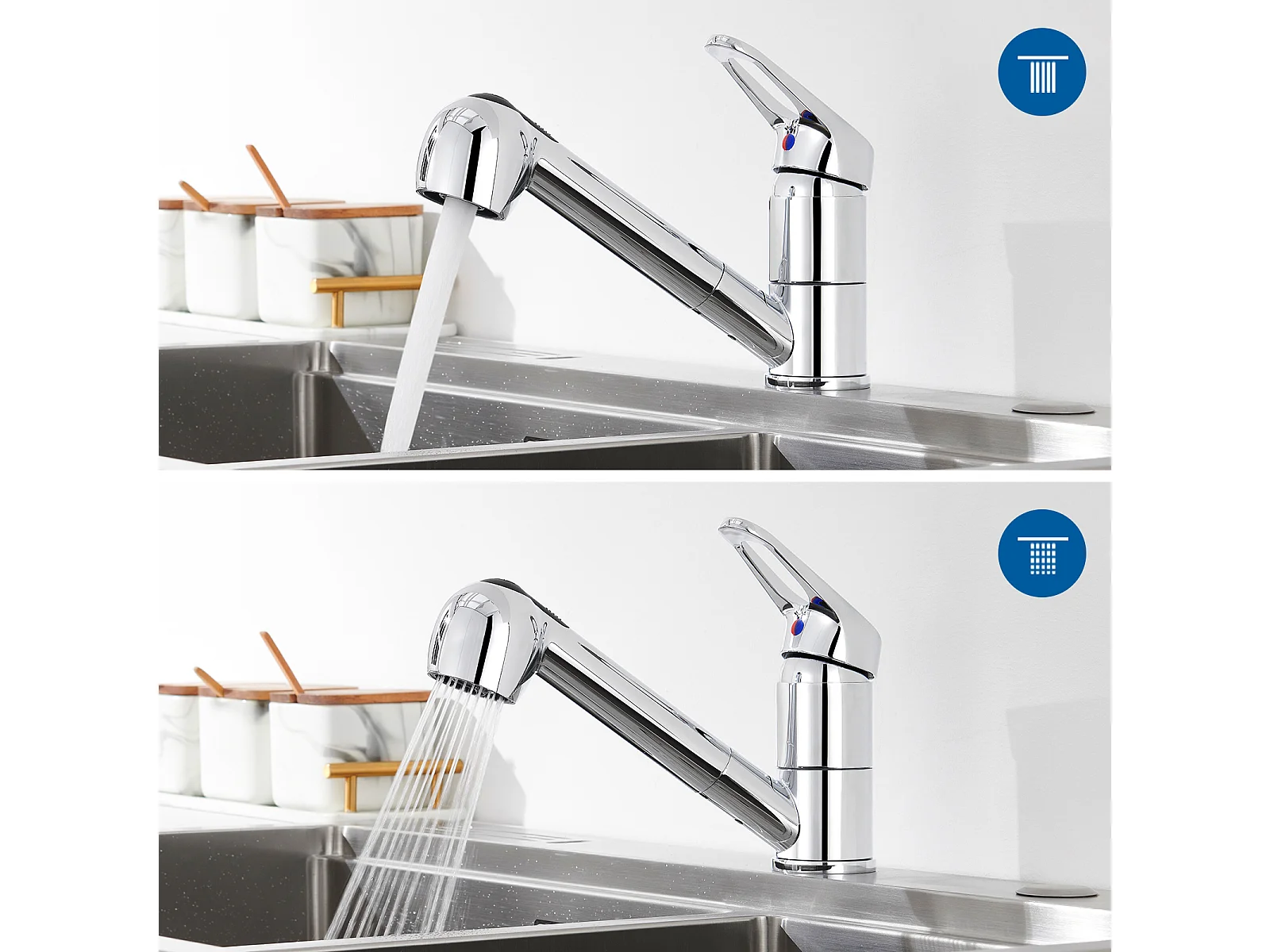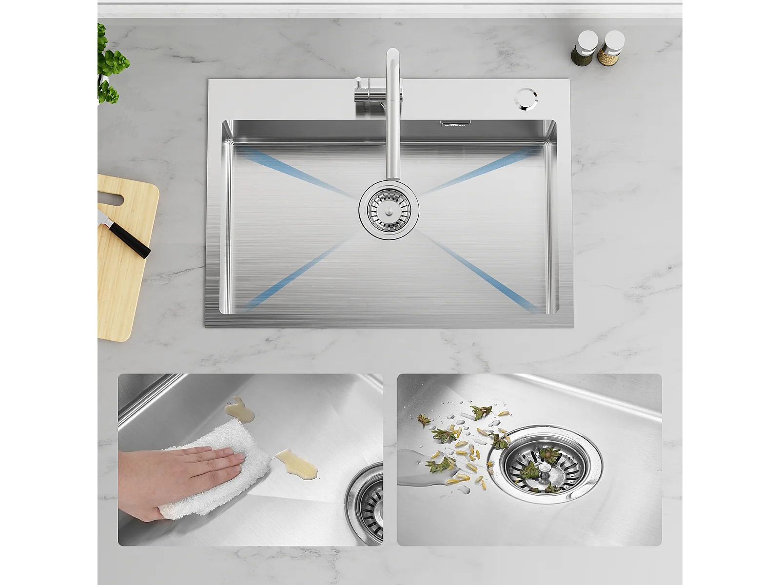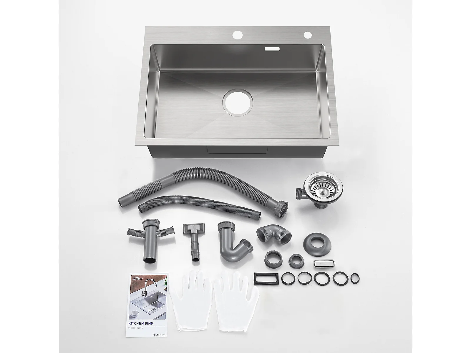 65 x 45 cm Küchenspüle aus gebürstetem Edelstahl mit Einzelbecken, Einbau-/Aufputzmontage + Küchenmischbatterie mit 360° drehbarer Ausziehbrause, Chrom