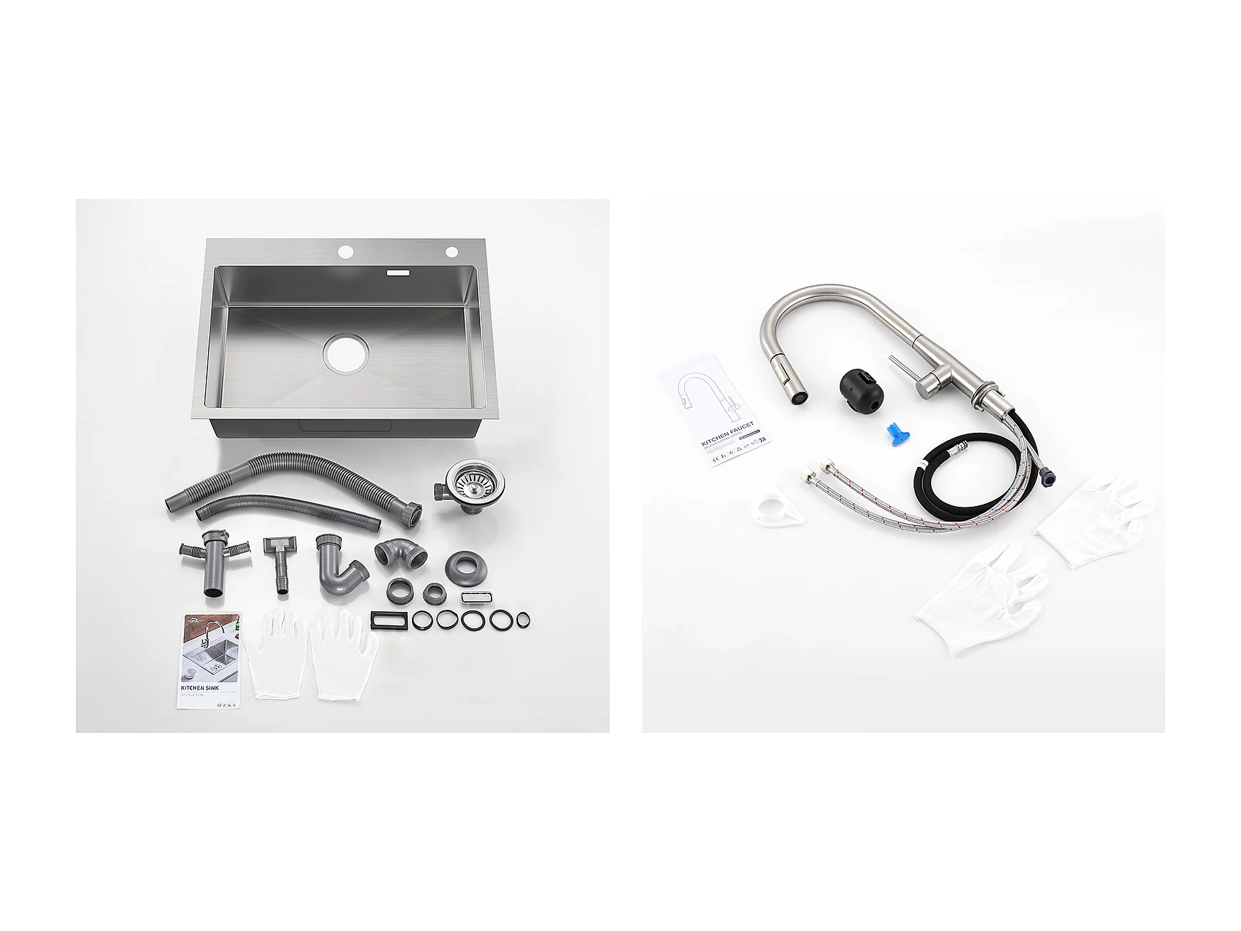 65x45CM Einzelbecken Küchenspüle aus gebürstetem Edelstahl, Einbau-/Aufputzmontage + Küchenmischbatterie mit 360° drehbarer Ausziehbrause, gebürstet