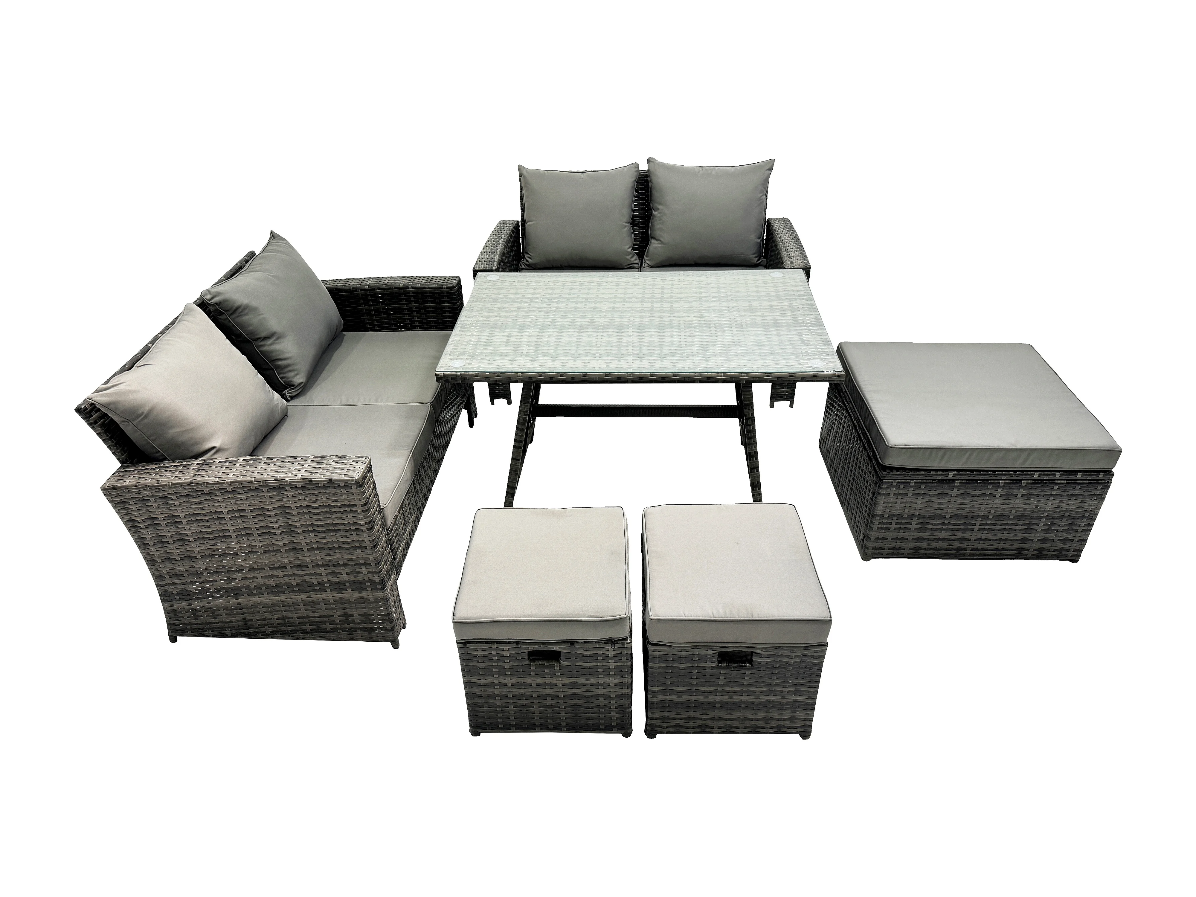 7-Sitzer Garten Esstisch Set Polyrattan Outdoor Möbel Sofa mit Rechteckiger Esstisch Doppelsitz Sofa 3 Hockern Dunkelgrau Gemischt