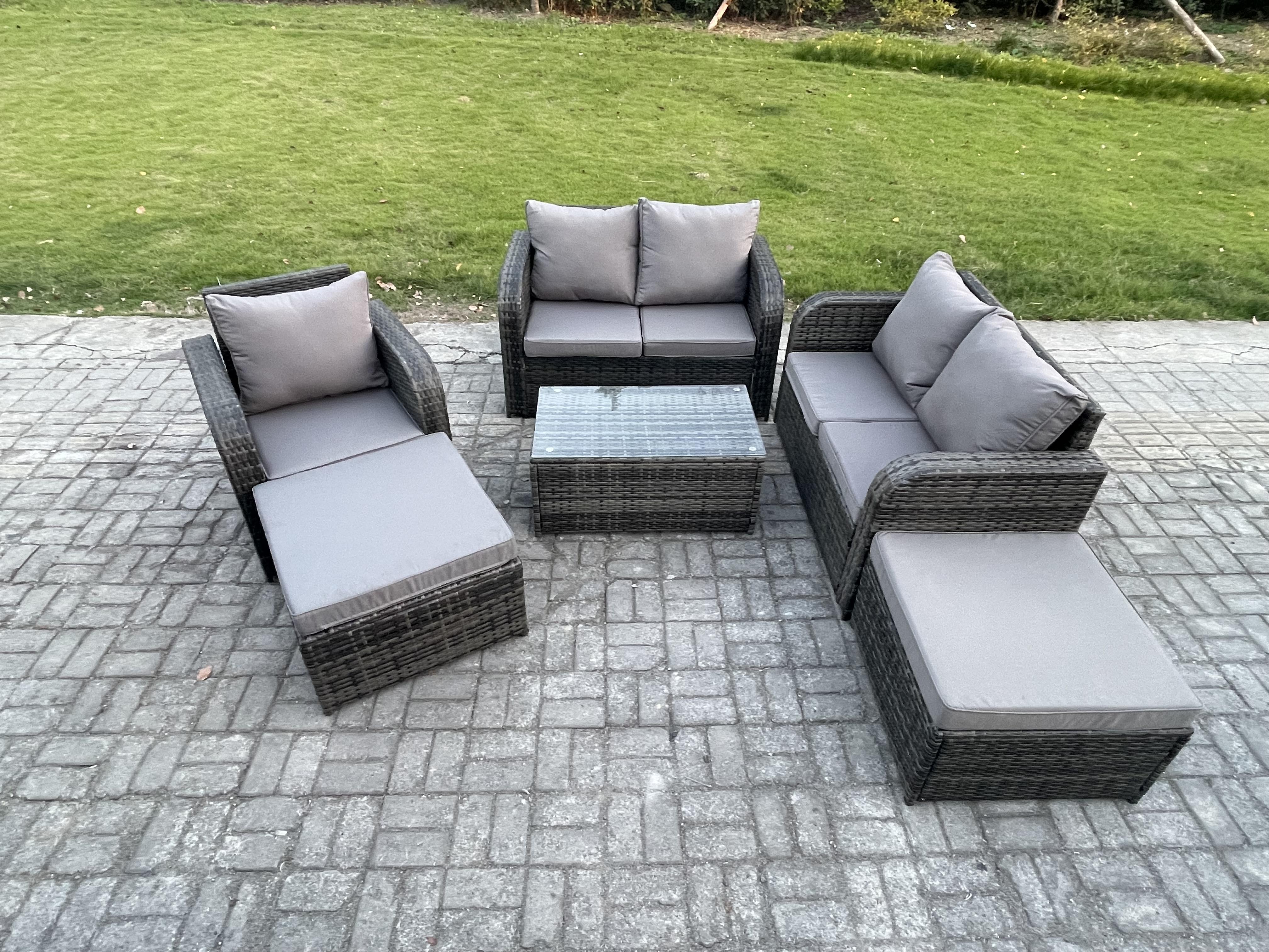 7-Sitzer Gartenmöbelset Rattan Garten Sofa im Freien Sessel mit Gehärteter Glastisch 2 hohen Hockern Dunkelgrau Gemischt