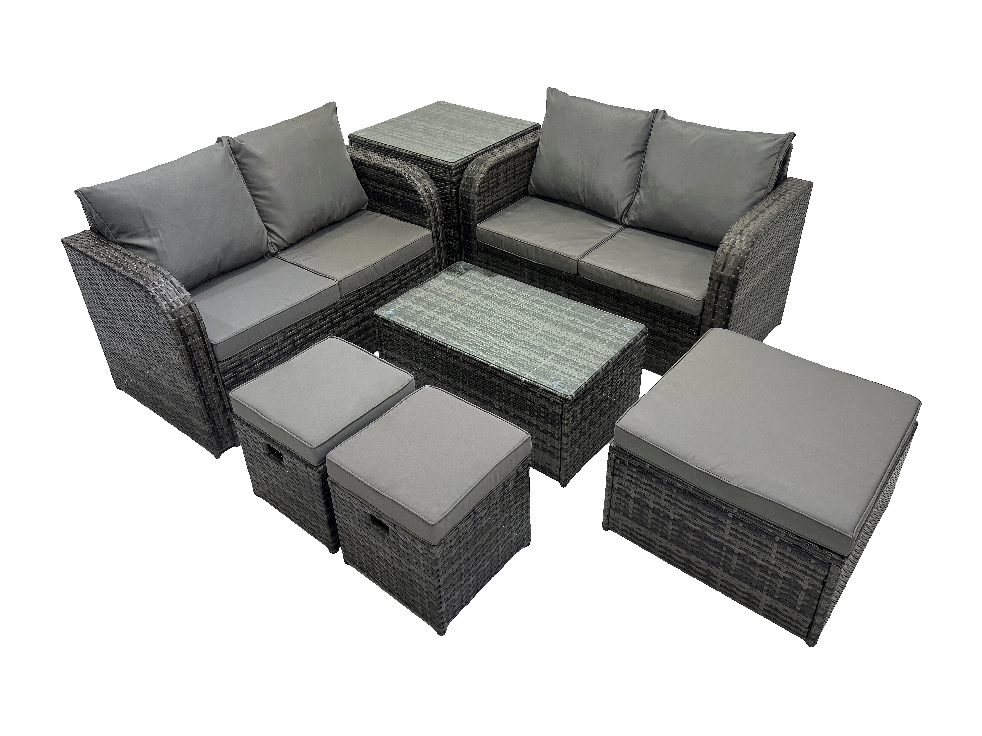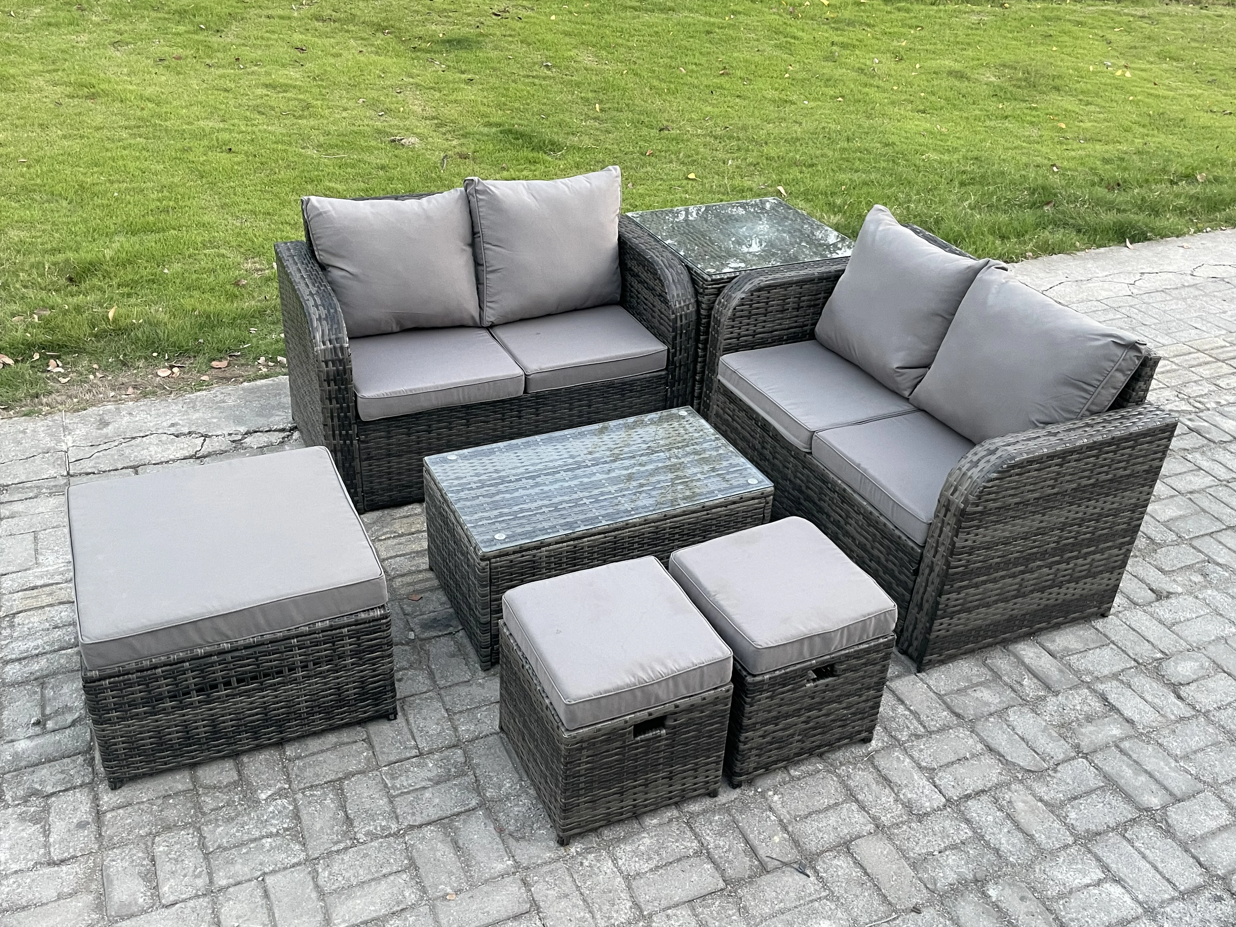 7-Sitzer Gartenmöbelset Rattan Garten Sofa im Freien Sessel mit Gehärteter Glastisch 3 Hockern Beistelltisch Dunkelgrau Gemischt
