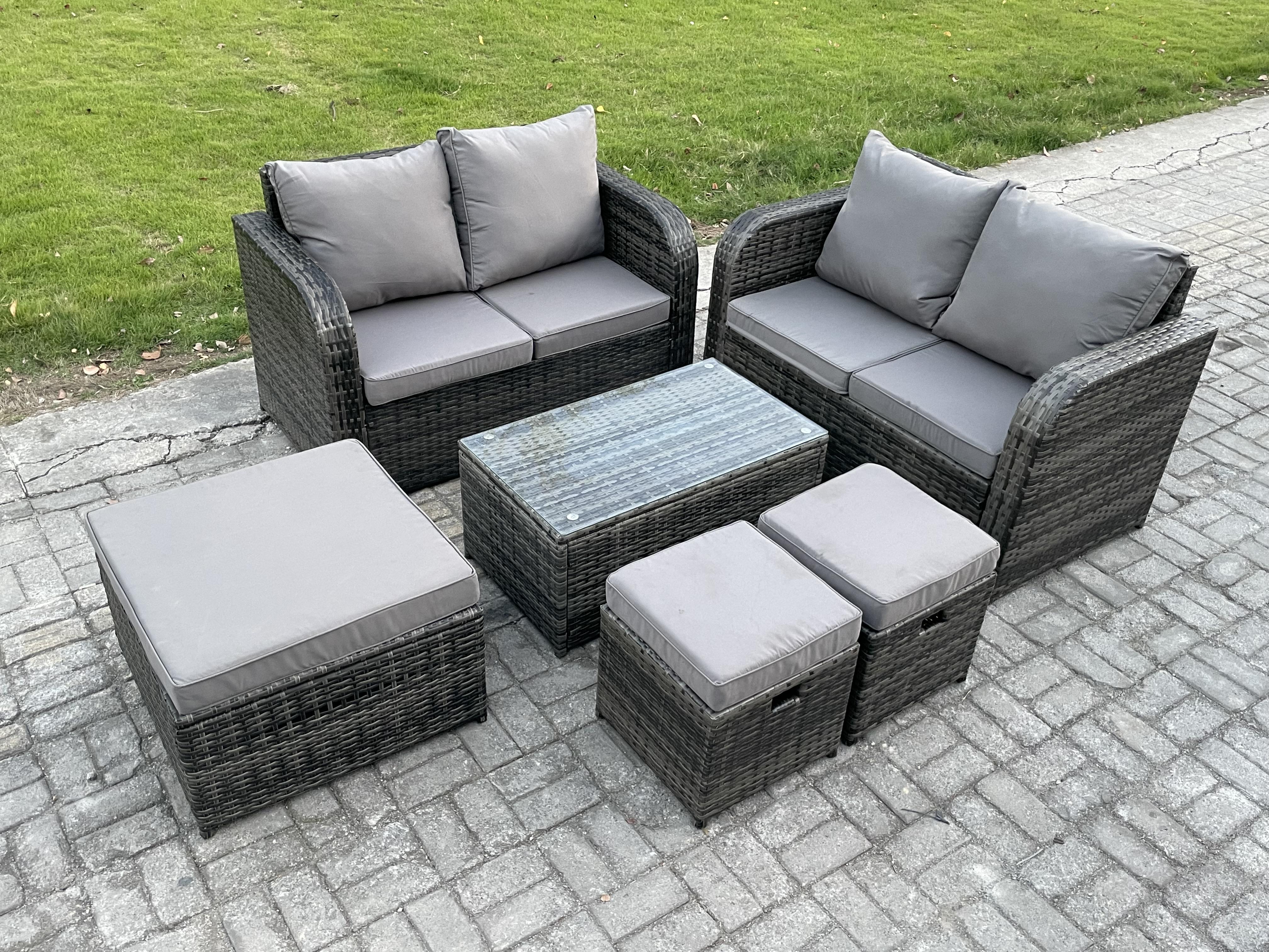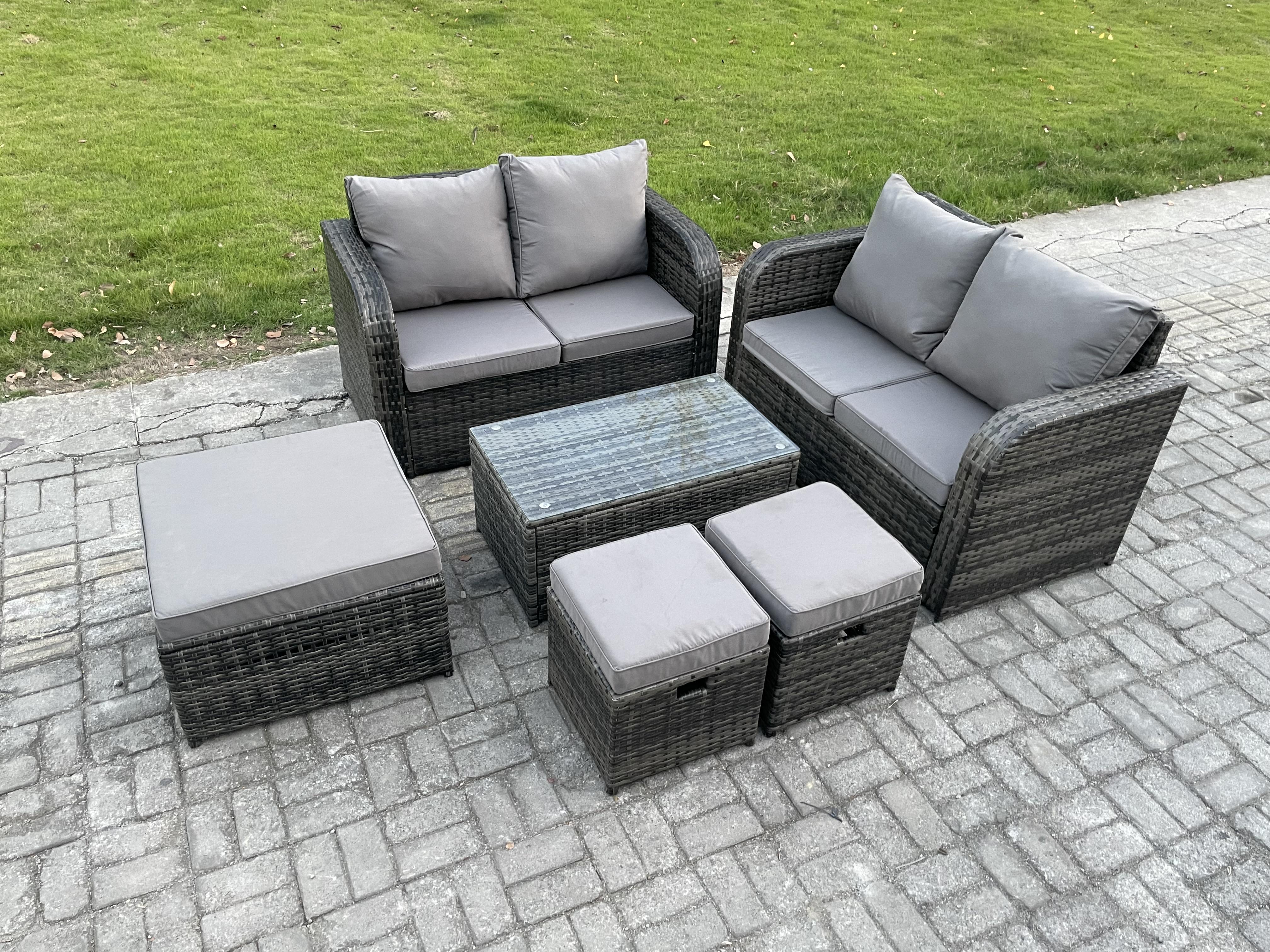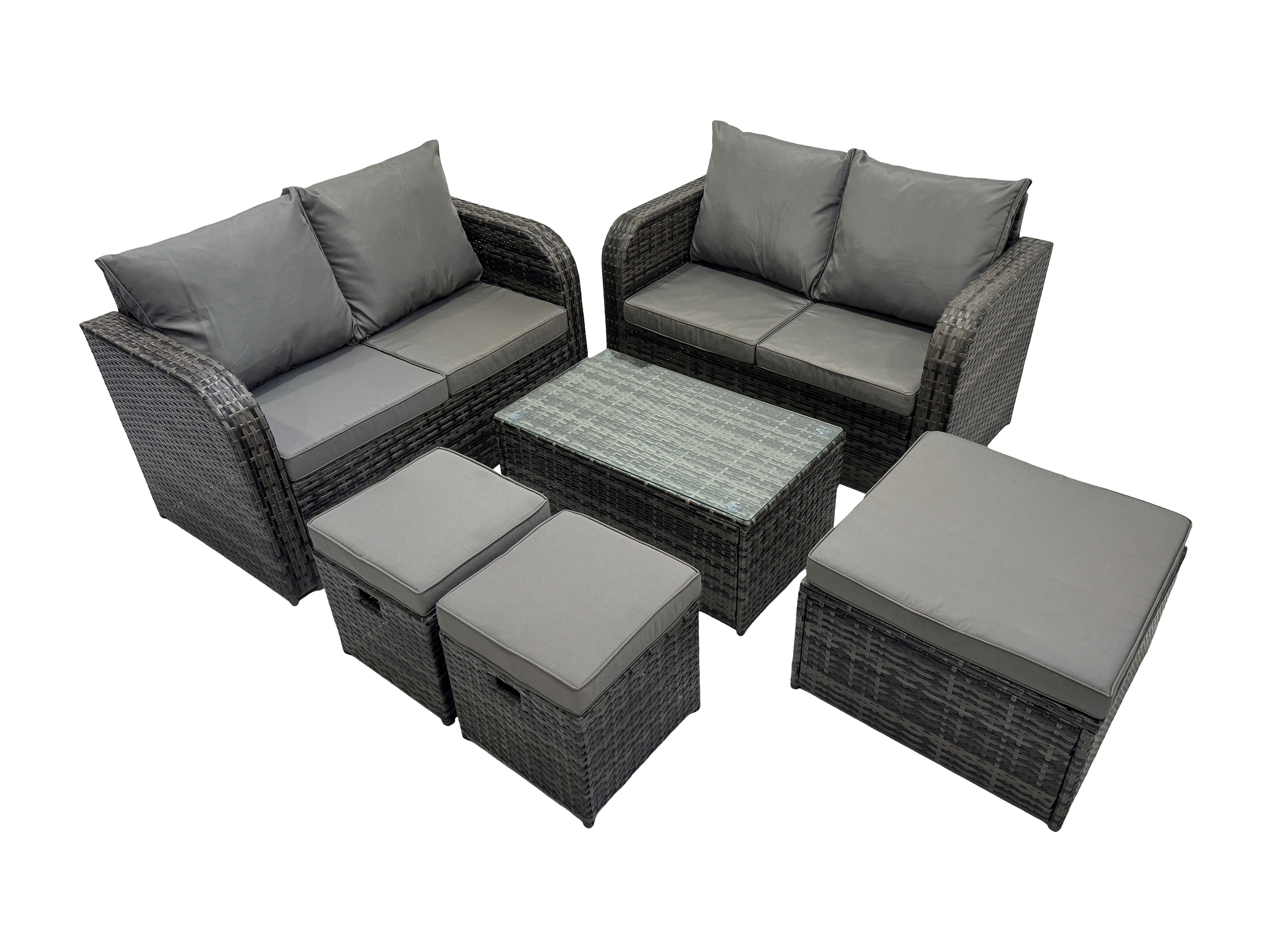 7-Sitzer Gartenmöbelset Rattan Garten Sofa im Freien Sessel mit Gehärteter Glastisch 3 Hockern Dunkelgrau Gemischt