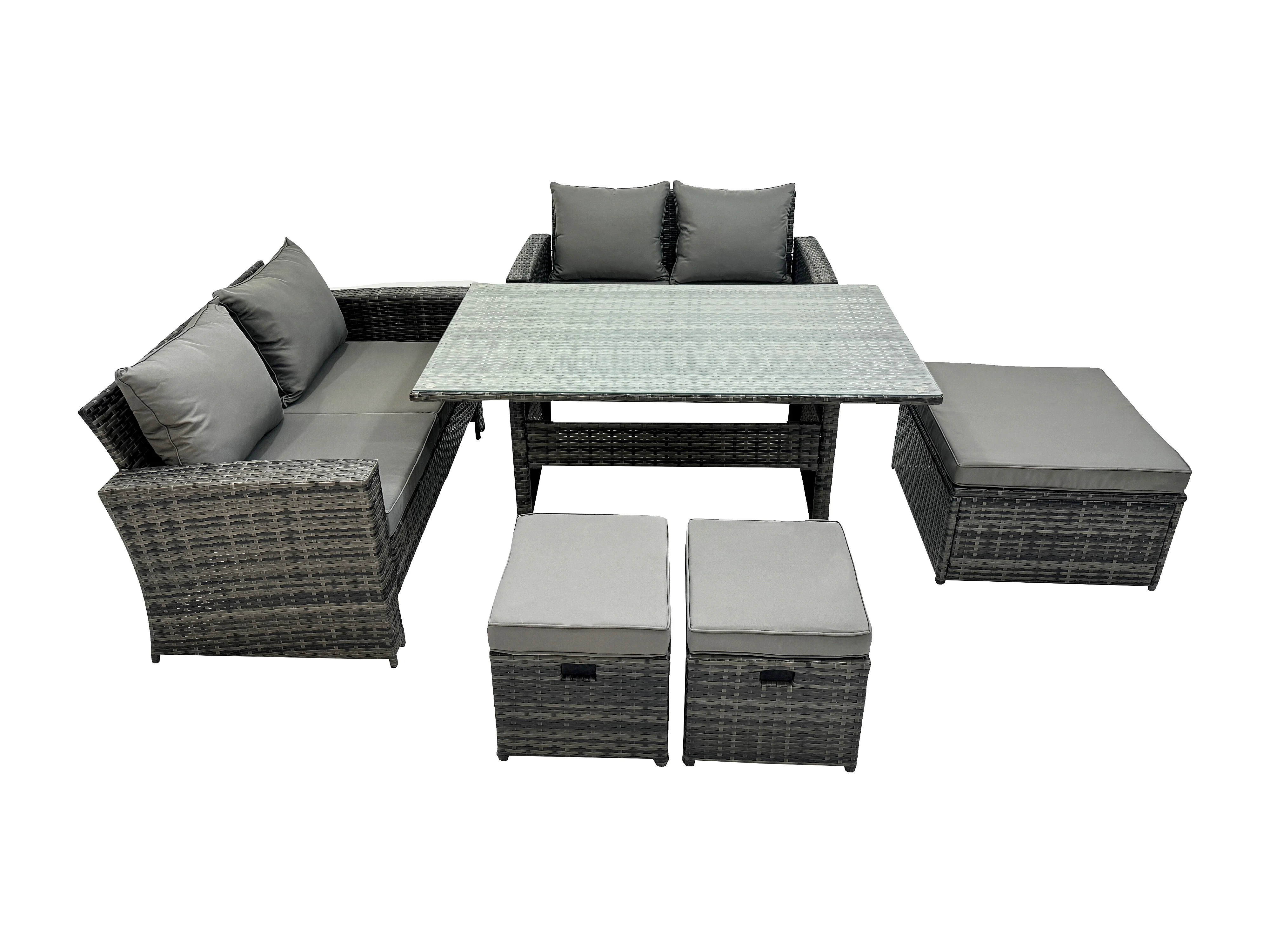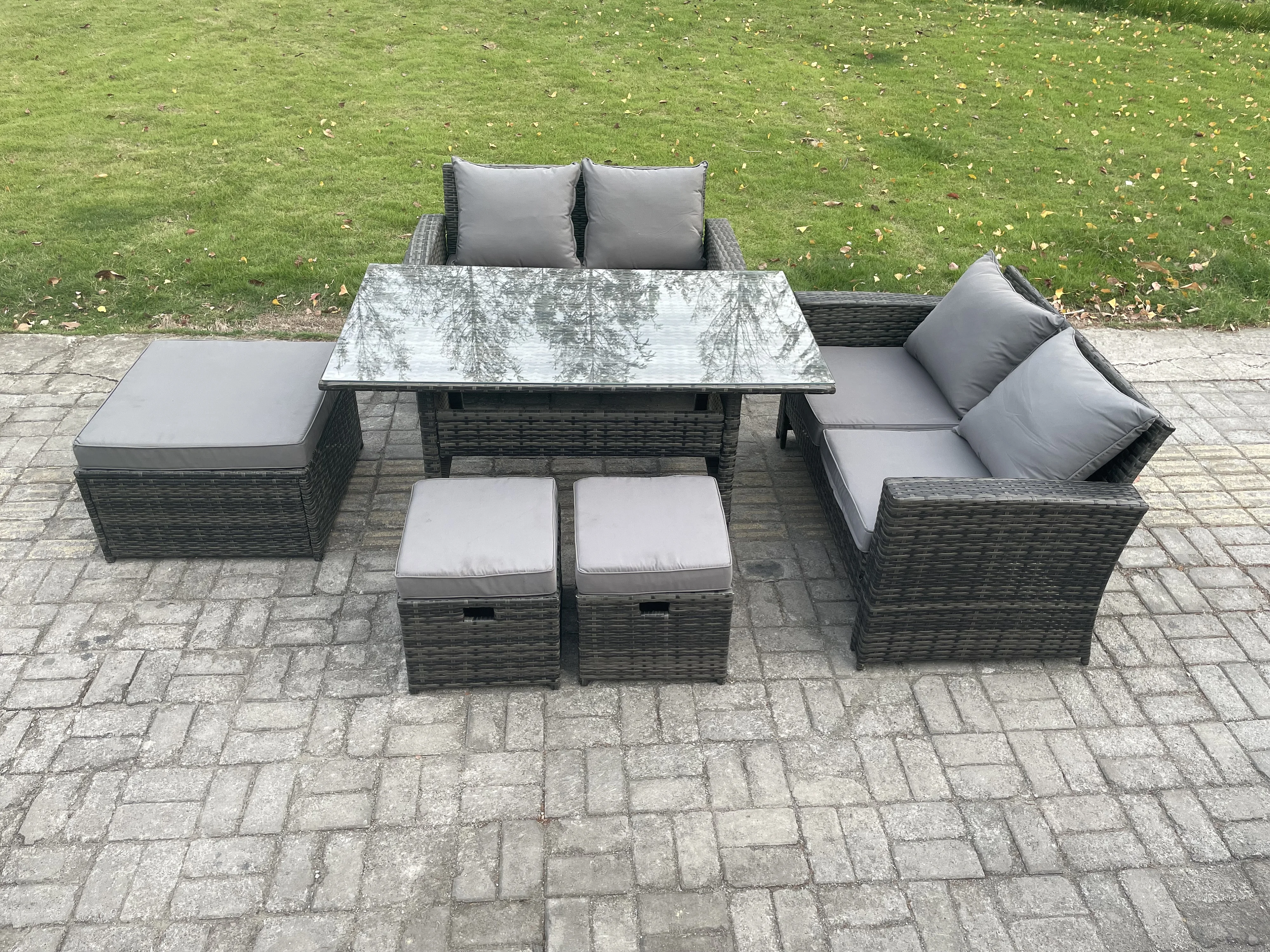 7 Sitzer Hoher Rücken Gartengartenmöbel Rattan Sofa Esstisch Set mit 3 Fußhockern Dunkelgrau gemischt