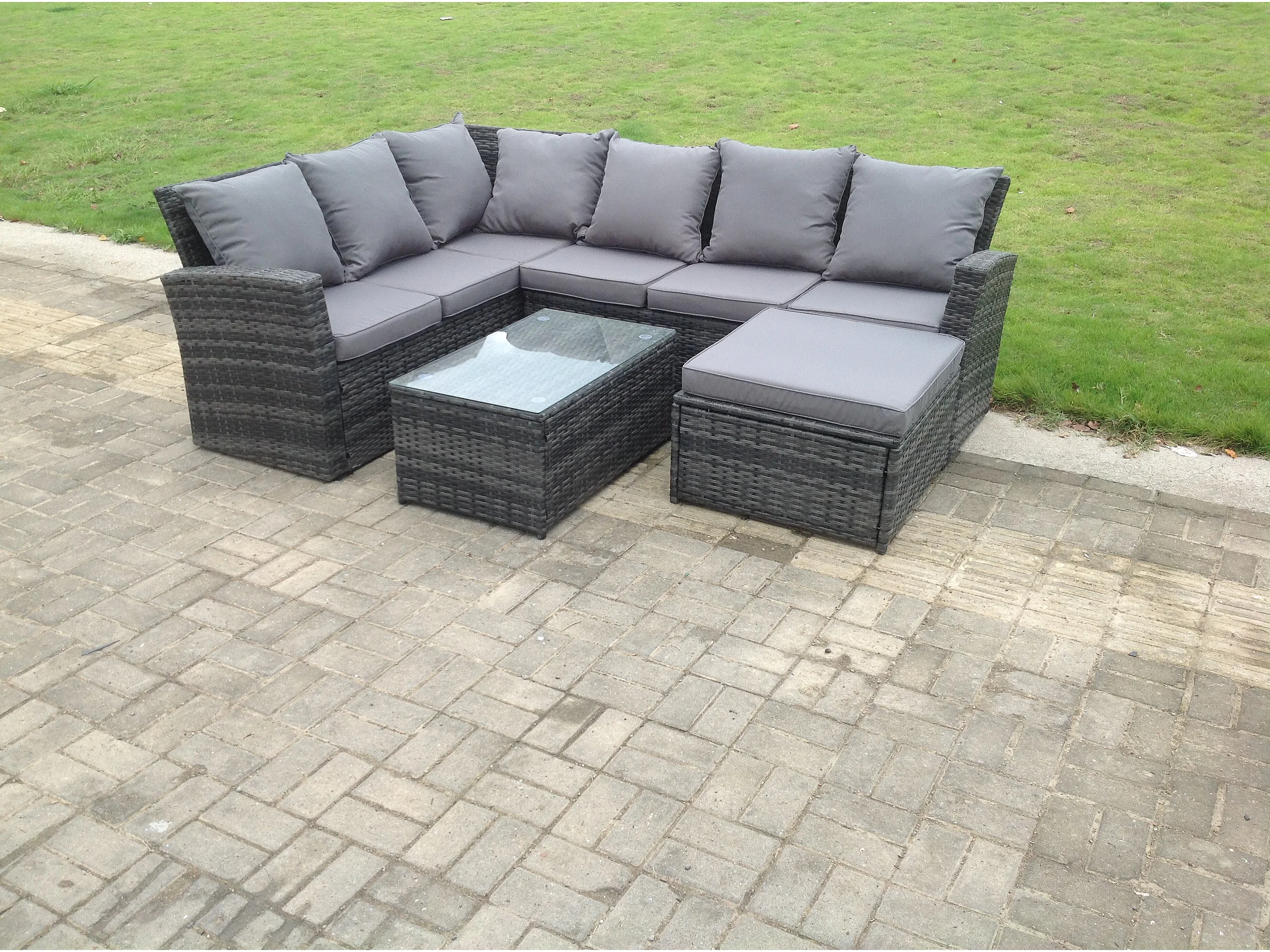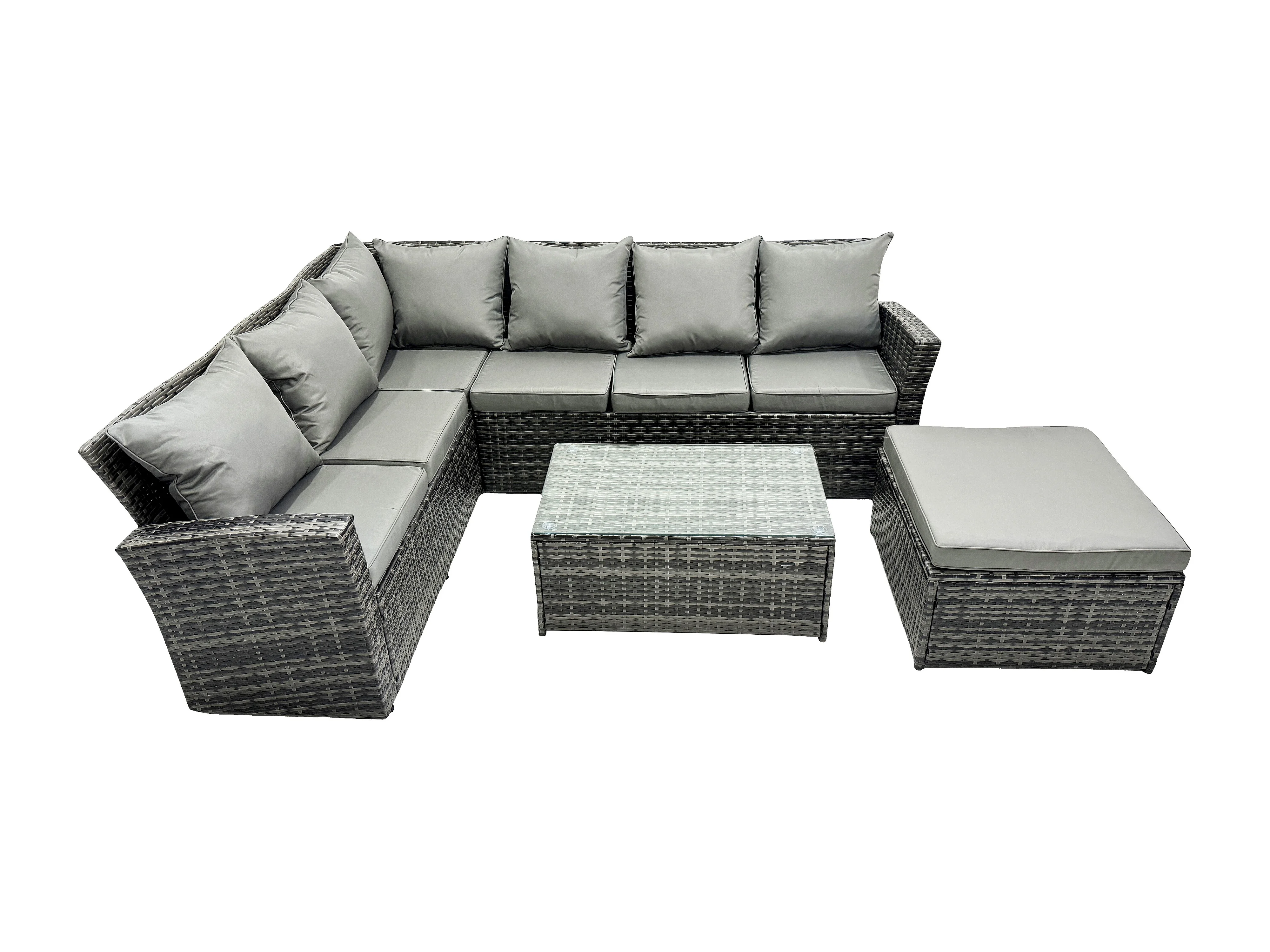 7 Sitzer Hoher Rücken Rattan Gartenmöbel-Set Ecksofa mit Länger Couchtisch Hocker