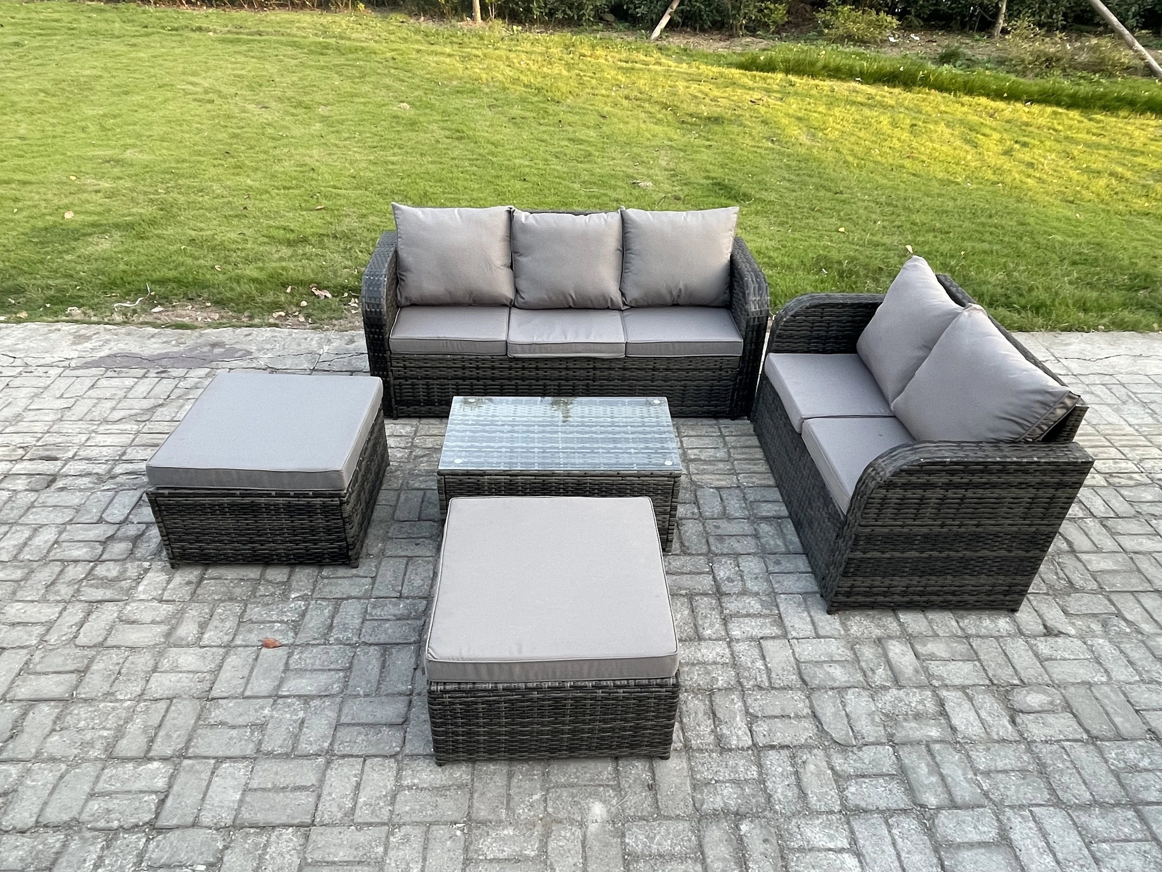 7-Sitzer Hoher Rücken Rattan Gartenmöbel Sets mit Rechteckiger Couchtisch 3-Sitzer Sofa Love Sofa 2 hohen Hockern