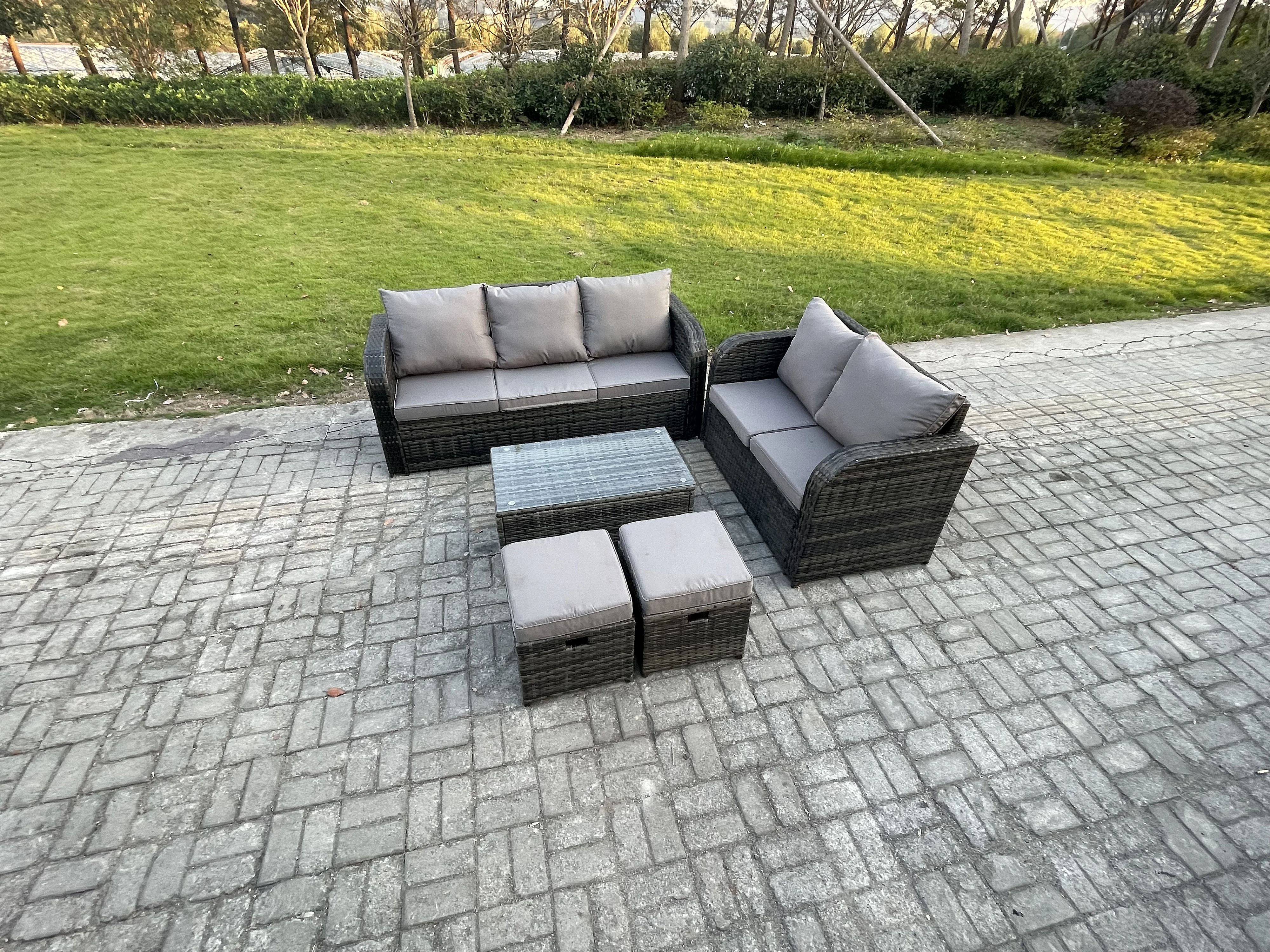 7-Sitzer Hoher Rücken Rattan Gartenmöbel Sets mit Rechteckiger Couchtisch 3-Sitzer Sofa Love Sofa 2 kleine Fußhockern