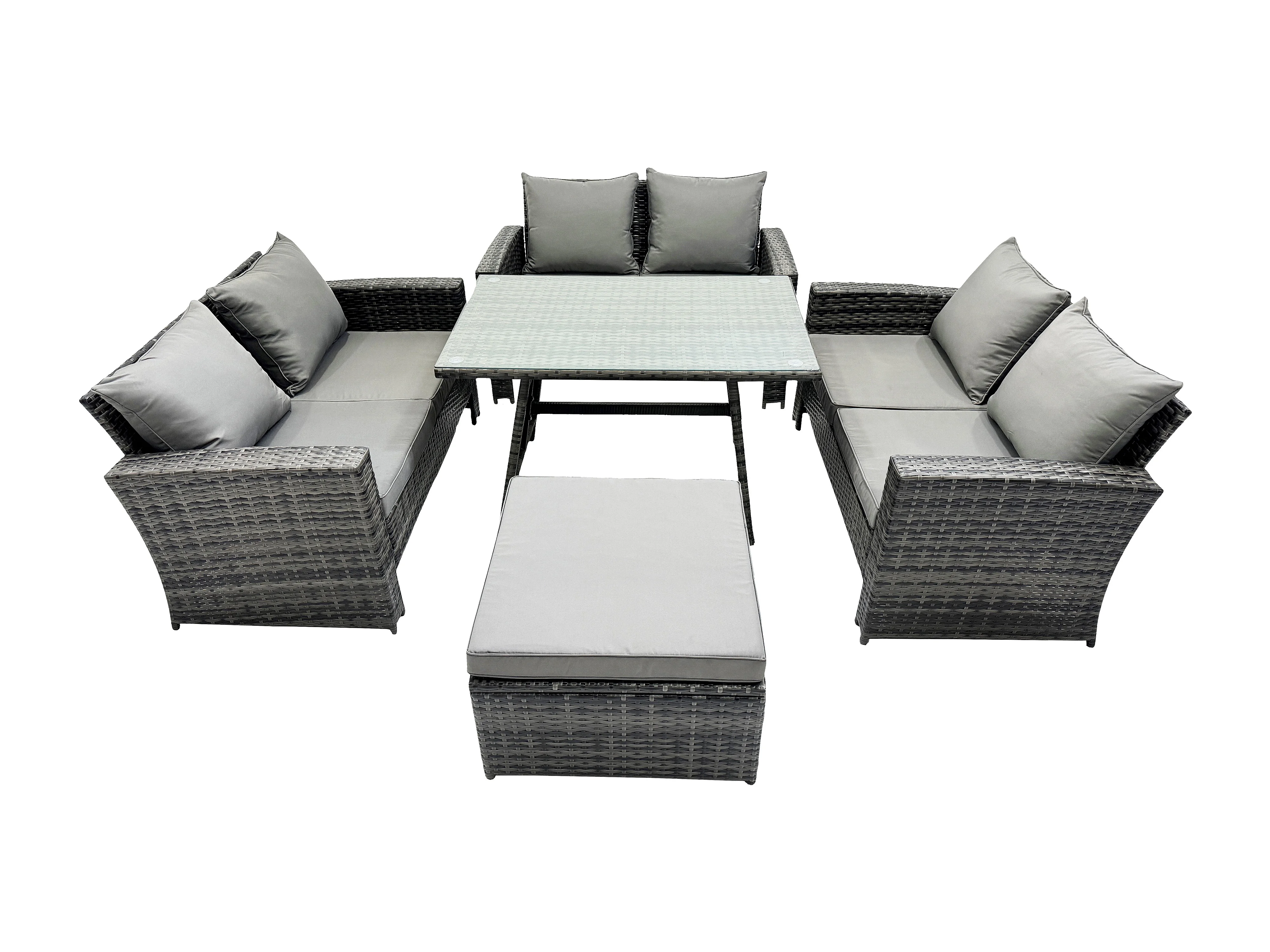 7-Sitzer Hoher Rücken Rattan Gartenmöbel Sets mit Rechteckiger Esstisch Loveseat Sofa 2 Großer Hockern