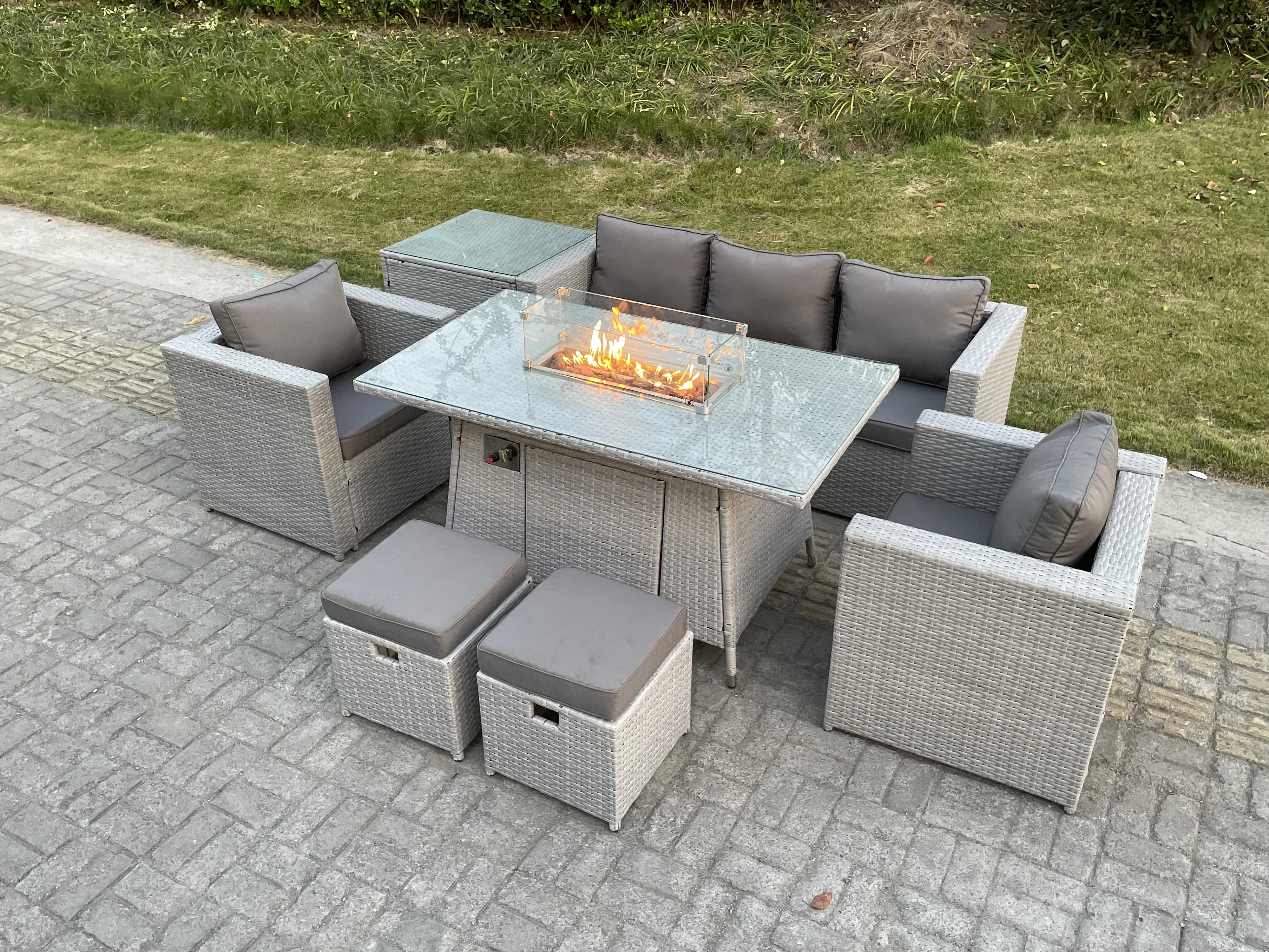 7-Sitzer Polyrattan Gartenmöbel Set im Freien Gas Feuertisch Sofa Sets mit 2 Sessel Beistelltisch 2 Kleiner Hocker Helles Grau