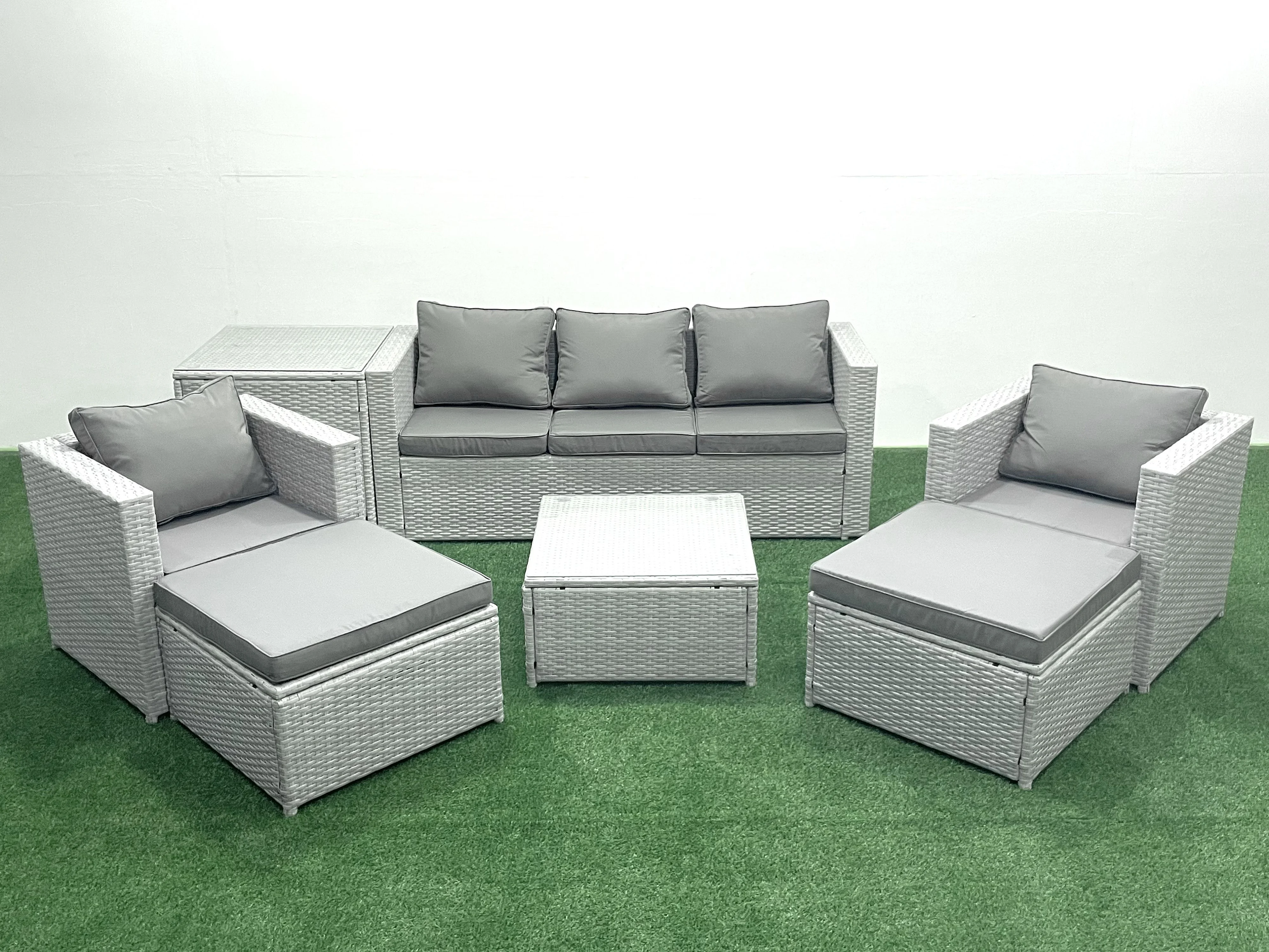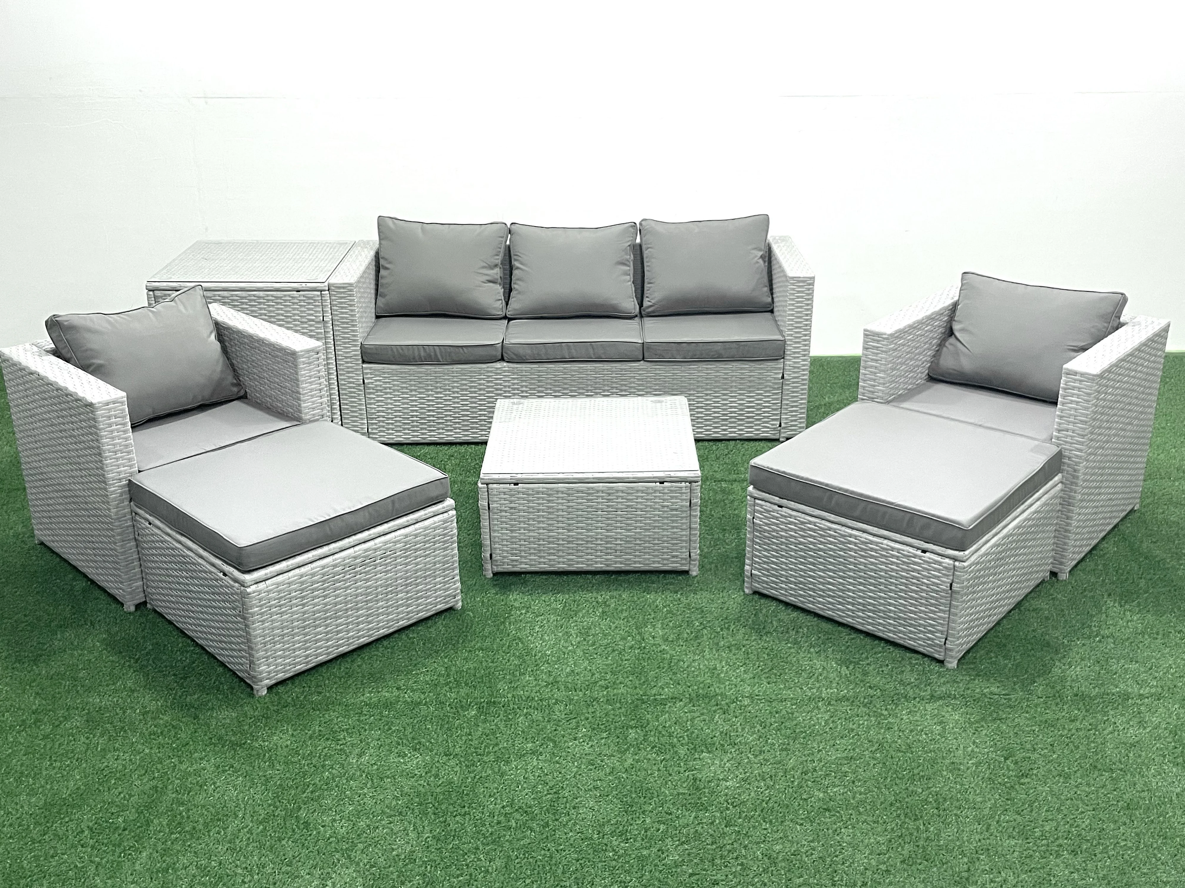 7-Sitzer Polyrattan Gartenmöbel Set mit 3-Sitzer Sofa 2 Sesseln Quadratischer Couchtisch 2 hohen Hockern Beistelltisch Hellgrau gemischt
