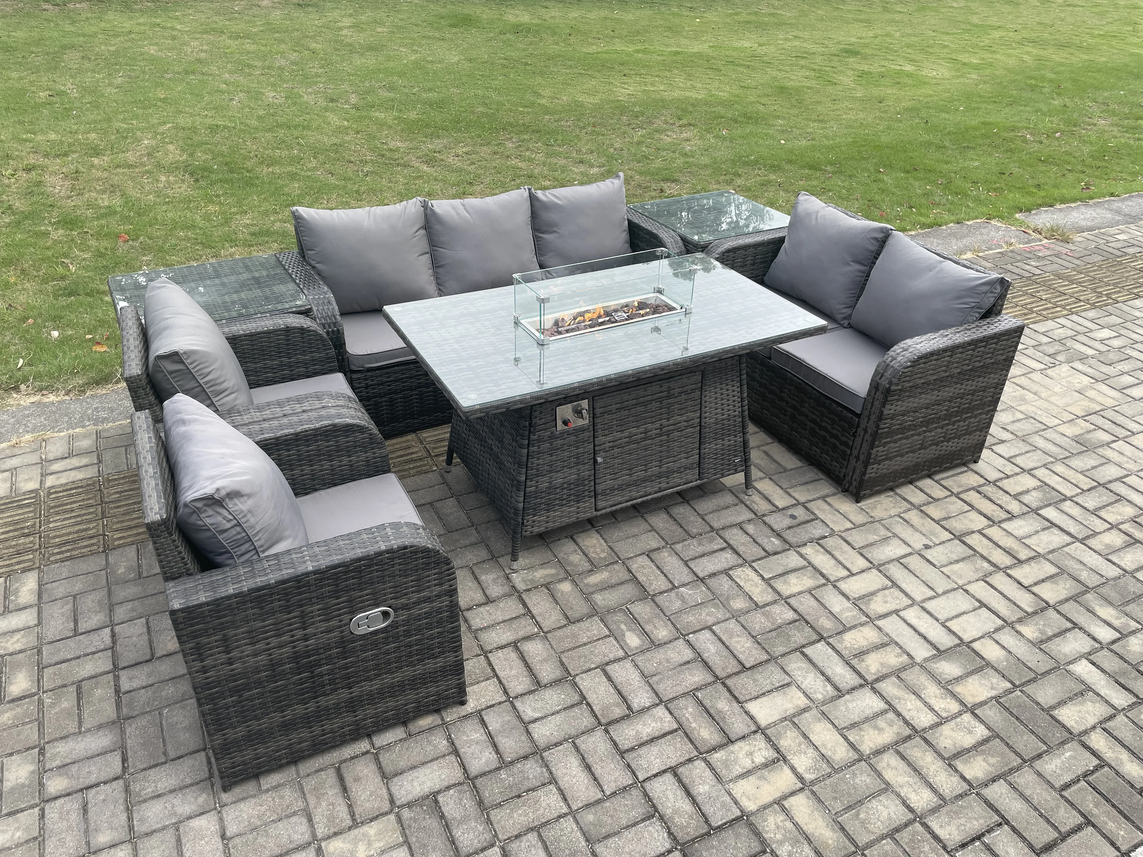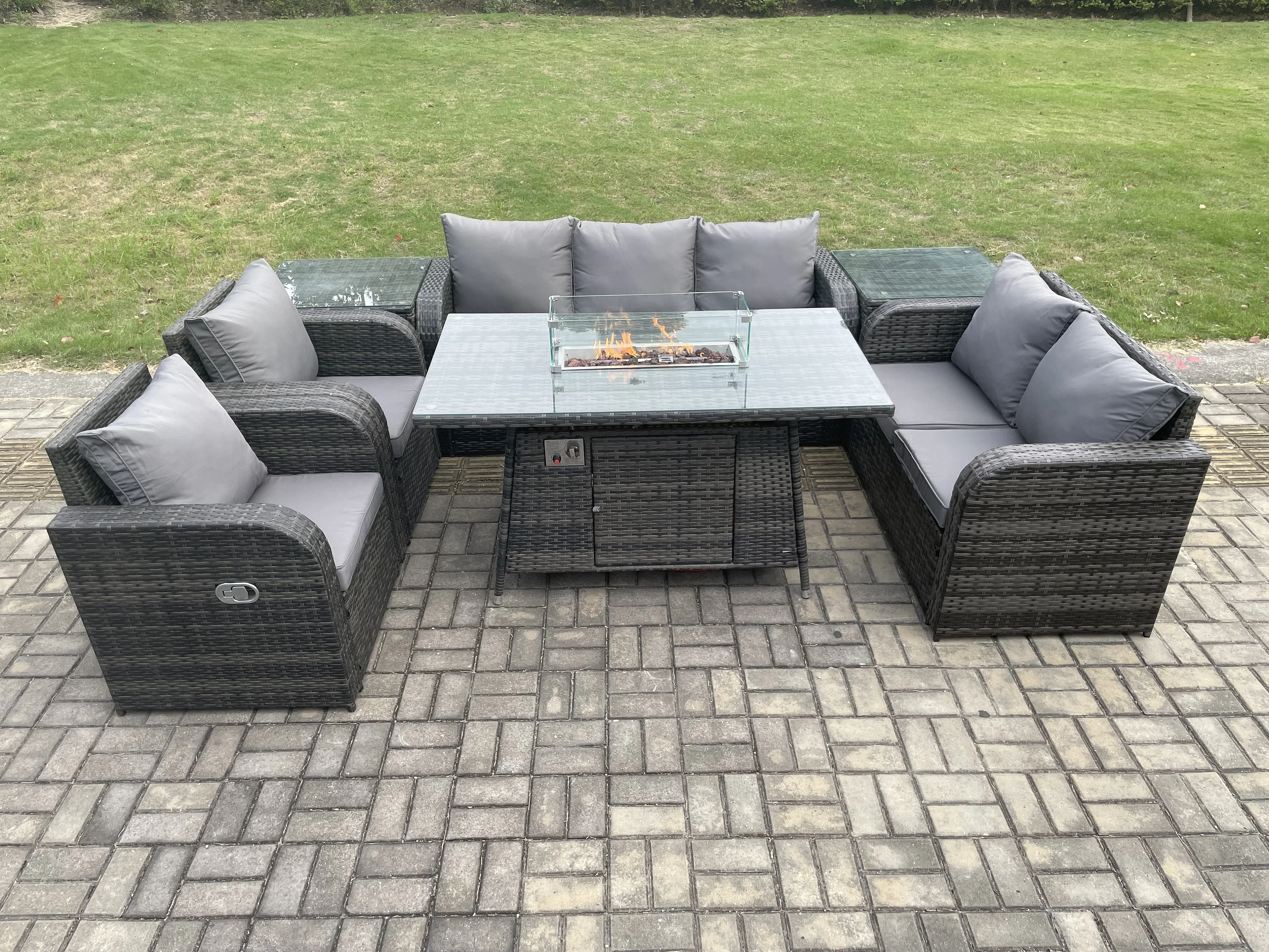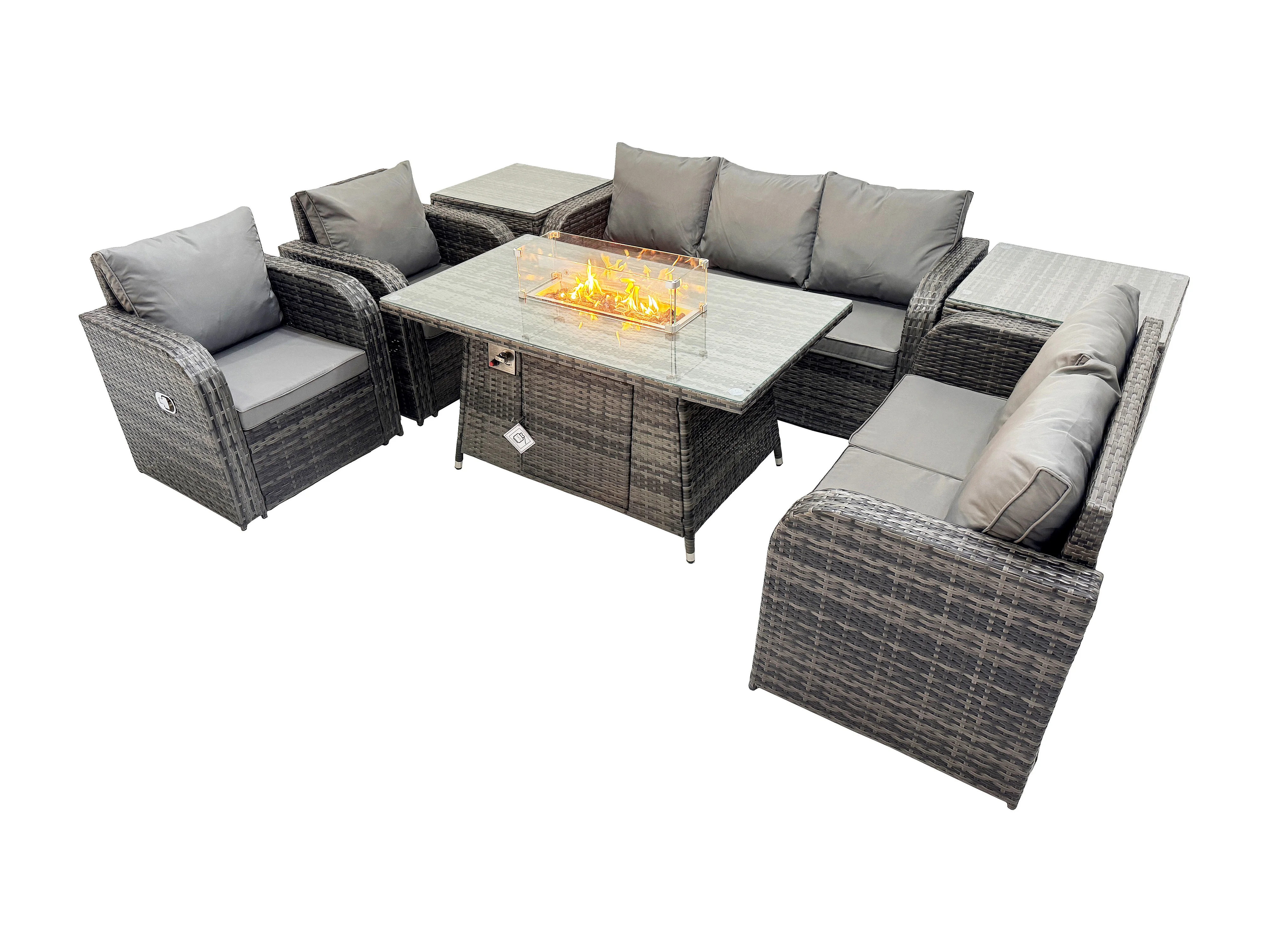 7-Sitzer Polyrattan Gartenmöbelset Gasfeuerstelle Esstisch und Sofa Sessel set mit 2 Beistelltischen