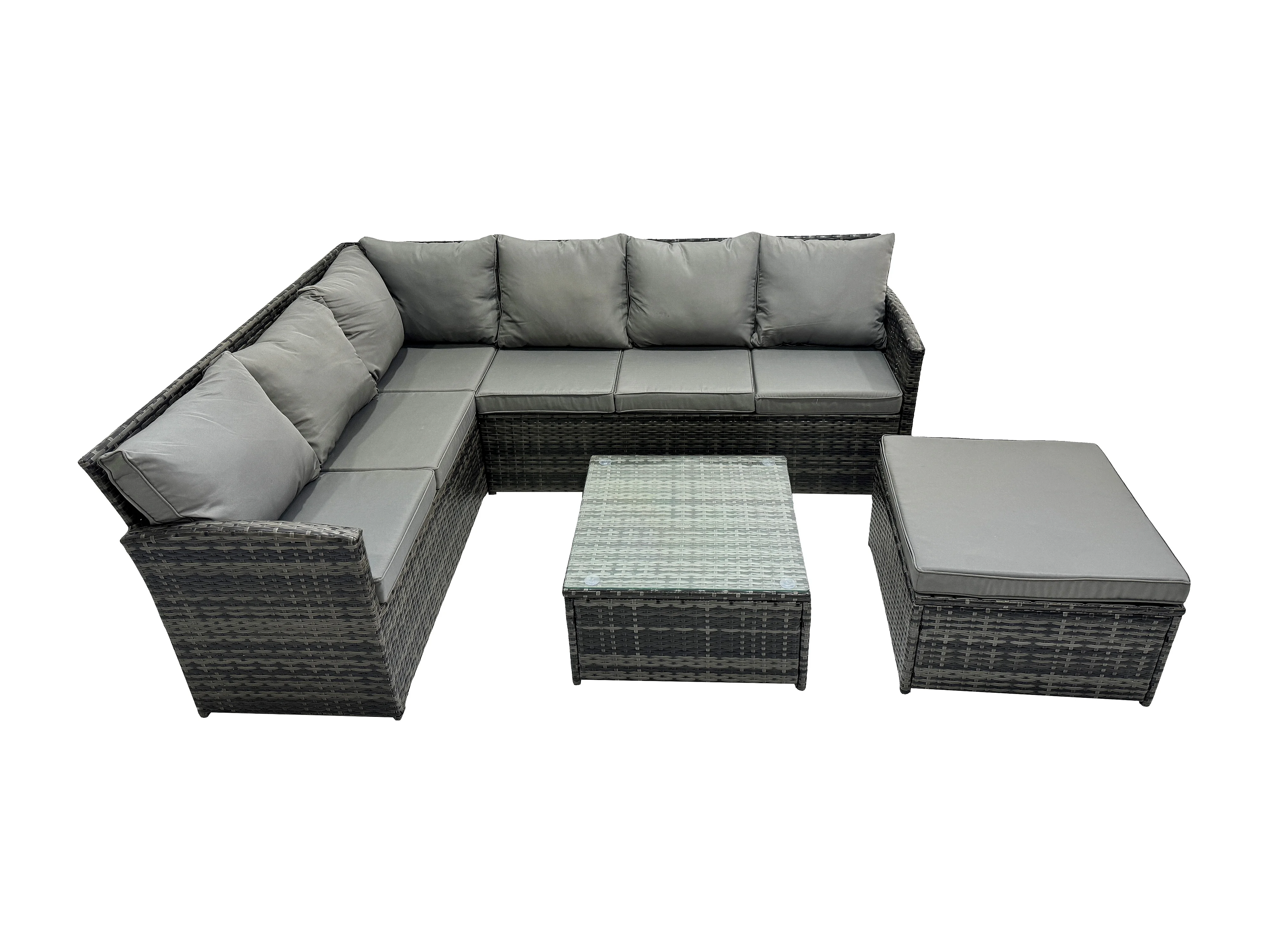 7 Sitzer Rattan Gartenmöbel Set Ecksofa Set aus Polyrattan mit Quadratischer Couchtisch Großer Fußhocker Dunkelgrau gemischt