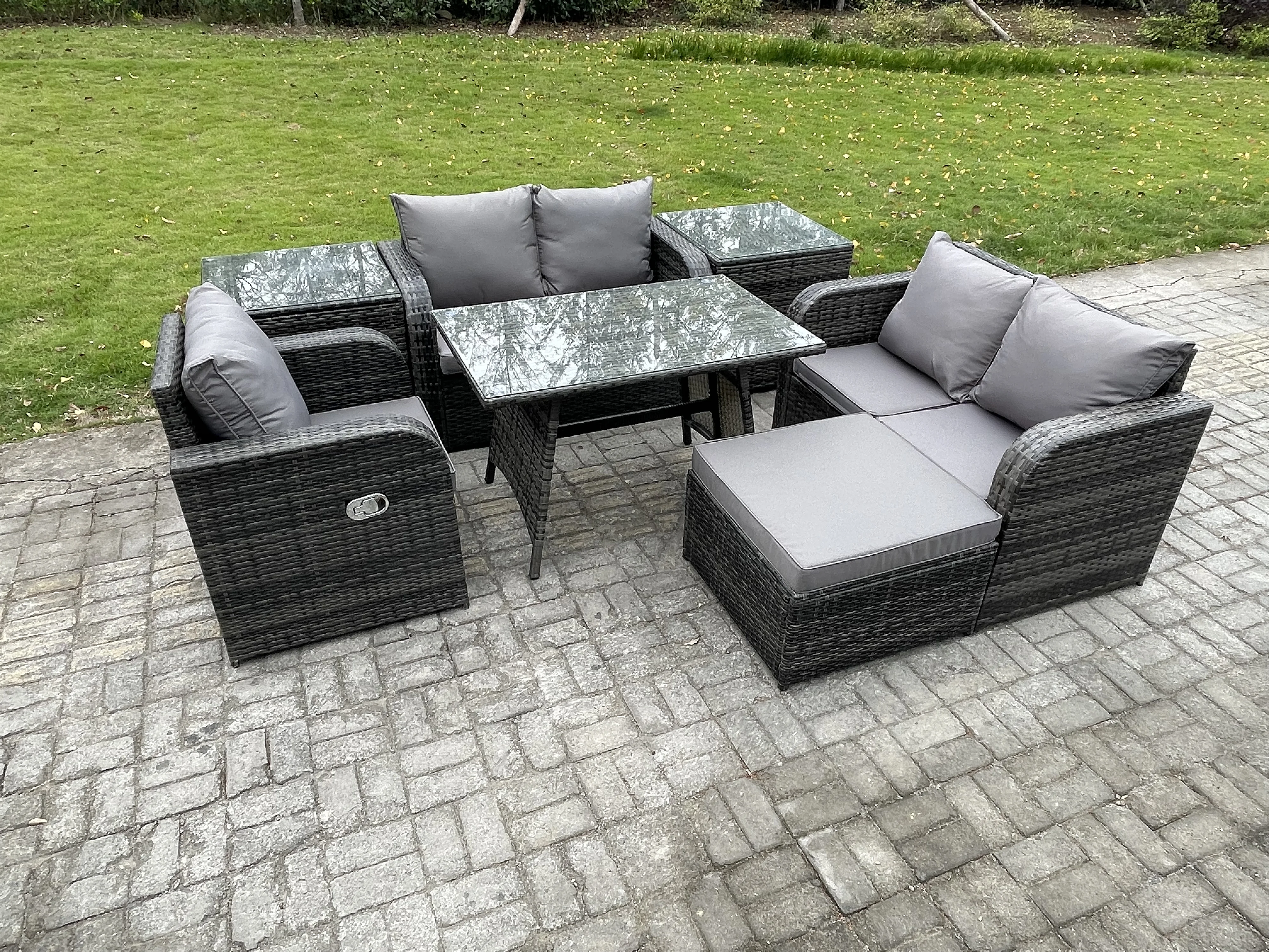 7 Stücke Polyrattan Gartenmöbel Set mit Esstisch Sesseln Love Sofa 2 Beistelltischen 2 Großer Hockern Dunkelgrau Gemischt