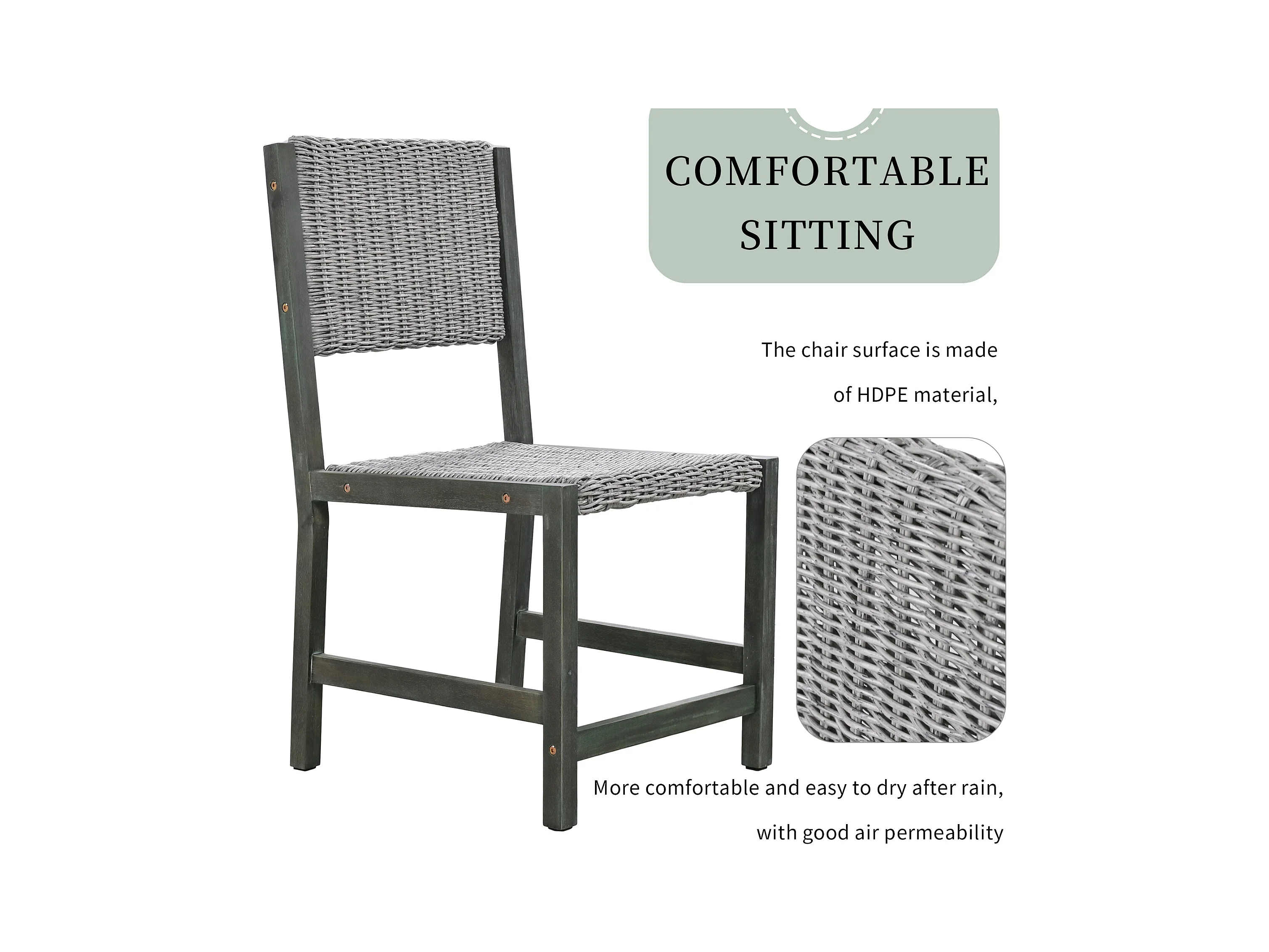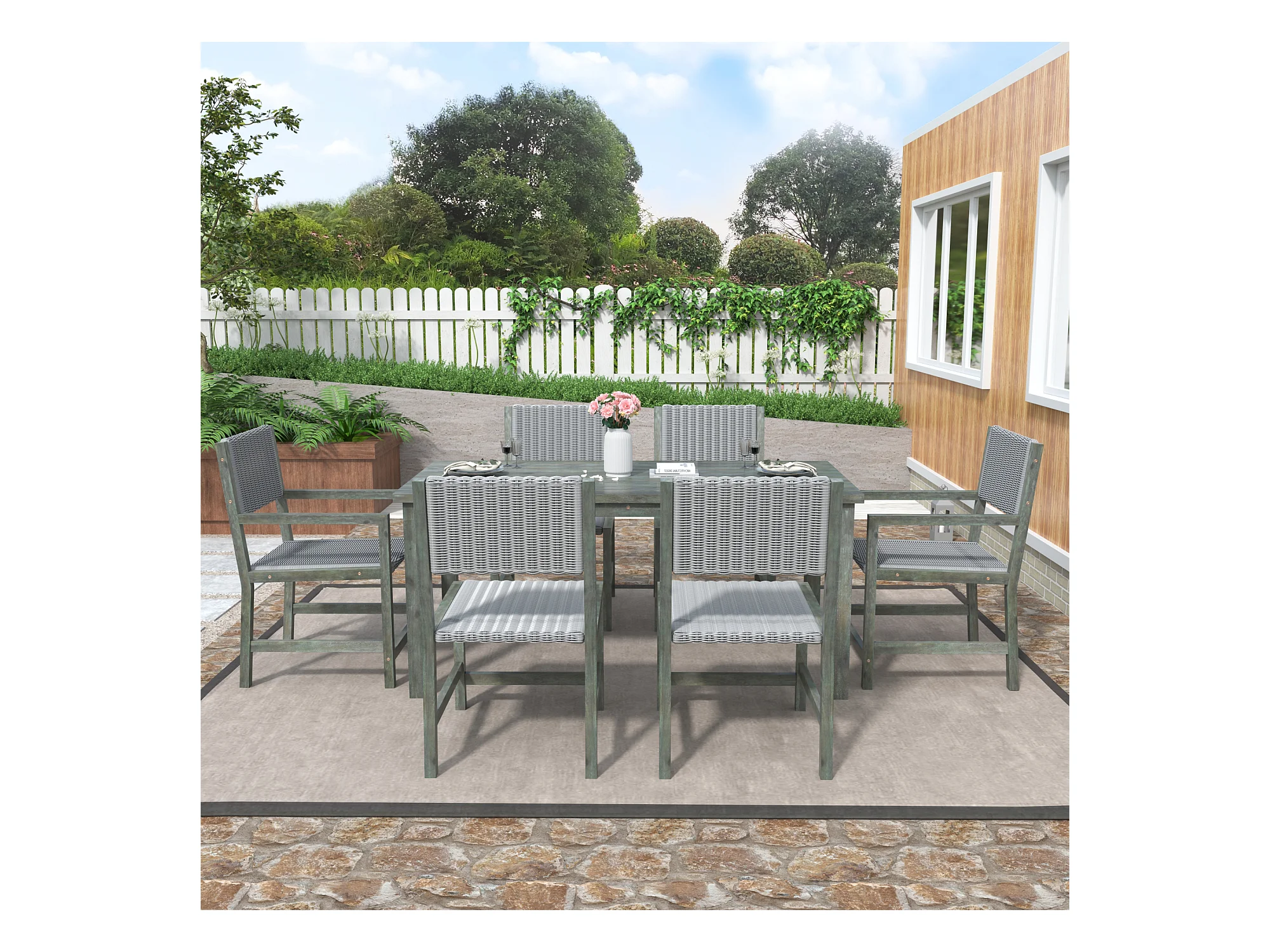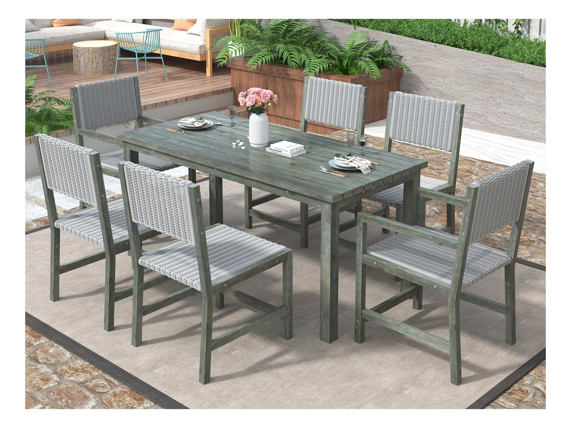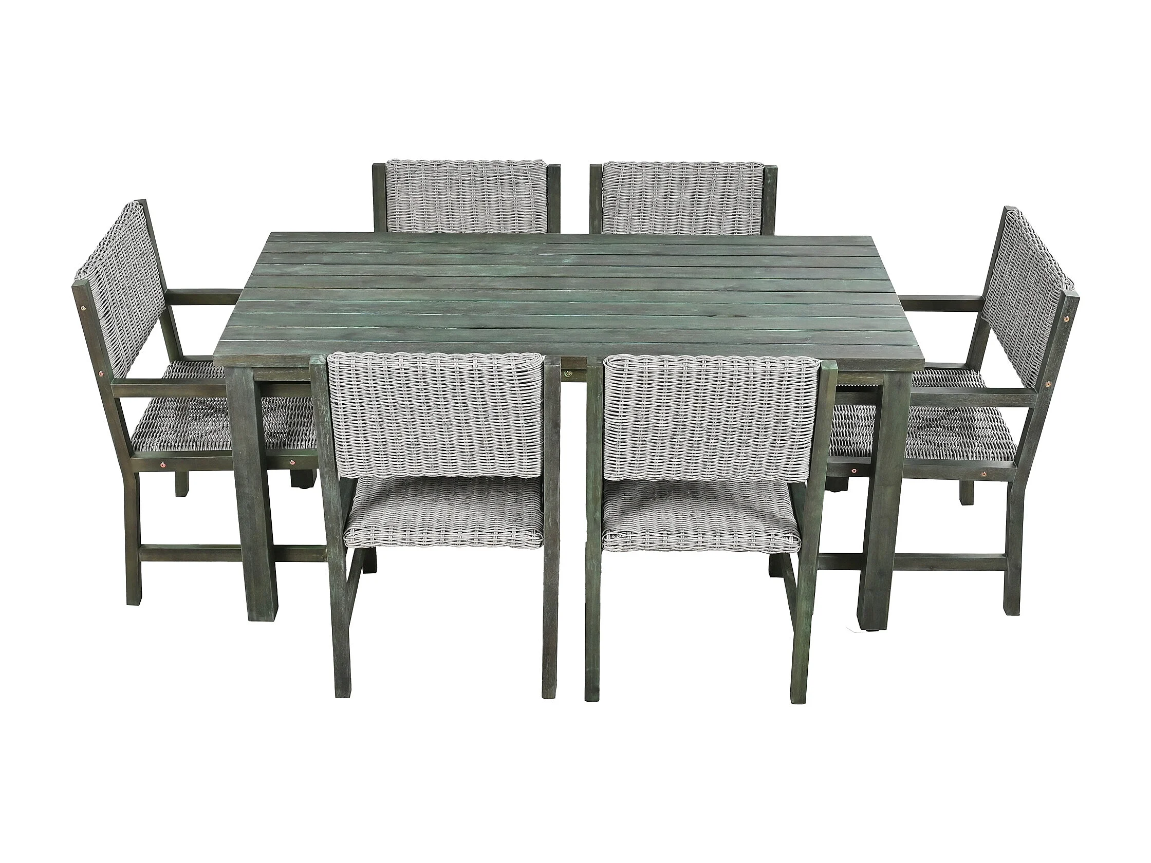 7-teiliges Outdoor-Esstischset für 6 Personen. aus HDPE-Rattan und Akazienholz – 1 Tisch + 6 Stühle – für Garten oder Terrasse – grün
