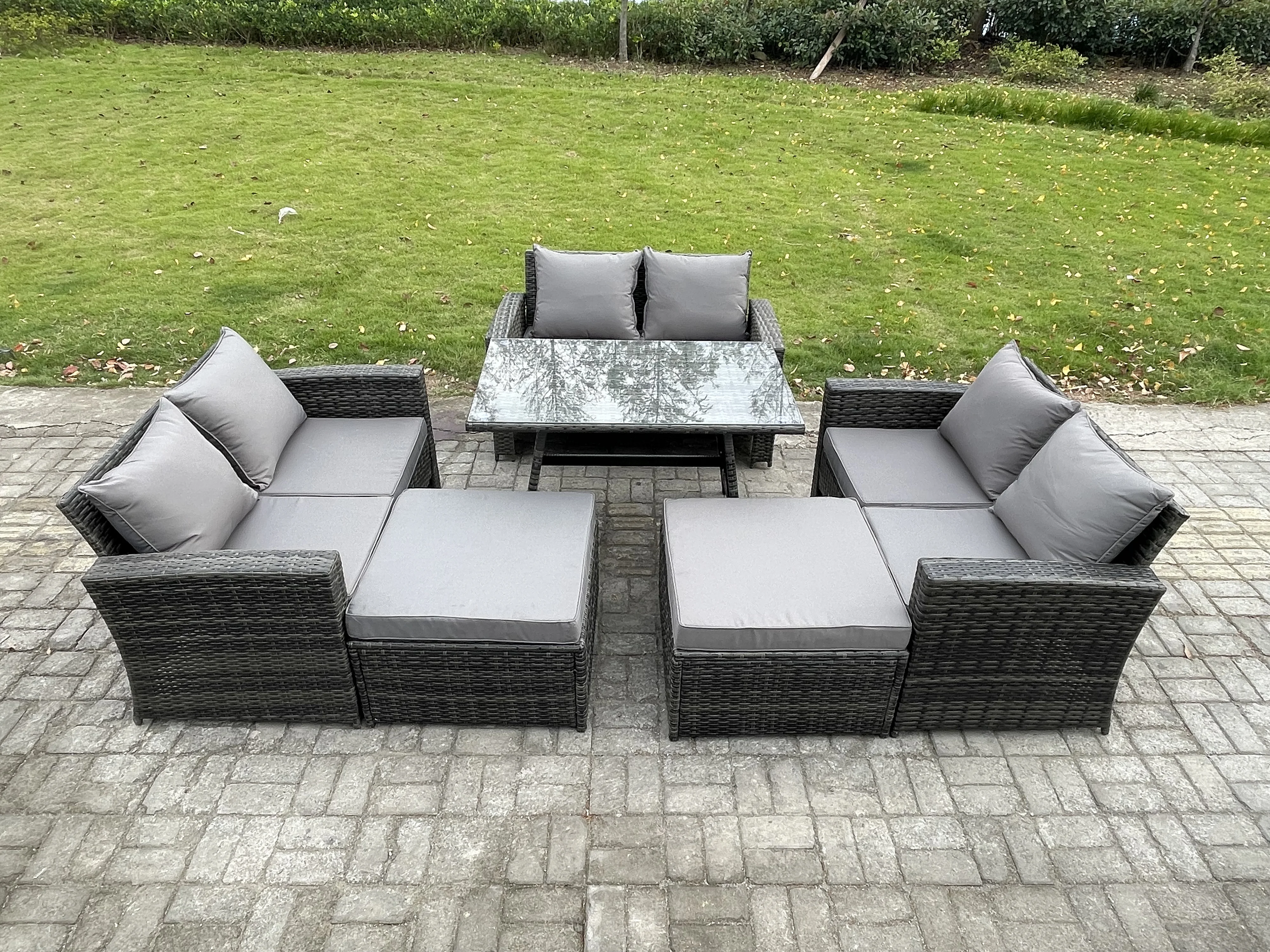 8-Sitzer Garten Esstisch Set Polyrattan Outdoor Möbel Sofa mit Rechteckiger Esstisch Doppelsitz Sofa 2 hohen Hockern Dunkelgrau Gemischt