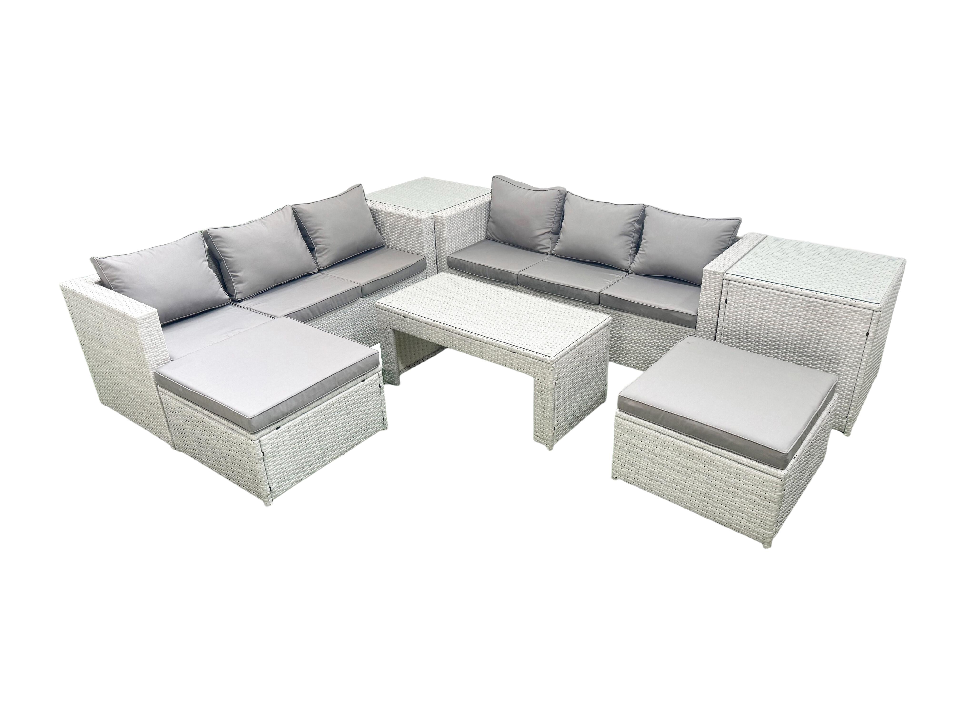 8-Sitzer Gartenmöbel-Set im Freien Polyrattan Garten Sofa Rechteckiger Couchtisch Set mit 2 hohen Hockern 2 Beistelltischen Hellgrau gemischt