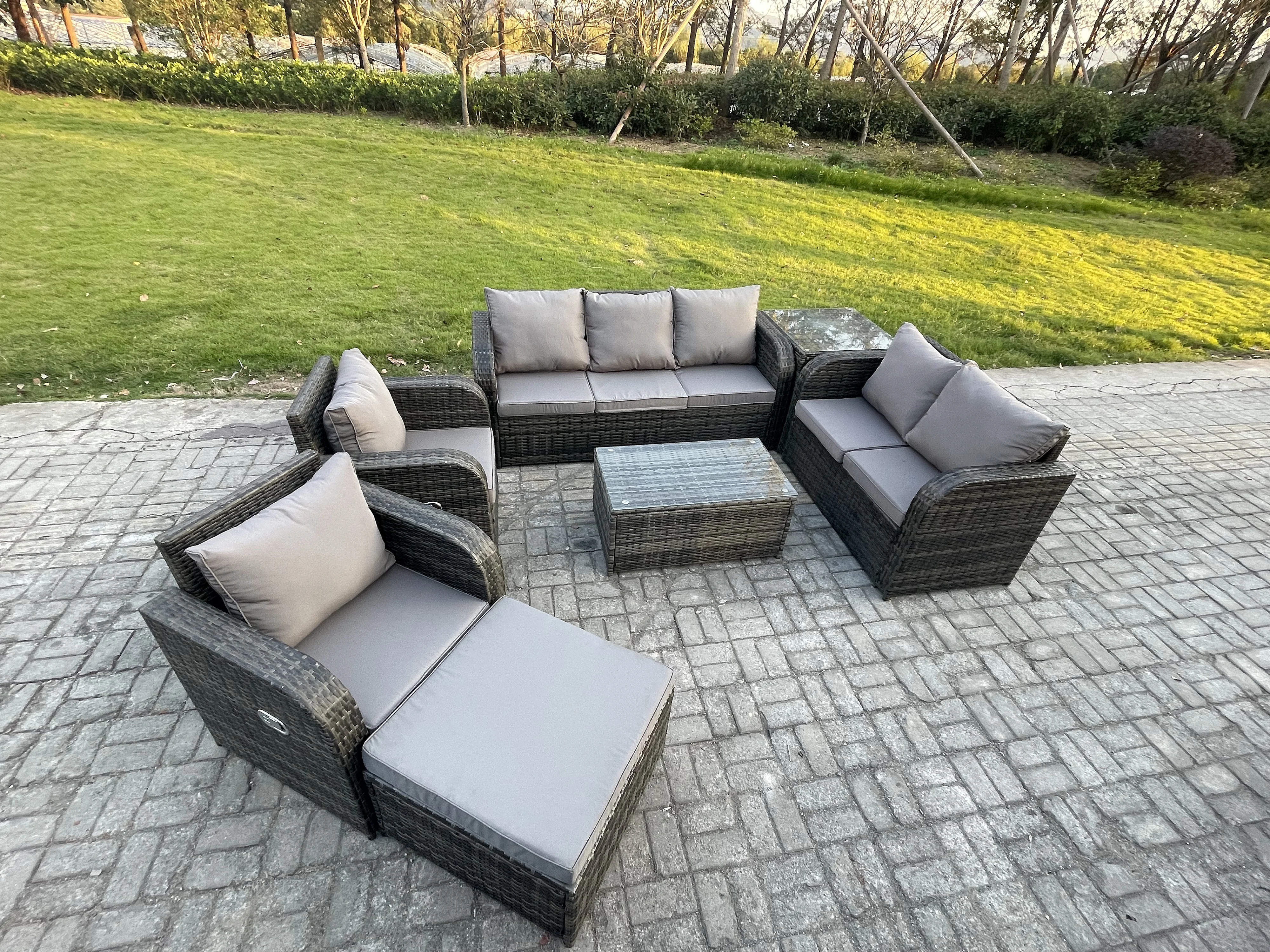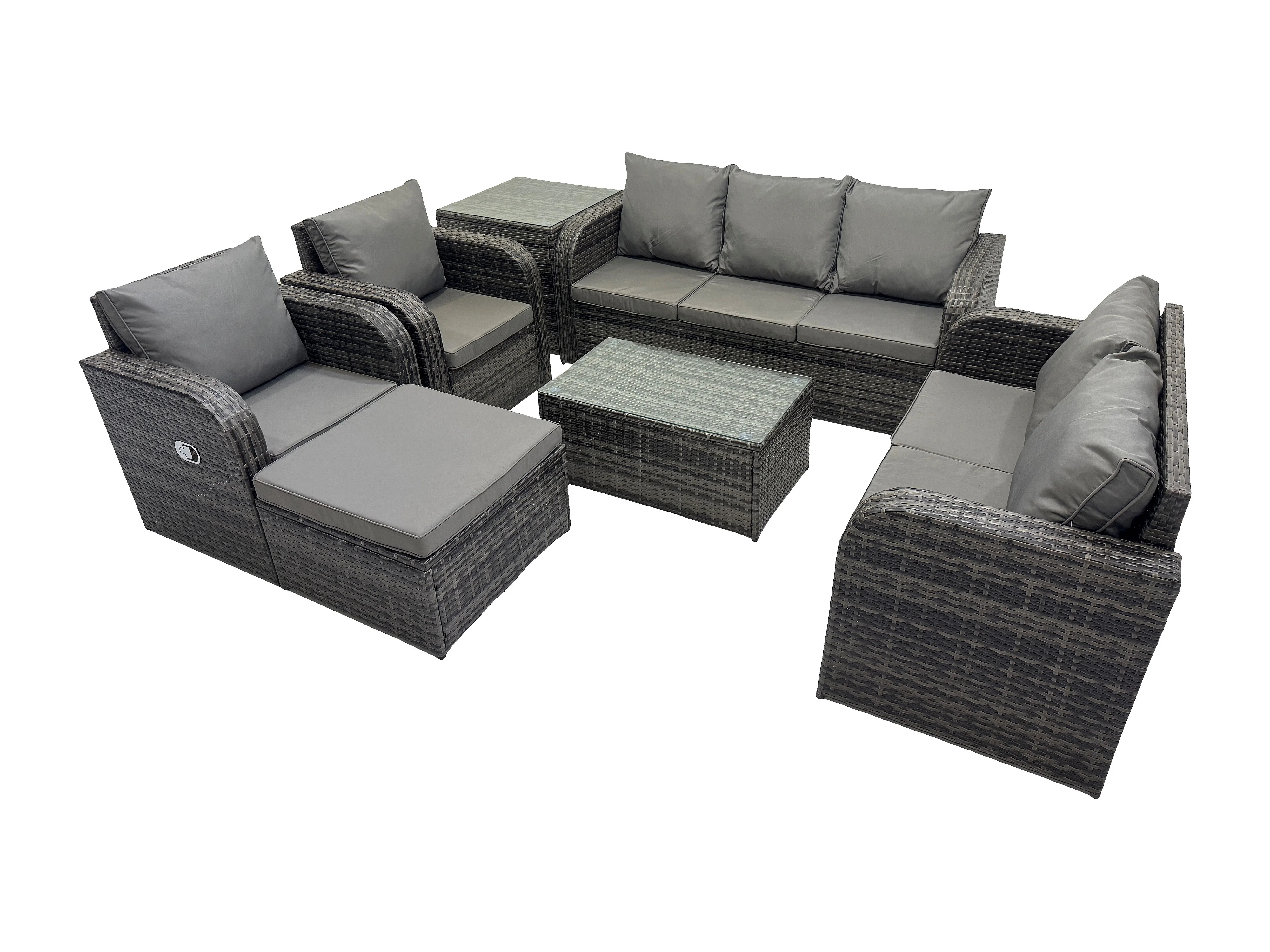 8-Sitzer Hoher Rücken Rattan Gartenmöbel Sets mit Rechteckiger Couchtisch 3-Sitzer Sofa Love Sofa 2 Großer Hockern Beistelltisch