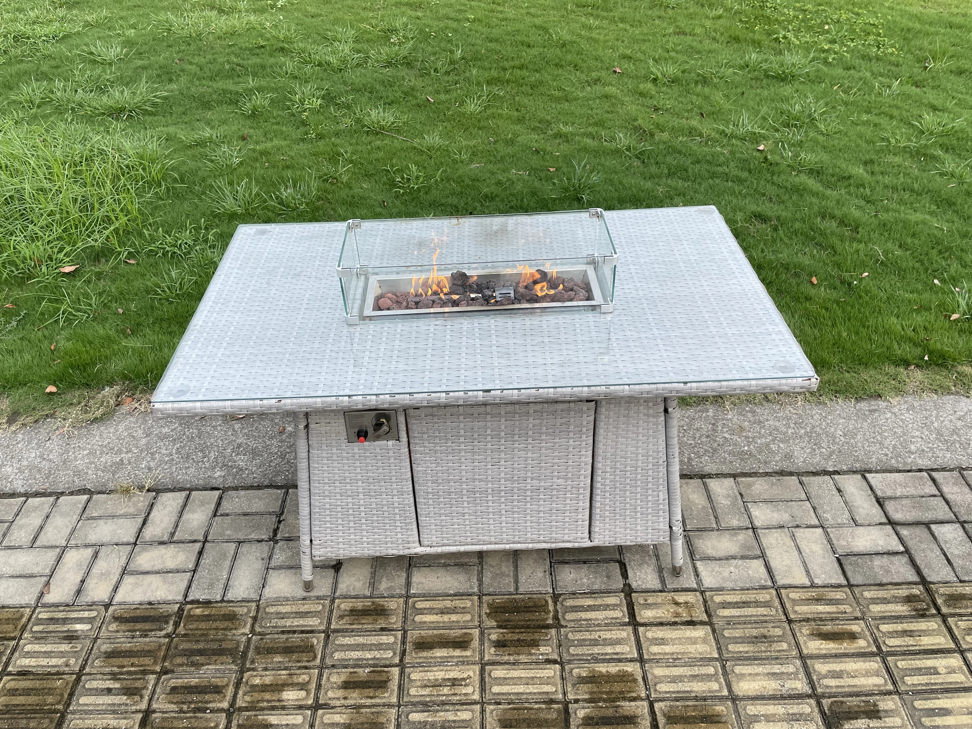 8-Sitzer Polyrattan Gartenmöbel Set mit Sofa, Gas Feuertisch und 2 Sessel,Beistelltisch,3 Hocker Outdoor Terrassen Essgruppe Helles Grau