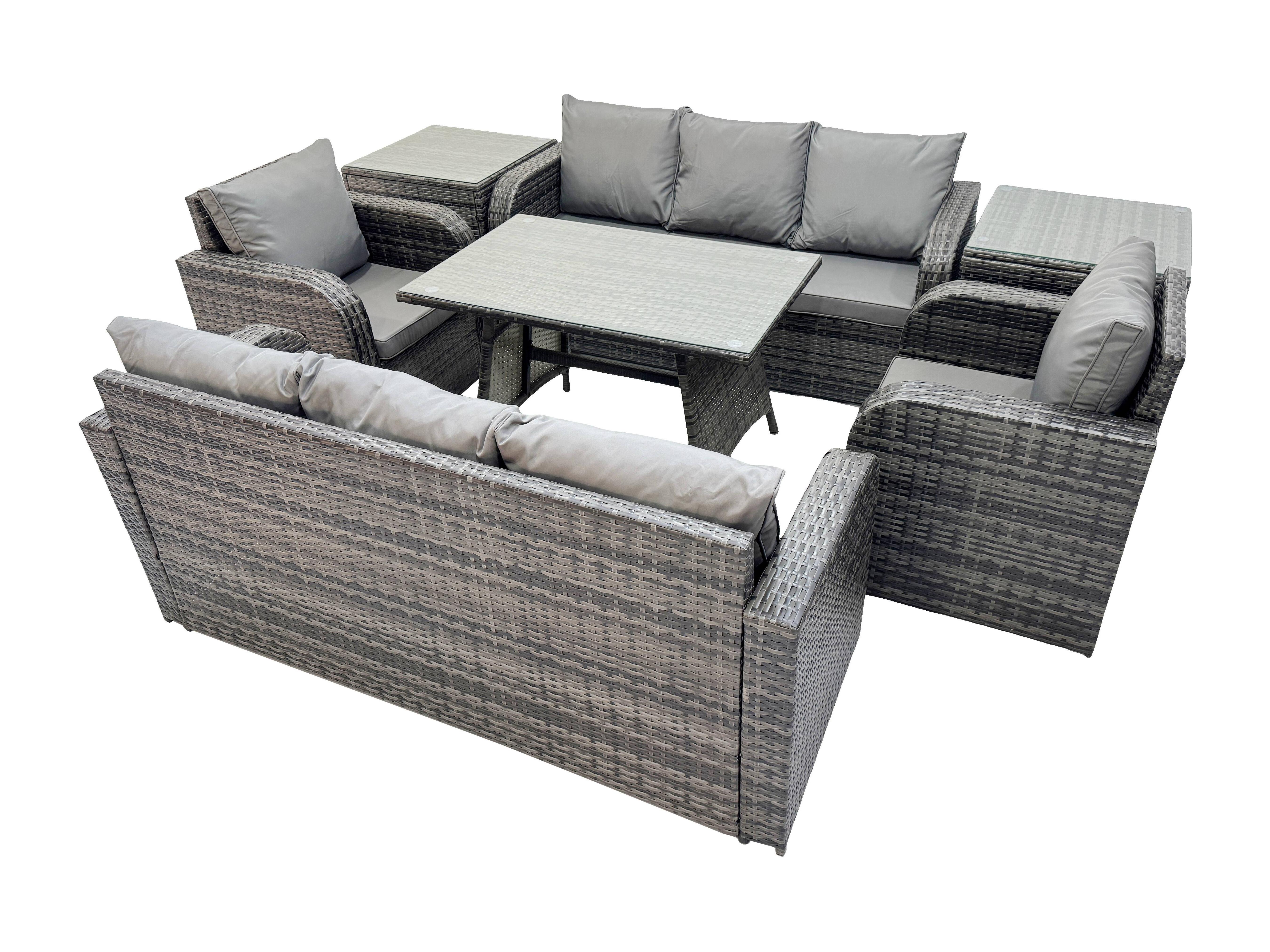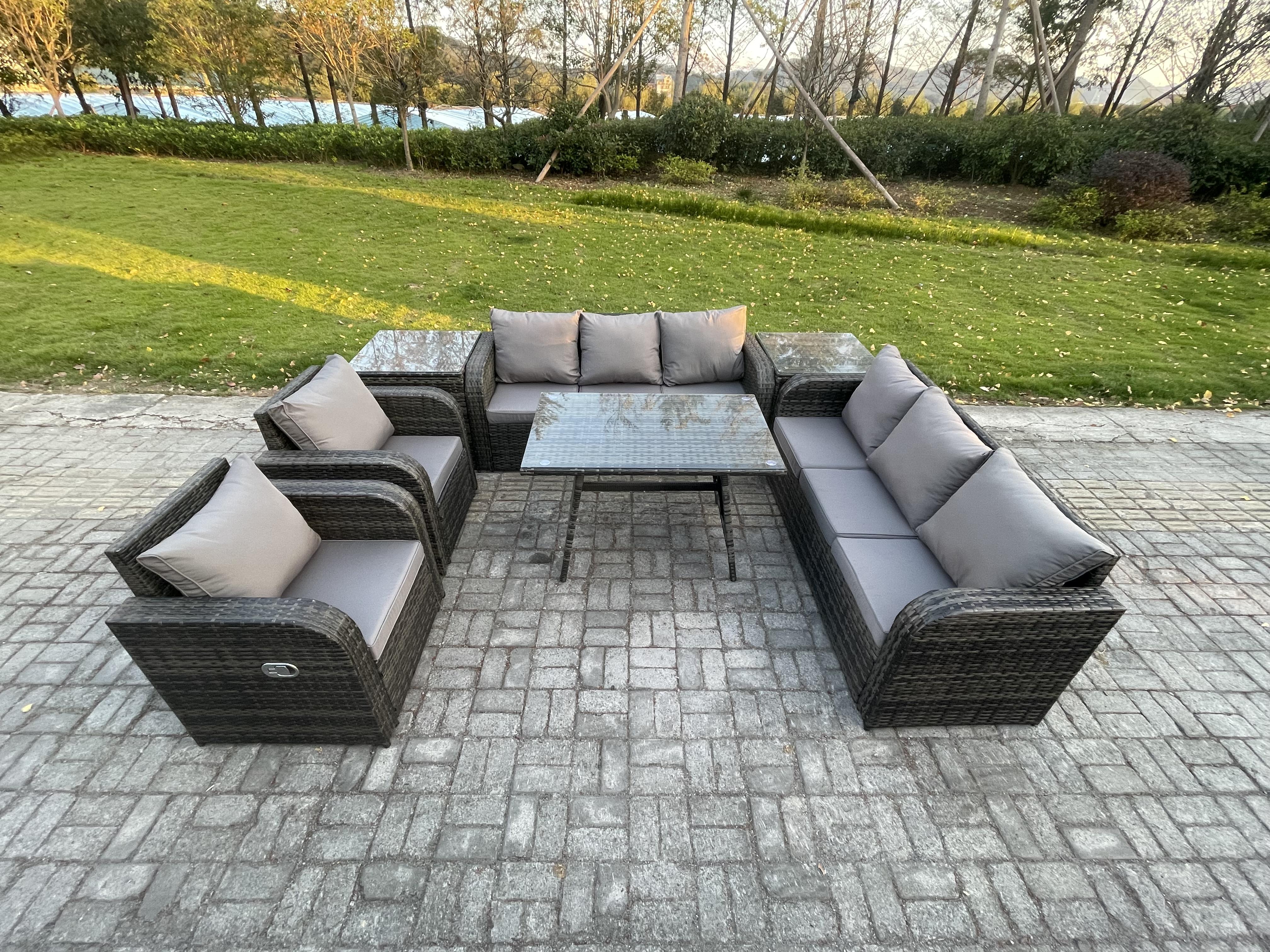 8-Sitzer Rattan Gartenmöbel Sofa Set Tisch & Stühle Set mit 3-Sitzer Sofa Rechteckiger Esstisch 2 Beistelltischen Dunkelgrau Gemischt