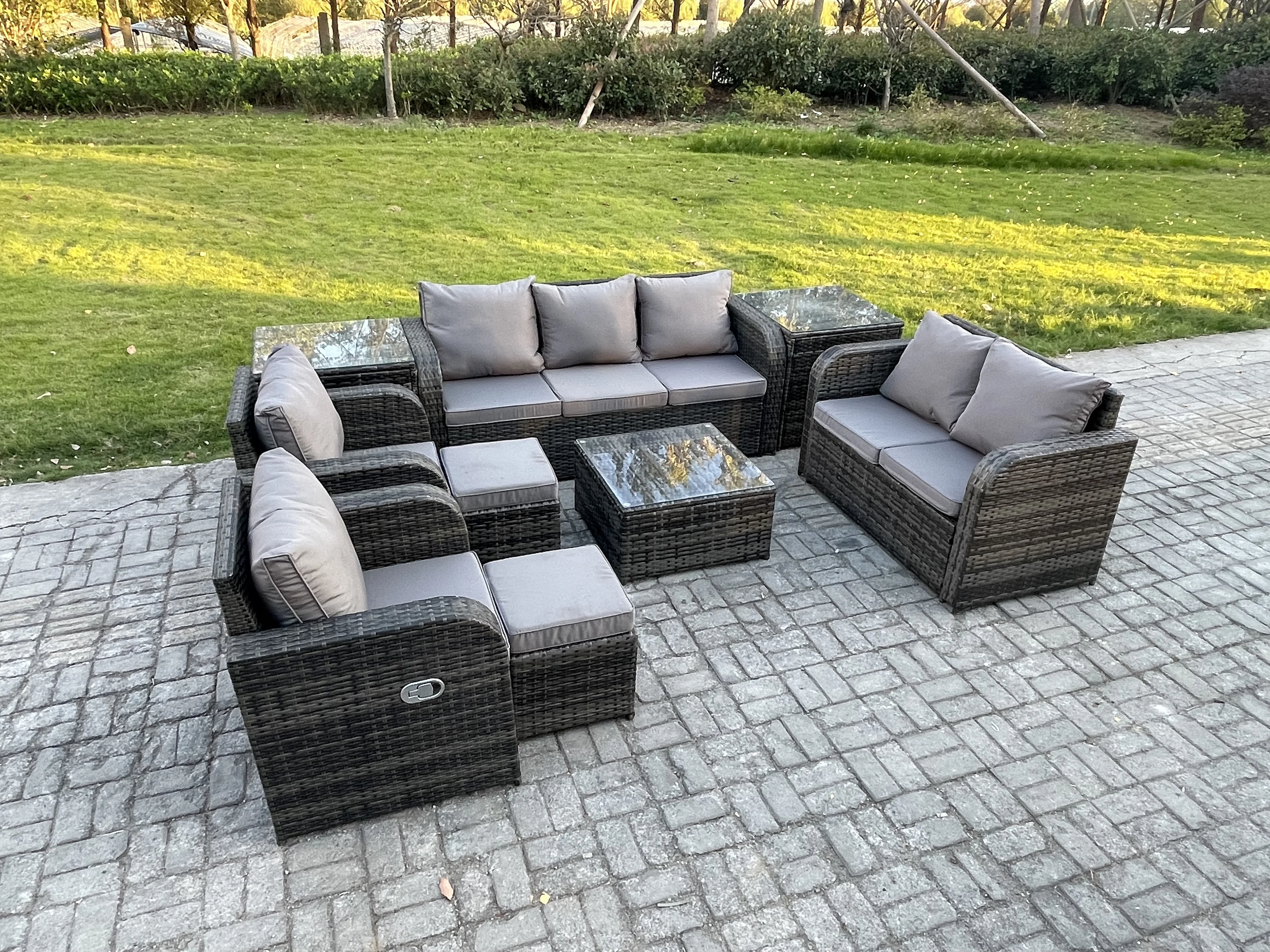 9-Sitzer Gartenmöbelset Rattan Garten Sofa im Freien Sessel mit Gehärteter Glastisch 2 kleine Fußhockern 2 Beistelltischen Dunkelgrau Gemischt