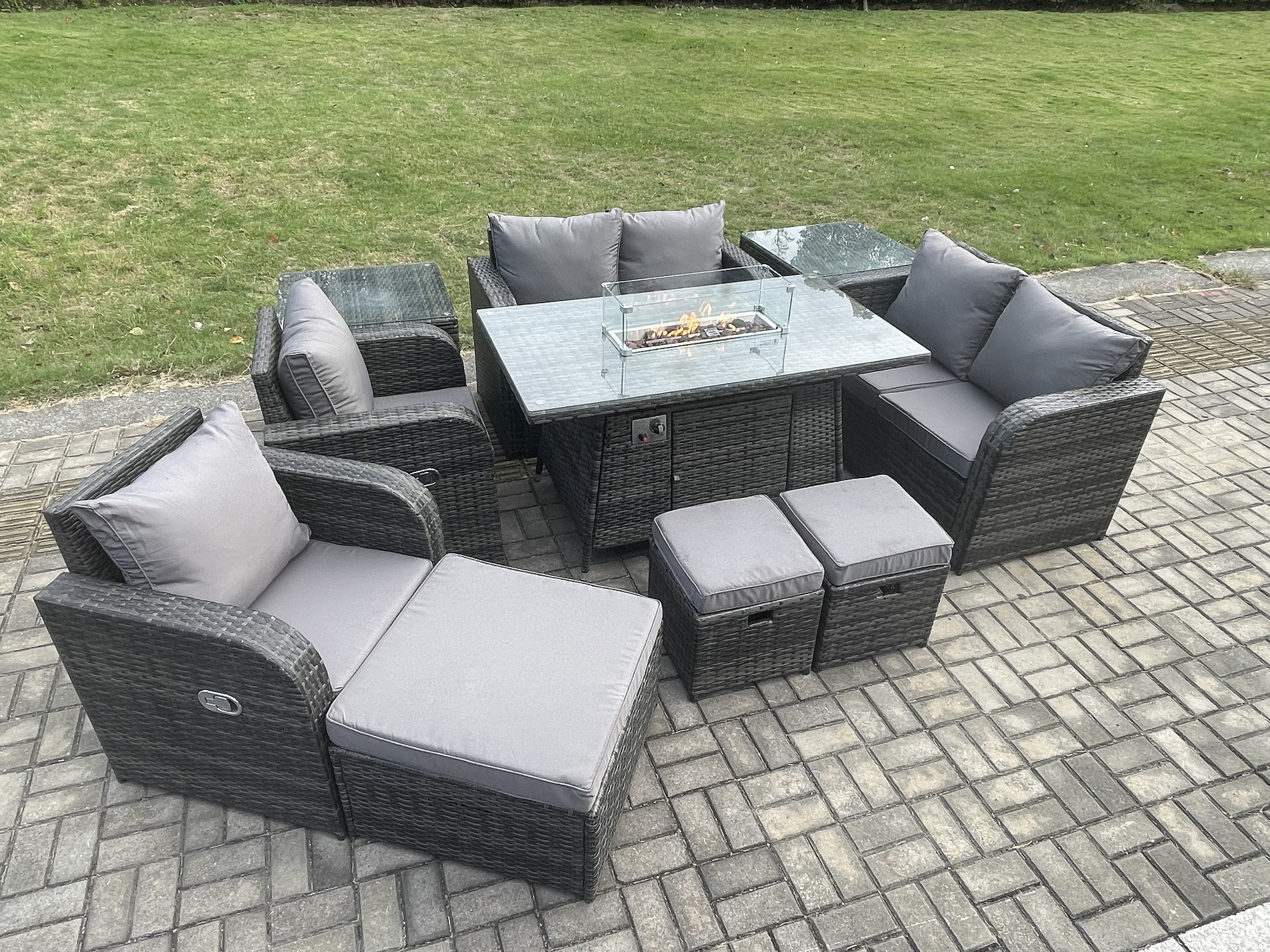 9-Sitzer Gartensofa Garnitur mit Gas Feuerstelle Dunkelgrau
