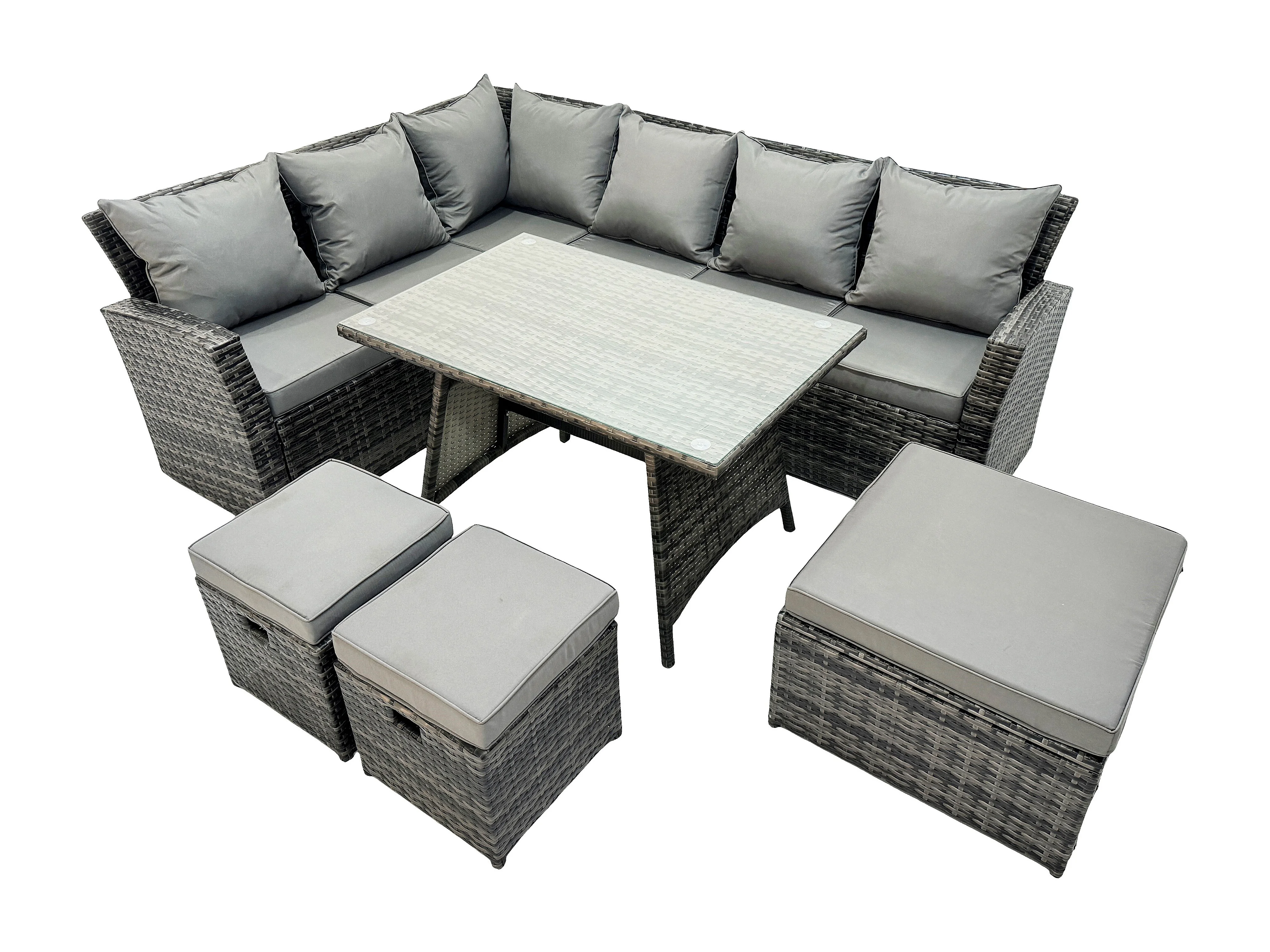 9 Sitzer Hoher Rücken Rattan Gartenmöbel-Set Ecksofa mit Länglicher Esstisch 3 Hockern