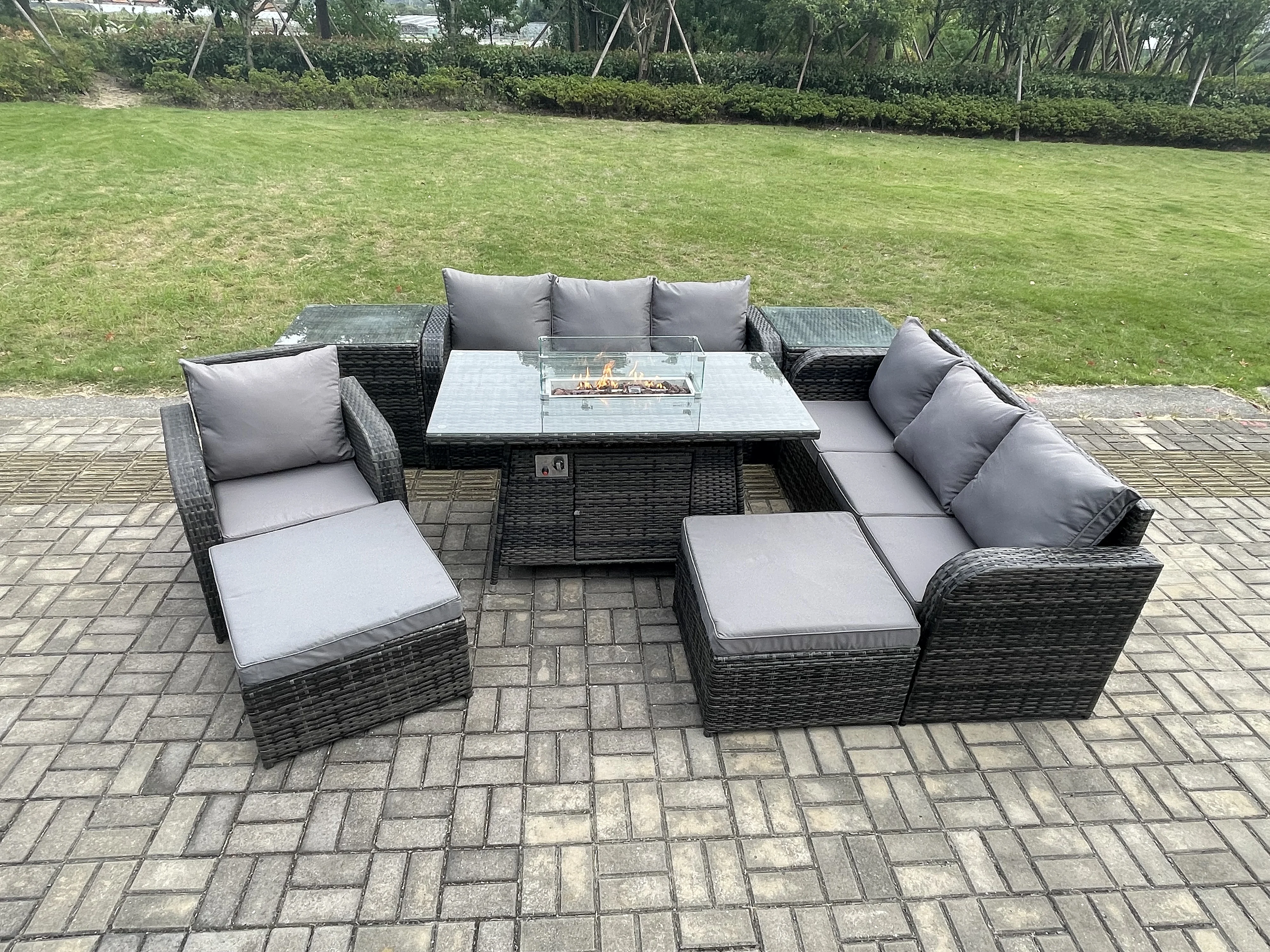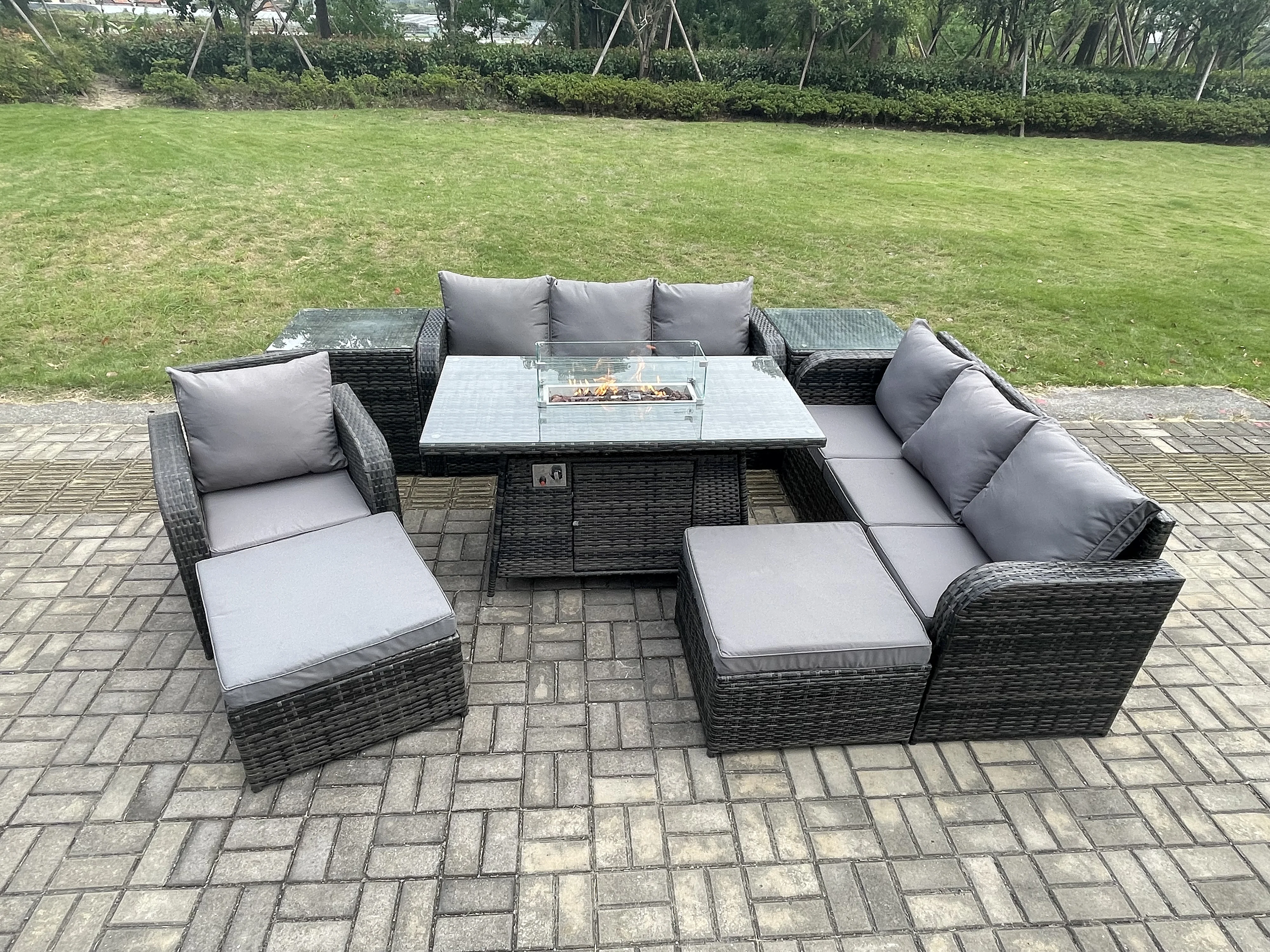 9-Sitzer Polyrattan Gartenmöbel Set Gas Feuerstelle Esstisch Liegestühle 3-Sitzer Sofa Set mit 2 Beistelltischen 2 hohen Hockern