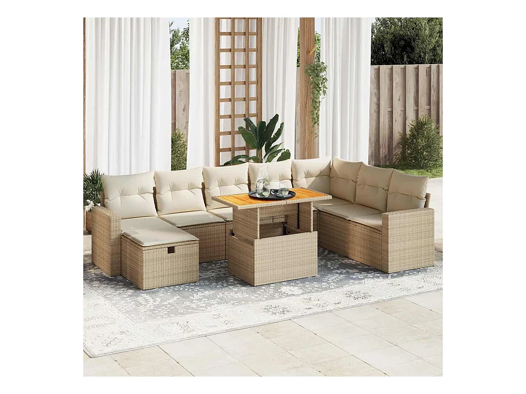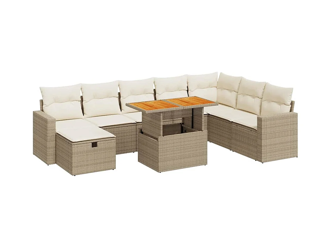 9-tlg. Garten-Sofagarnitur mit Kissen Beige Poly Rattan Akazie