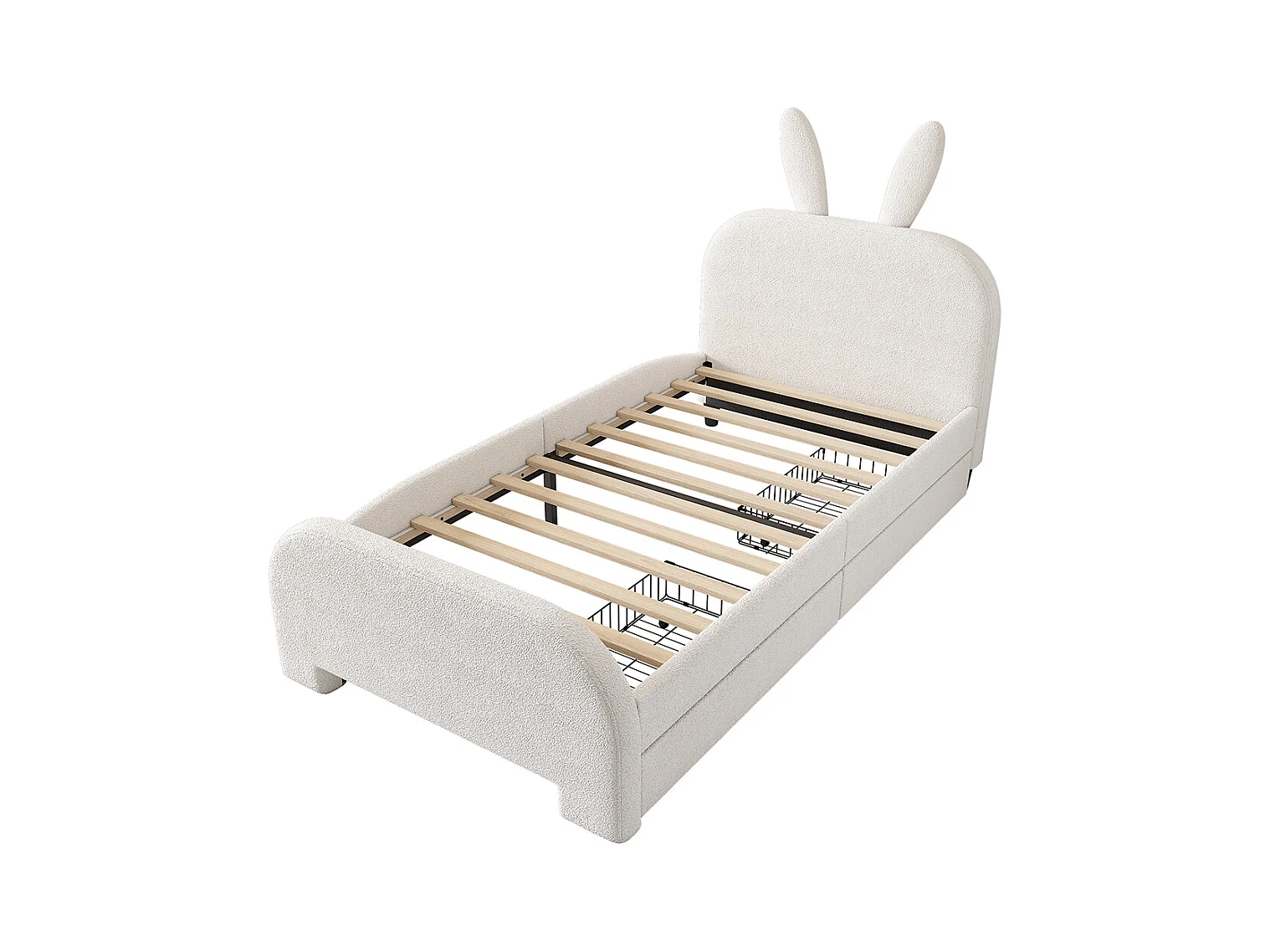 90*200cm Flaches Bett, gepolstert, Schafwolle resistent, Cartoon Kaninchenform, zwei Schubladen,Weiß