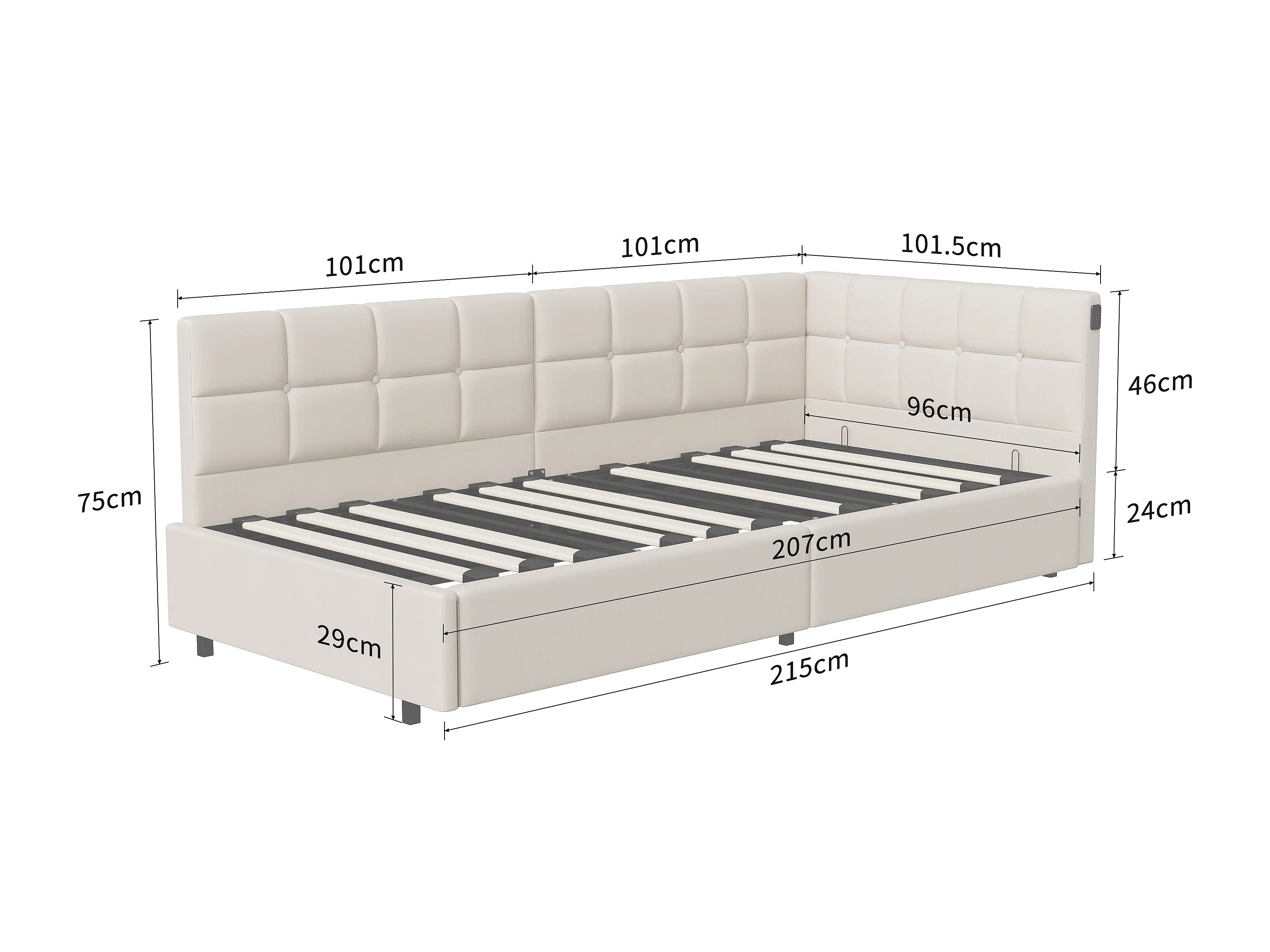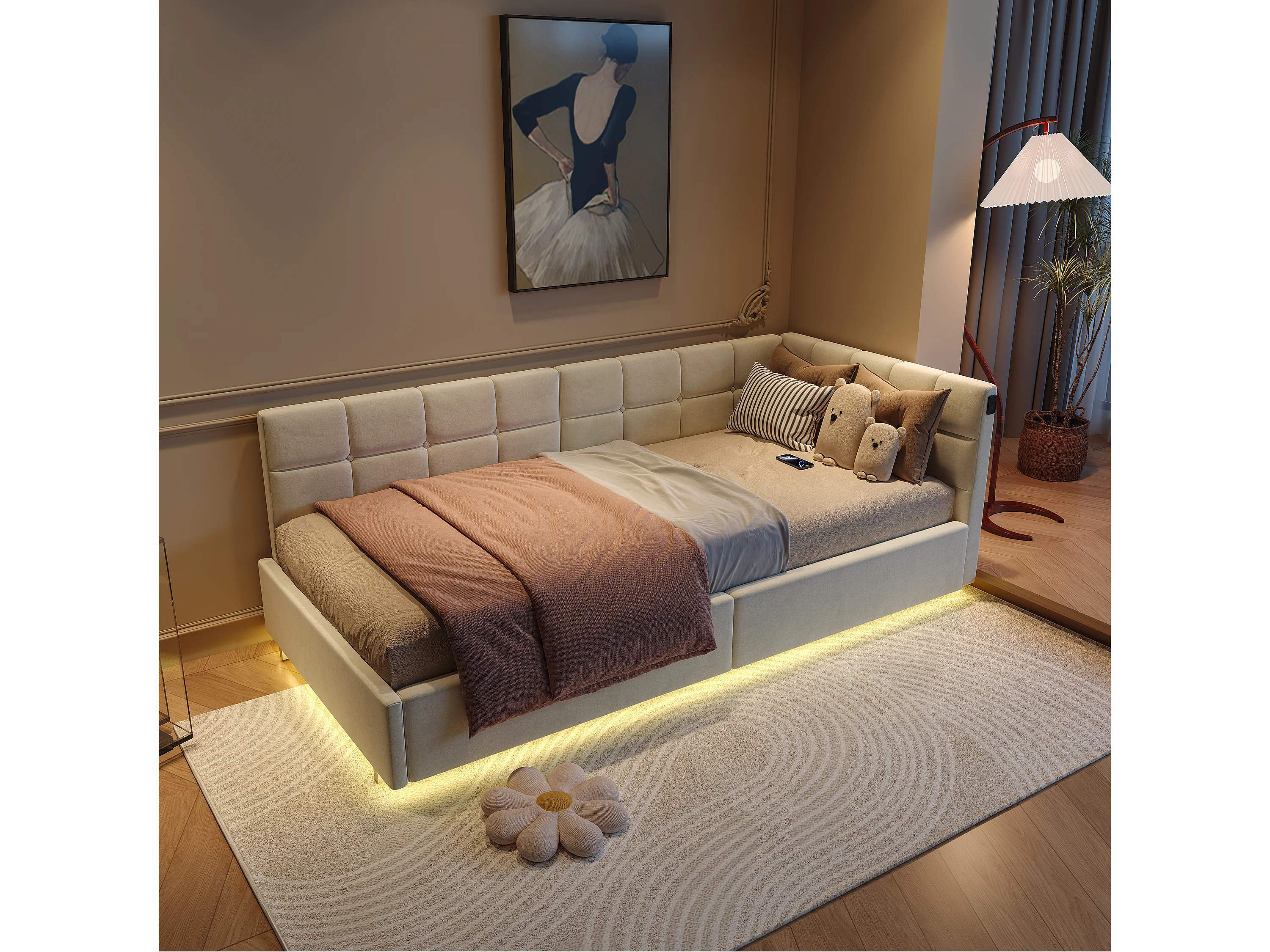 90 x 200 cm Bett mit LED-Kopfteil und Stauraum, USB- und Typ-C-Ladefunktion, RGB-Beleuchtung mit Fernbedienung, beigefarbenes Samtstoffdesign