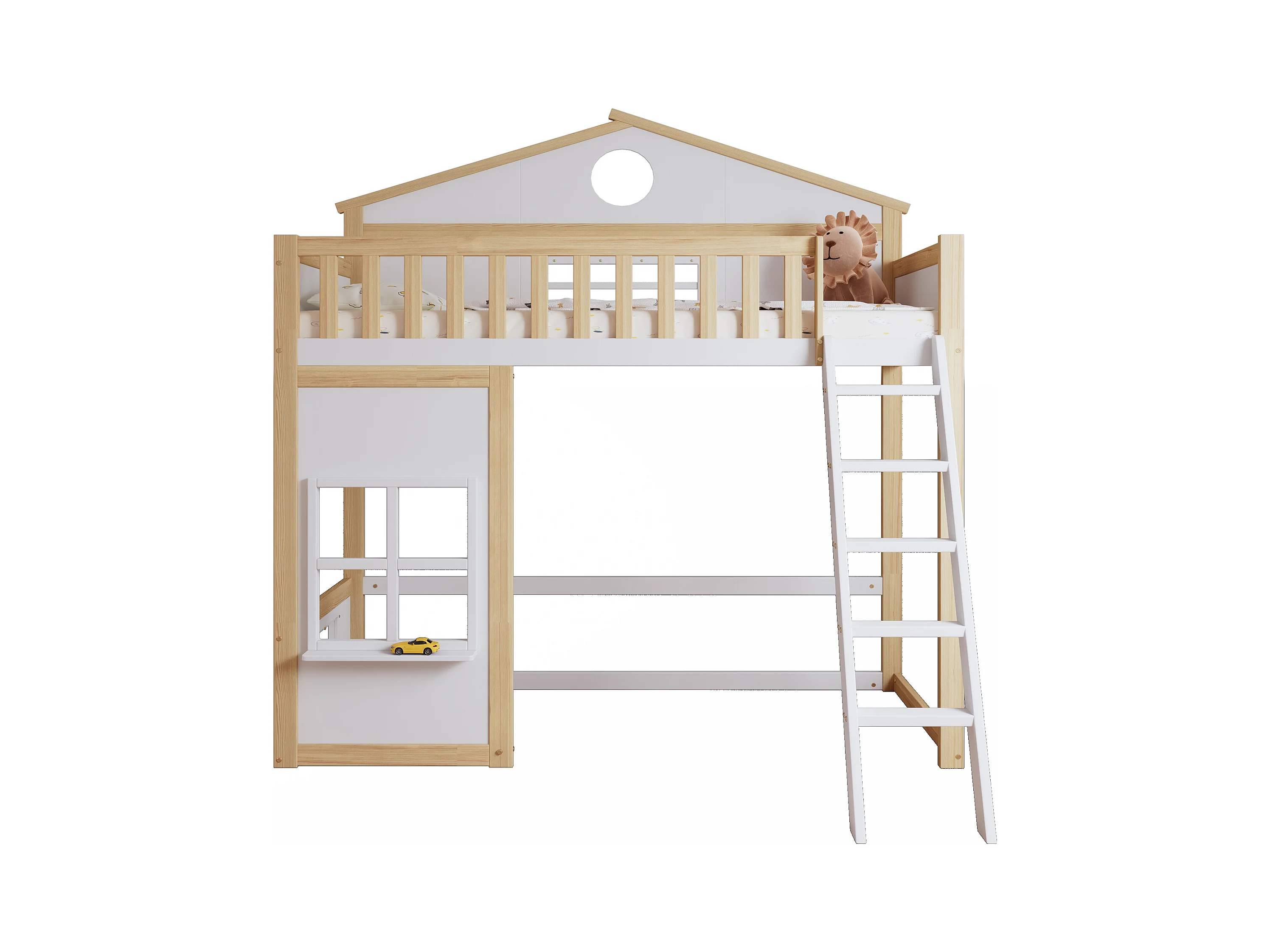 90 x 200 cm großes Etagenbett aus Holz – mit Treppe und Sicherheitsbarrieren – Weiß und Natur