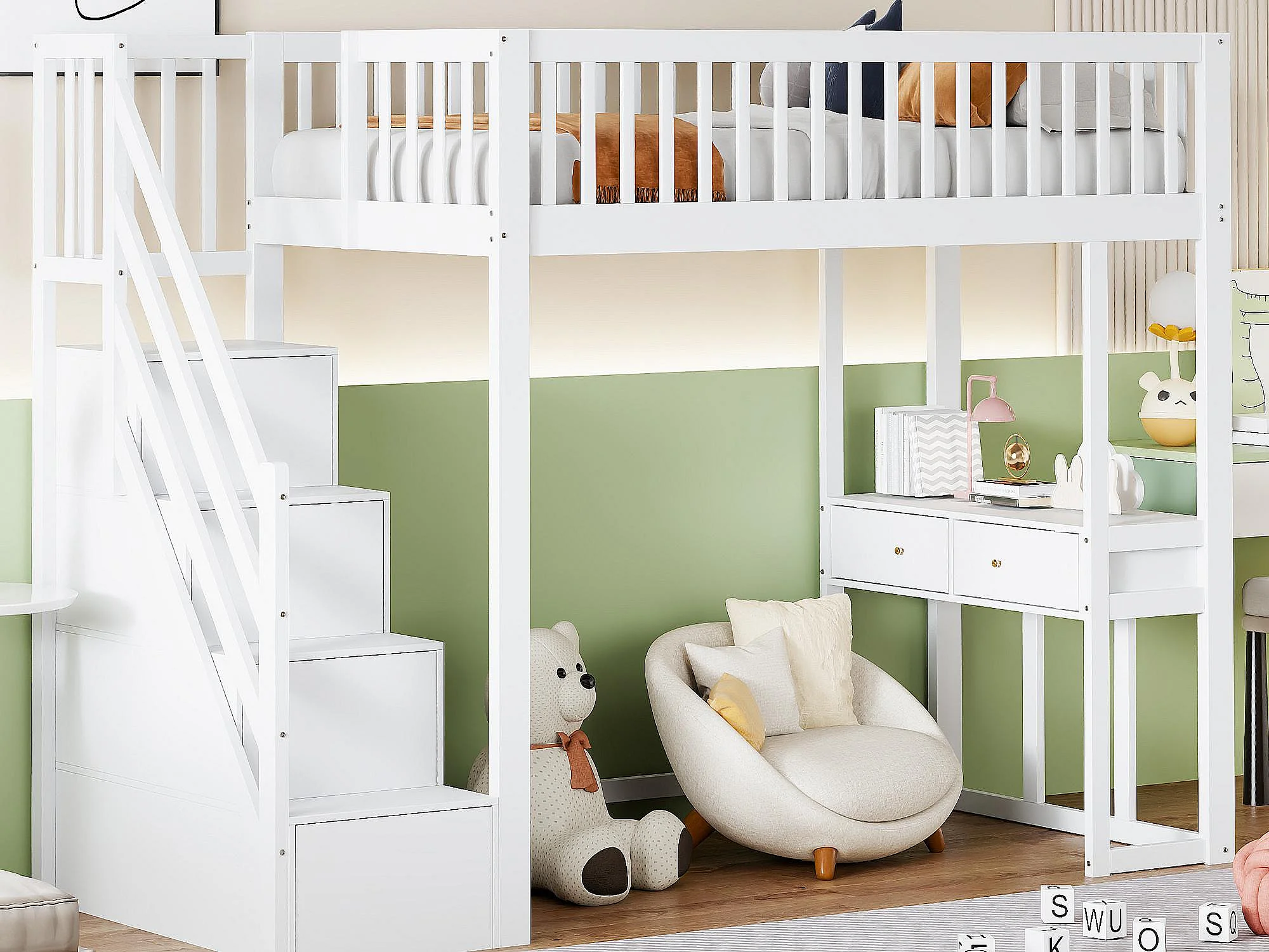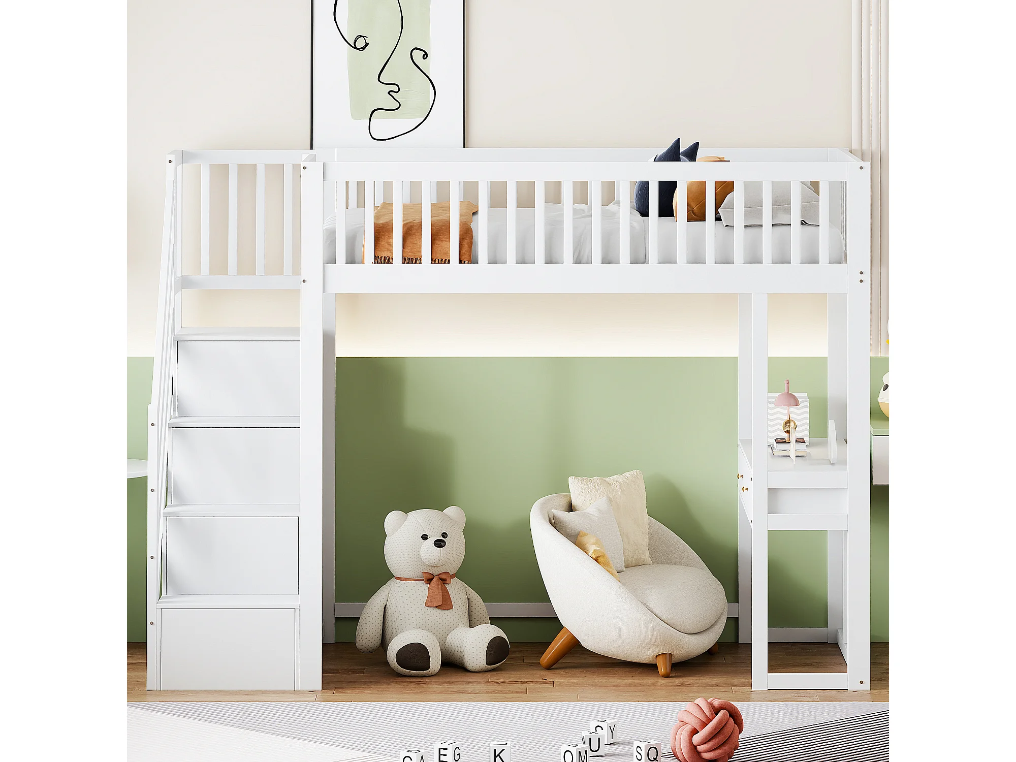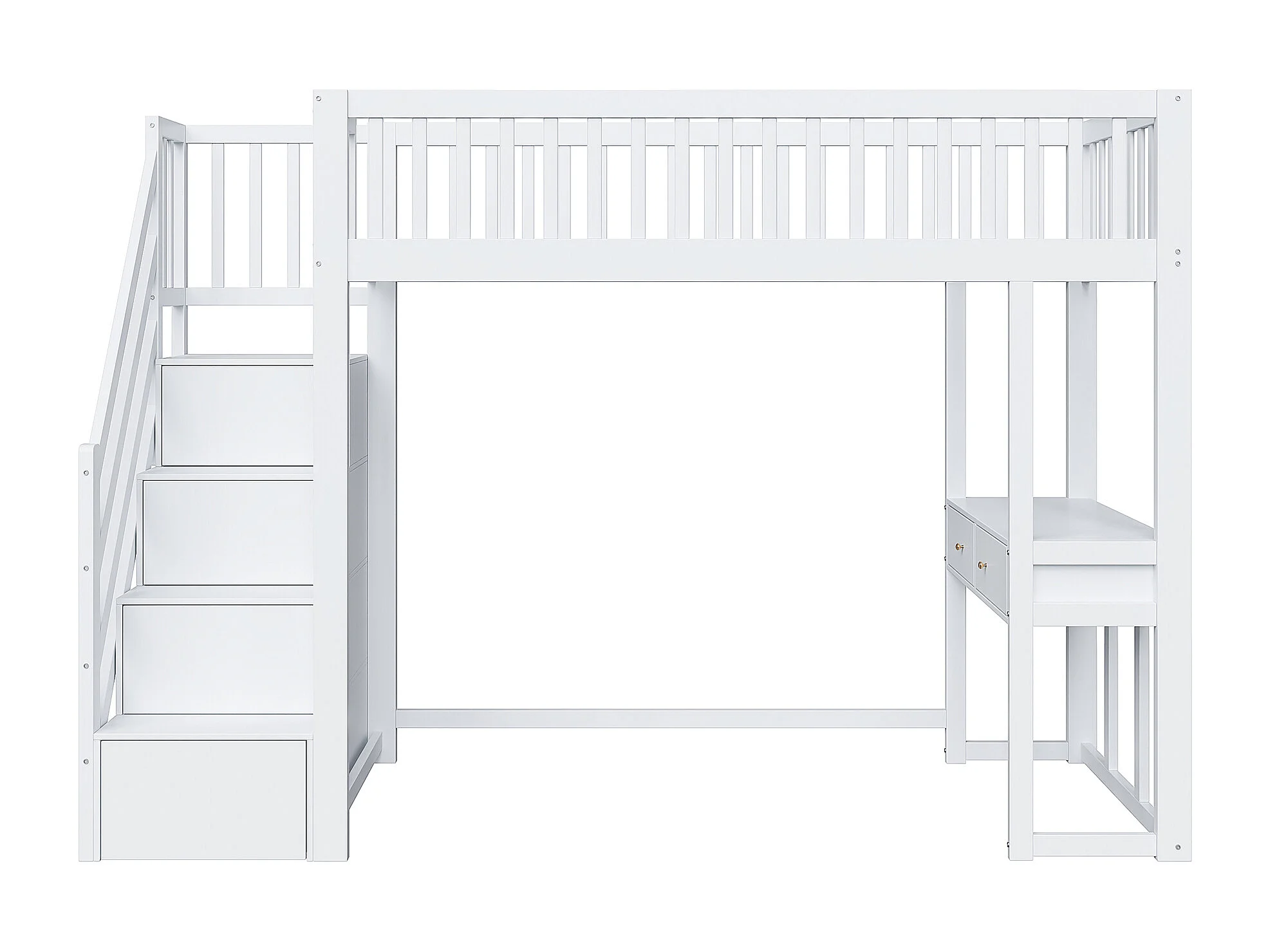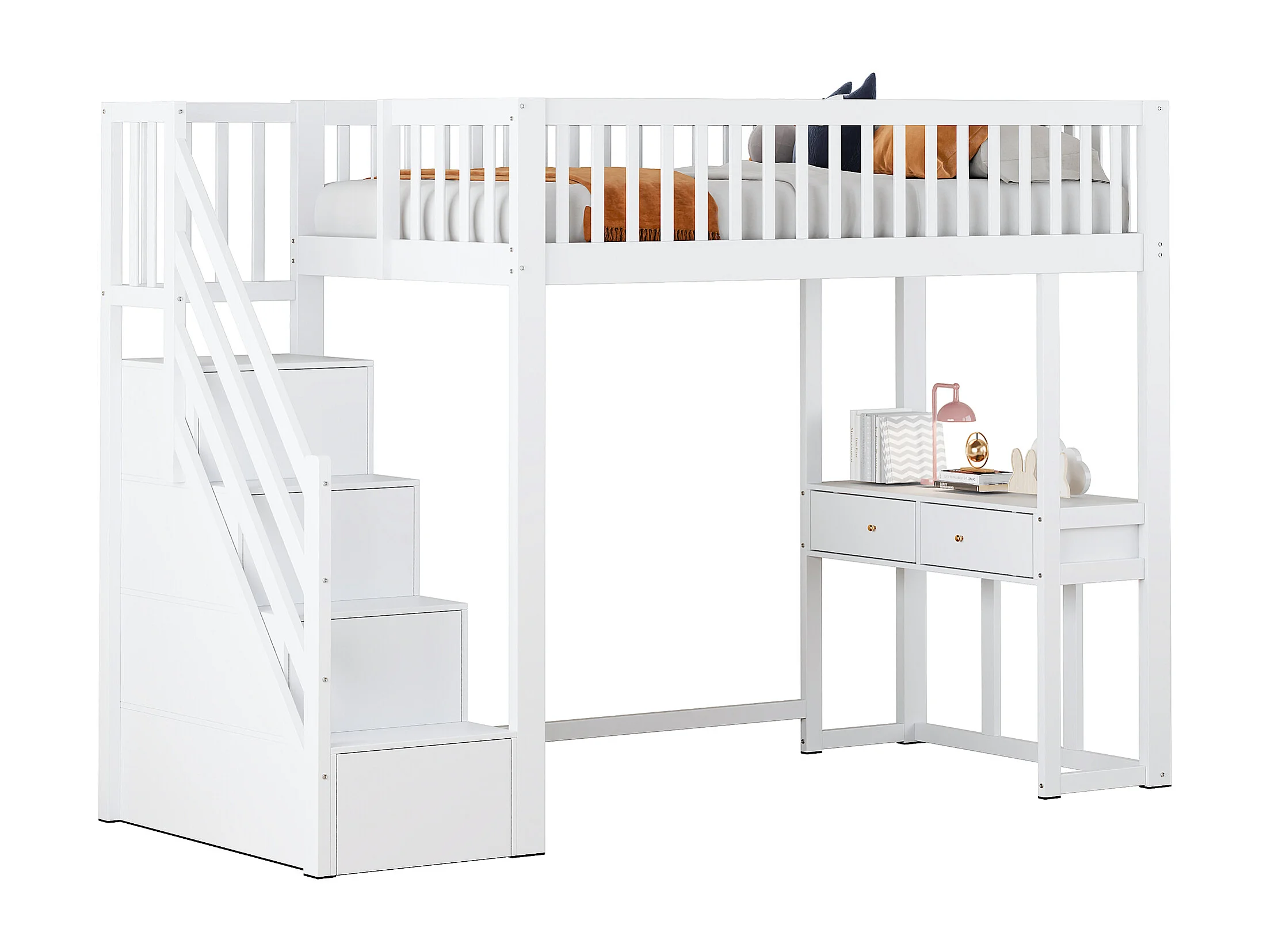90 x 200 cm großes Hochbett aus Holz – mit Tisch und Stauraumtreppe – Weiß