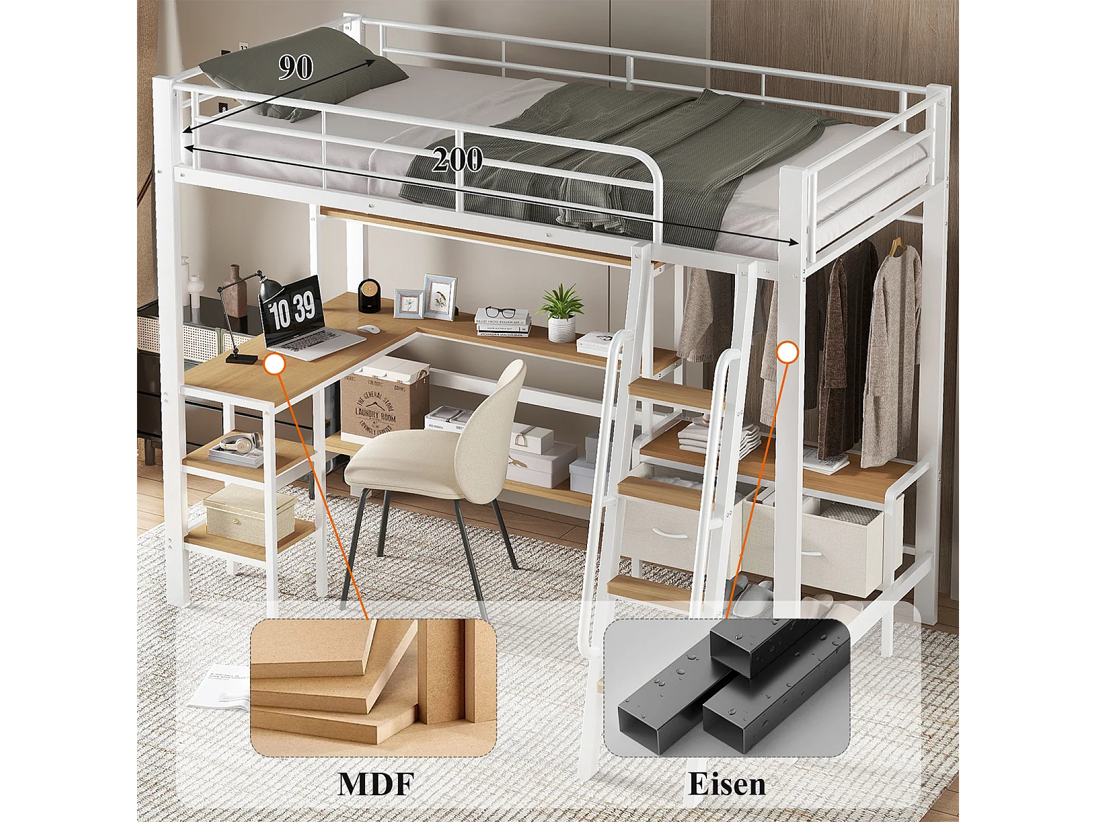 90 x 200 cm großes Metall-Hochbett mit 4-stufigem Regal, Schutzgitter und Eckkleiderschrank mit Kleiderstange – Metall und MDF, Weiß und Natur