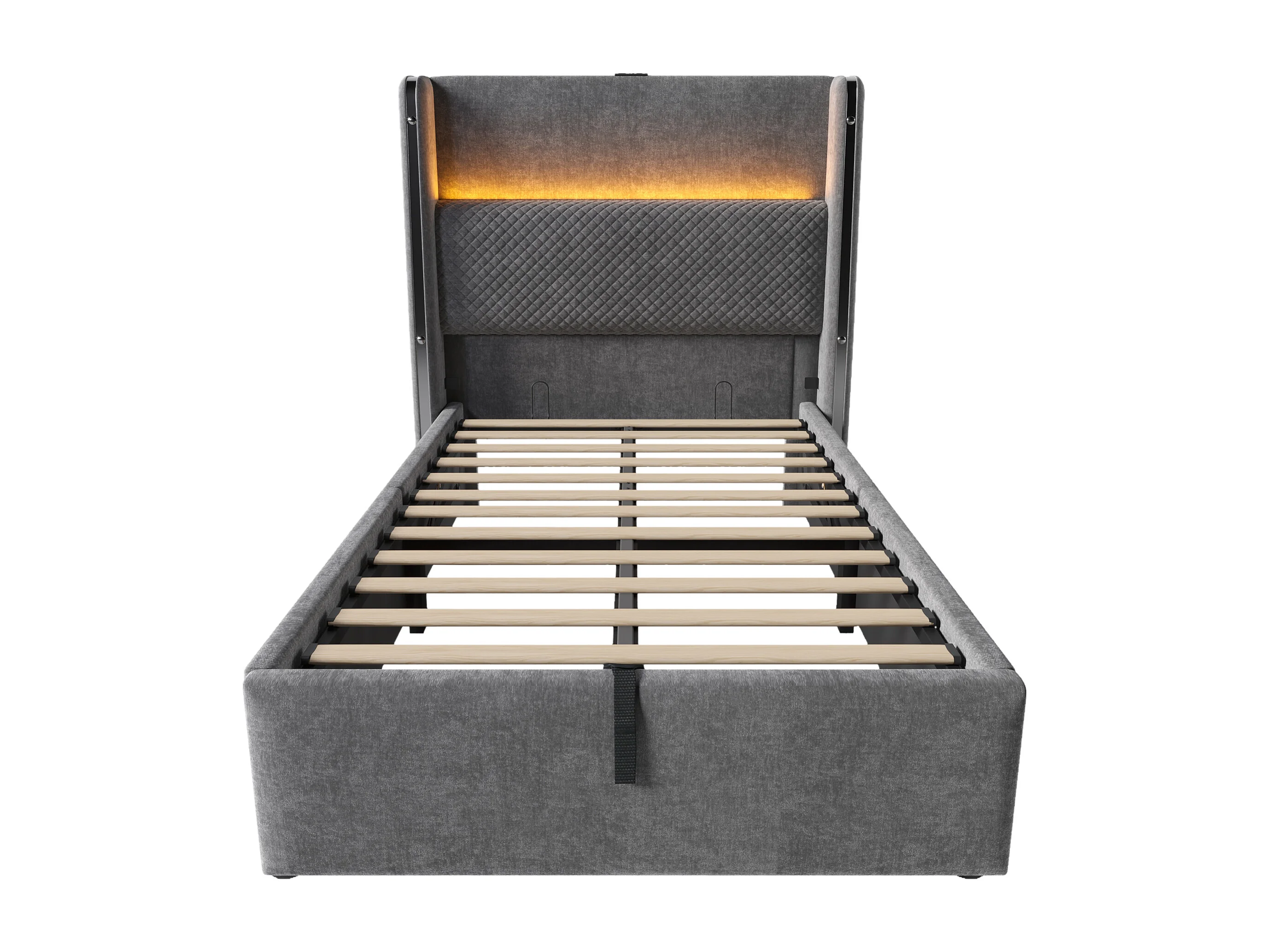 90 x 200 cm Stauraumbett – Einzelbett mit LED-Beleuchtung und USB-/Typ-C-Anschlüssen – graue Bettwäsche – Matratze inklusive